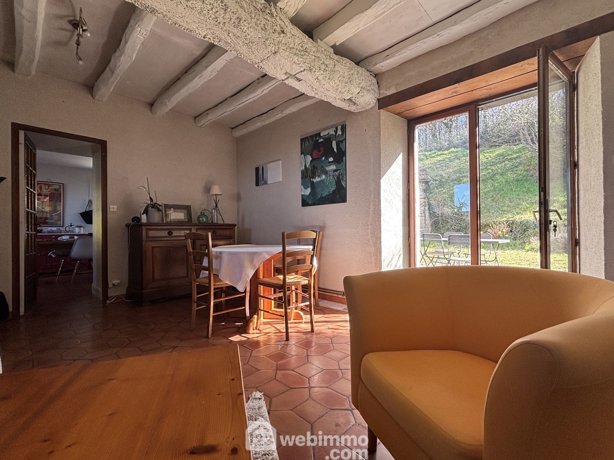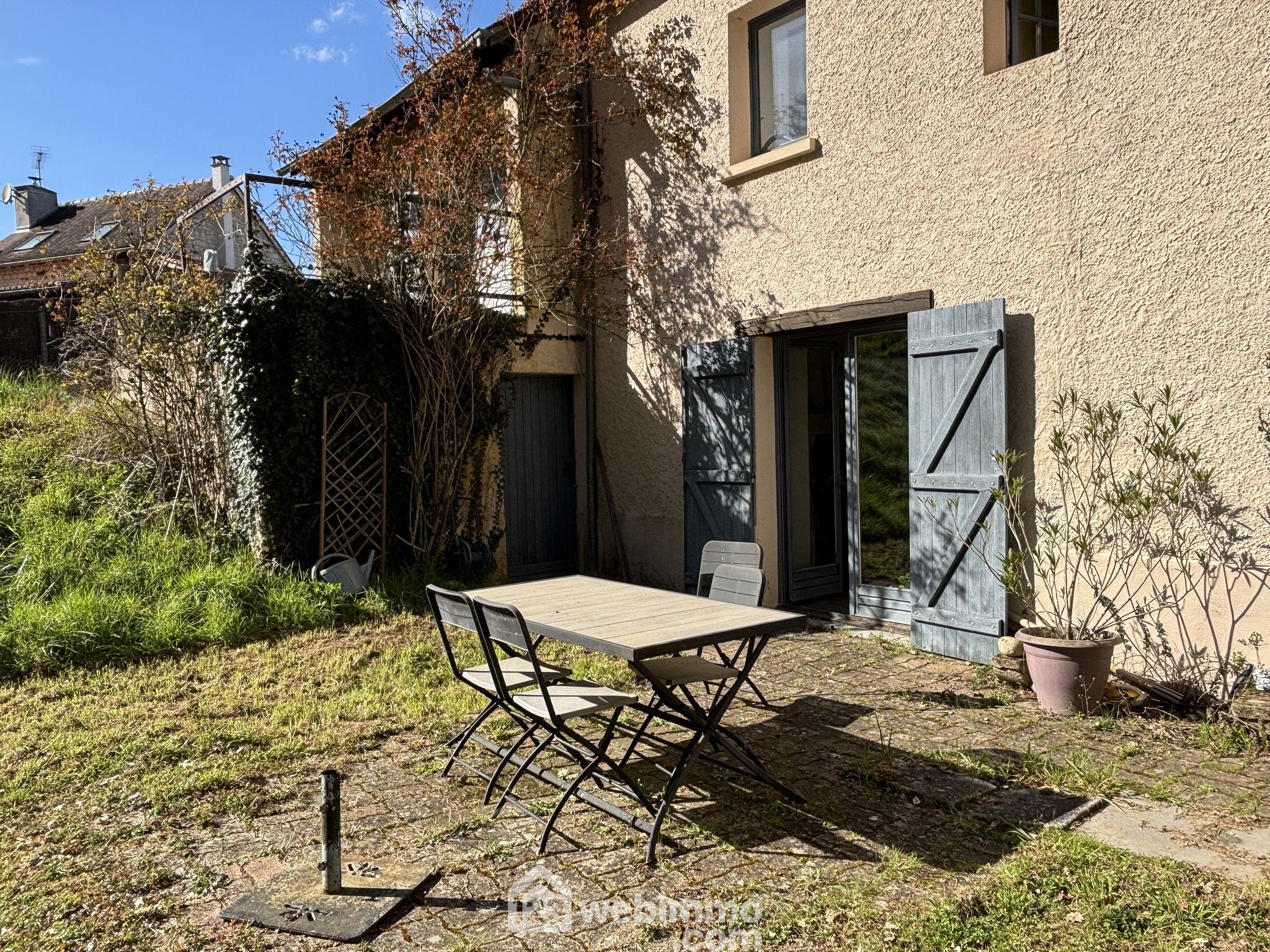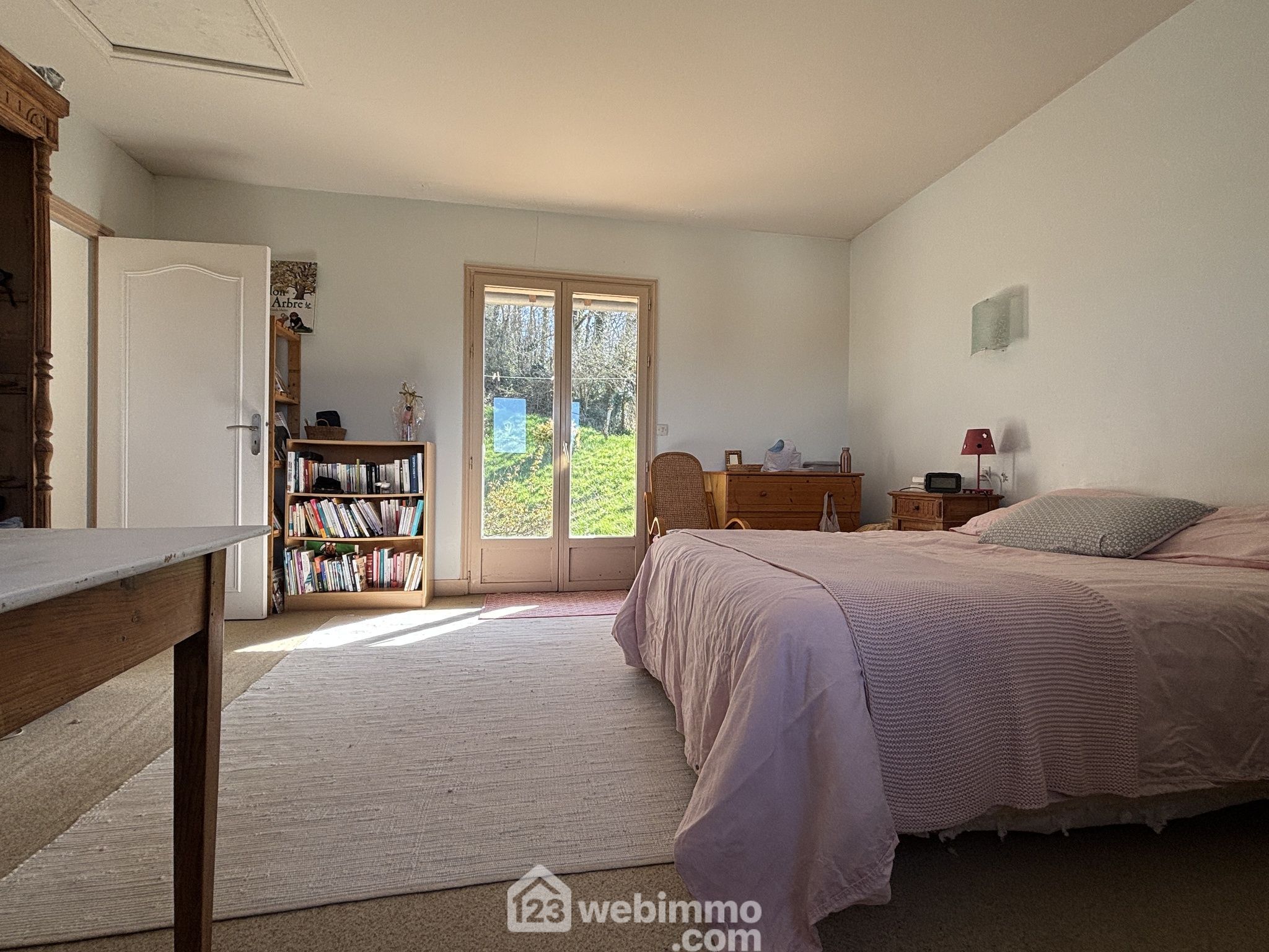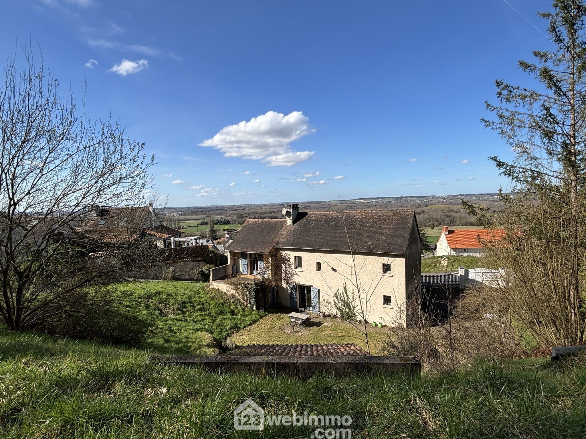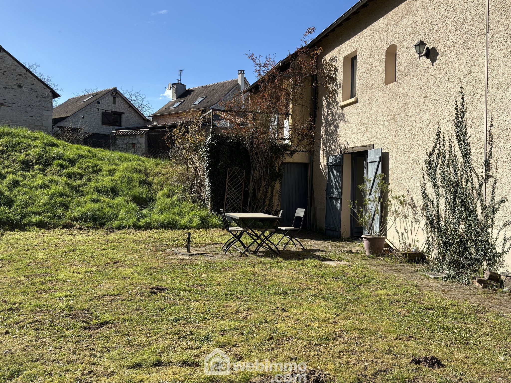 Maison en pierre avec extension des années 80, située dans un environnement verdoyant et calme.