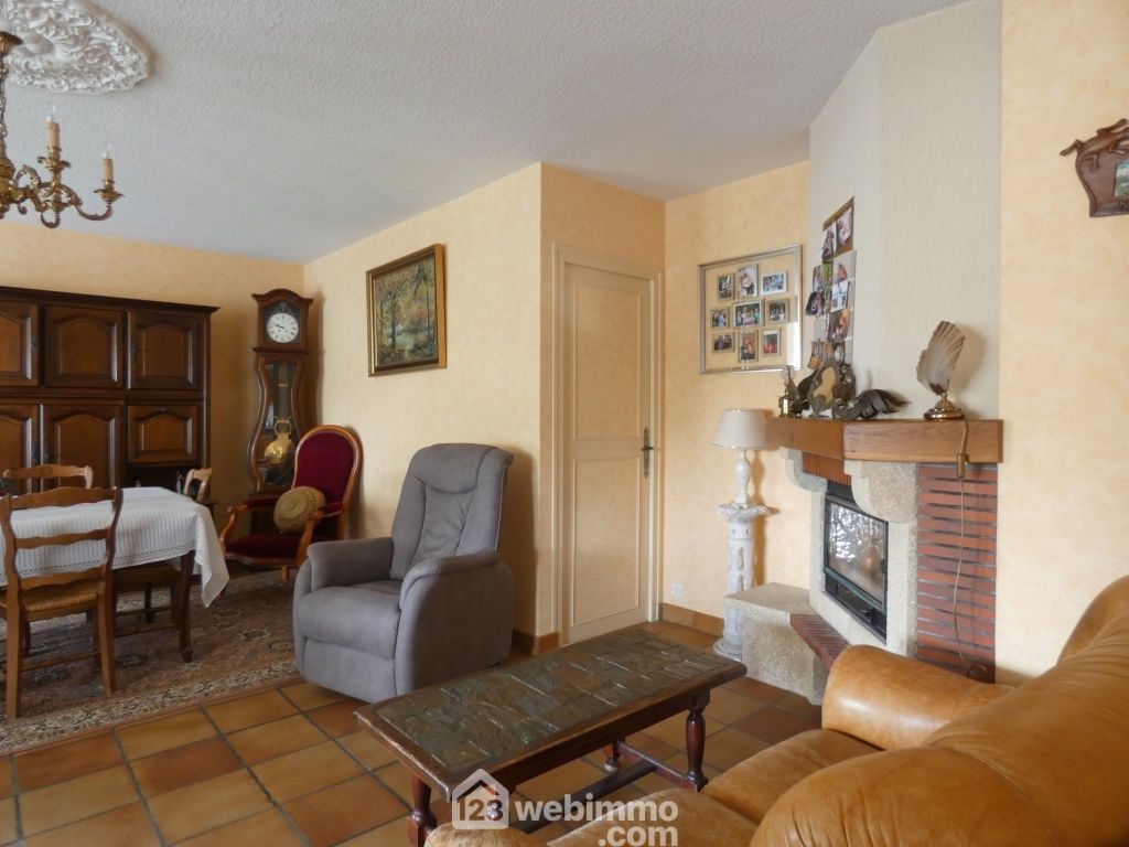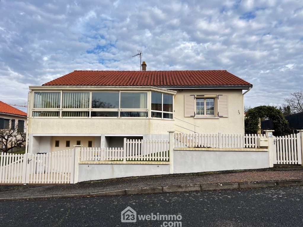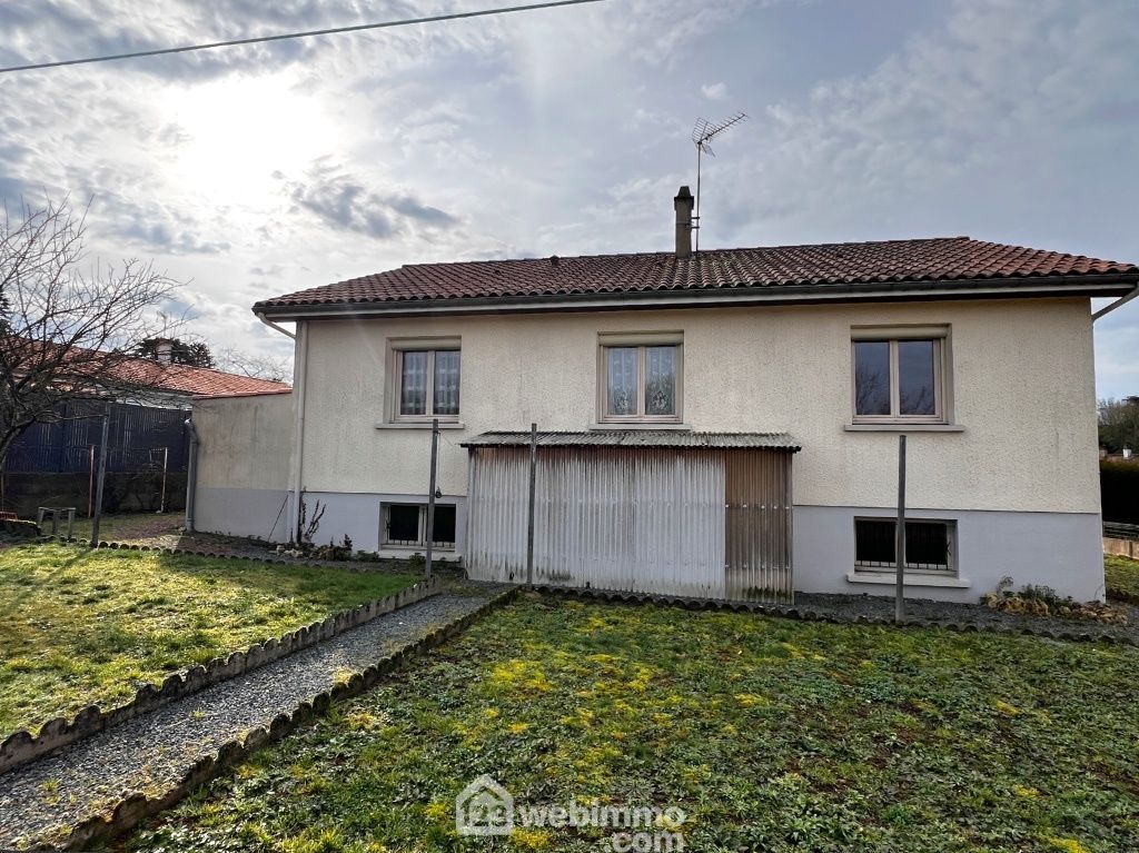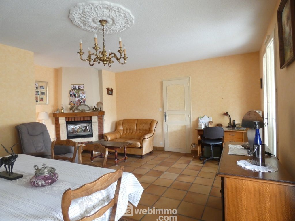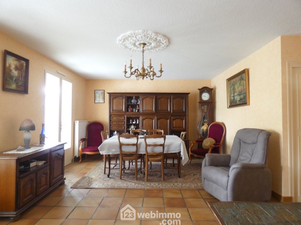 Maison avec vie de plain-pied, 107 m2 habitables, 5 pièces, 3 chambres, grand garage, sur un terrain clos de 551 m2.