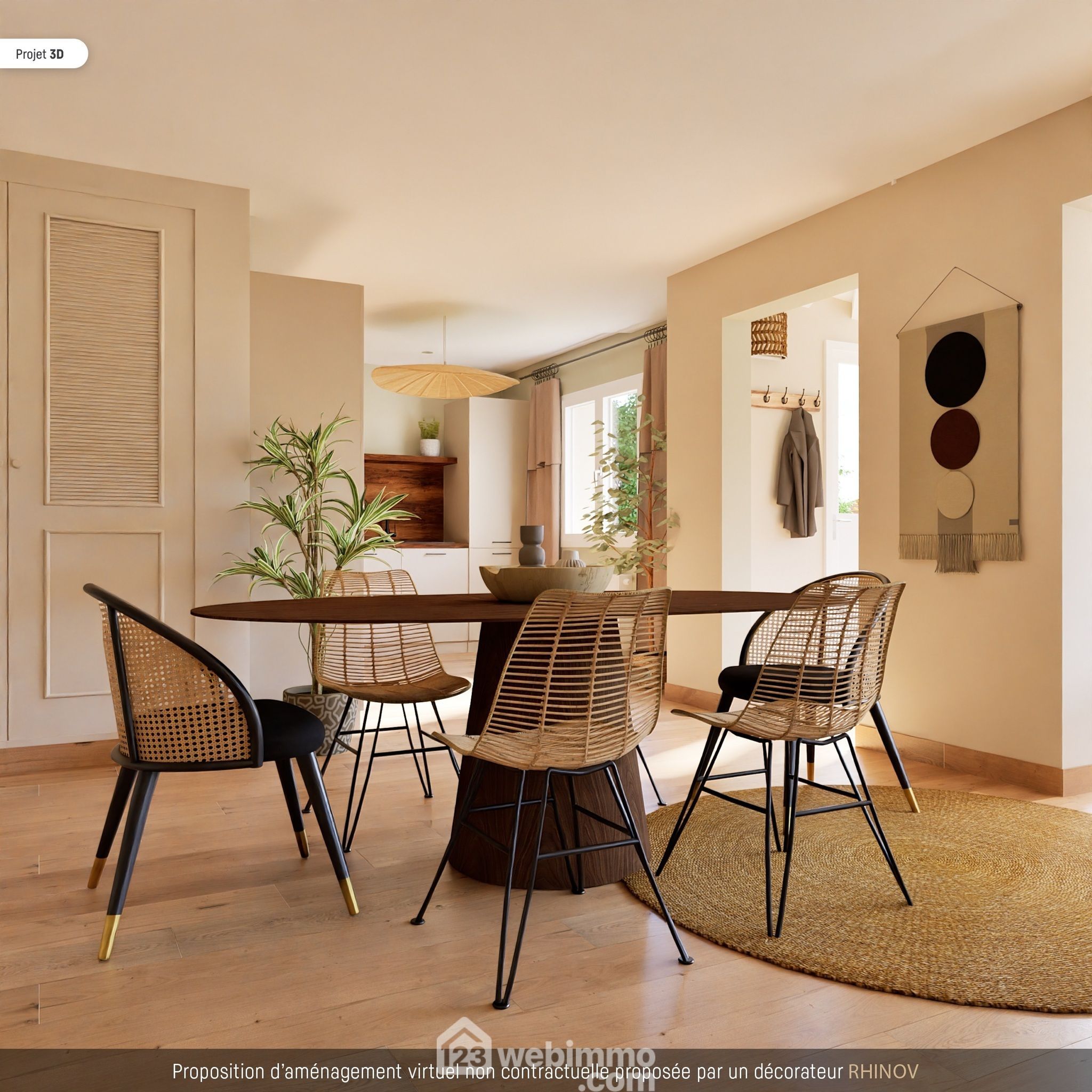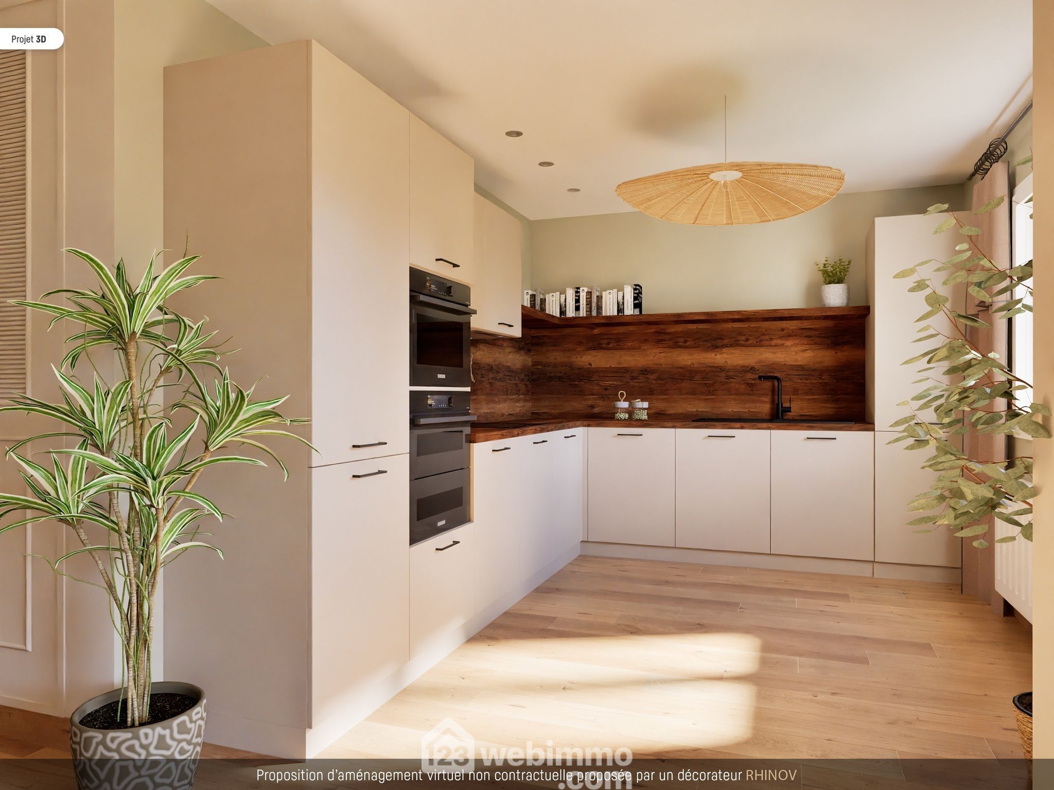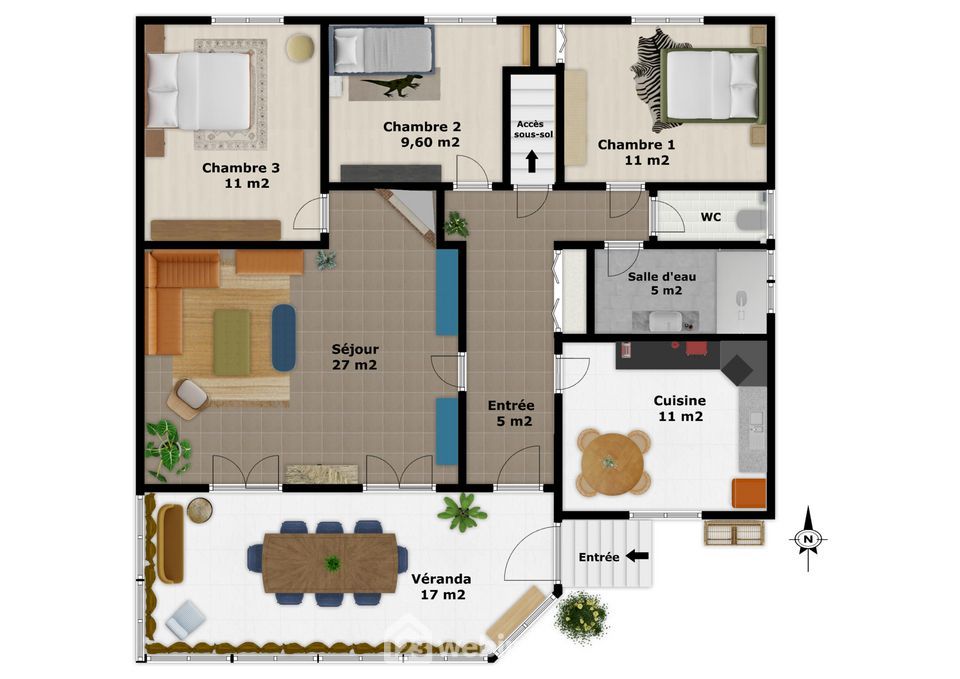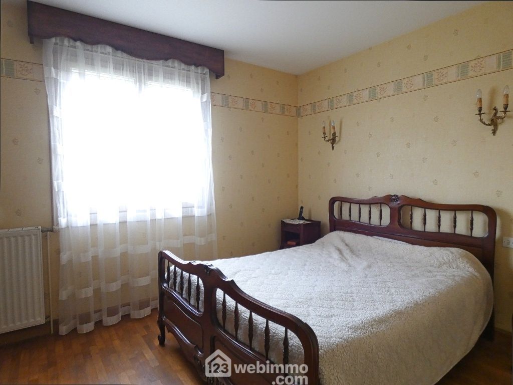 Maison avec vie de plain-pied, 107 m2 habitables, 5 pièces, 3 chambres, grand garage, sur un terrain clos de 551 m2.