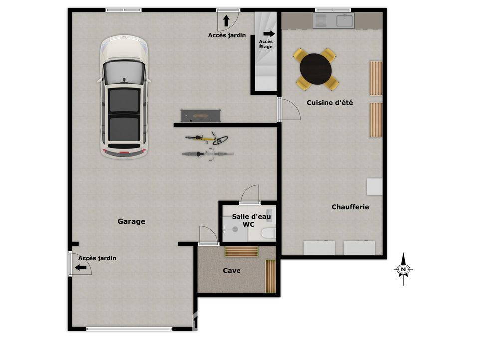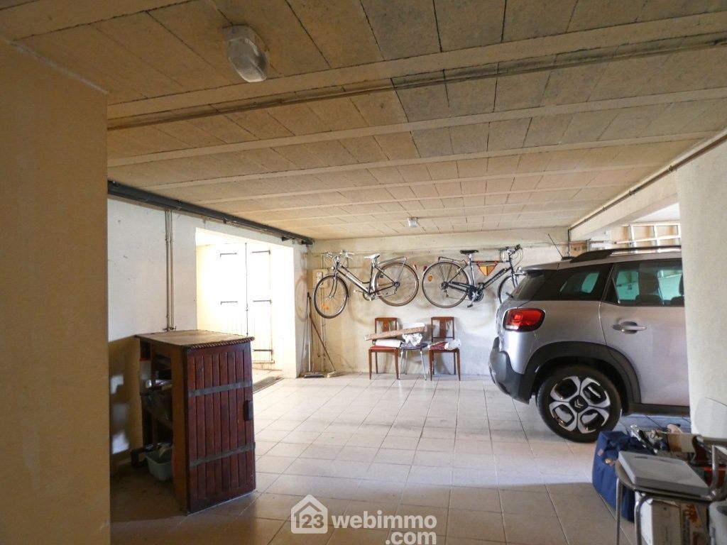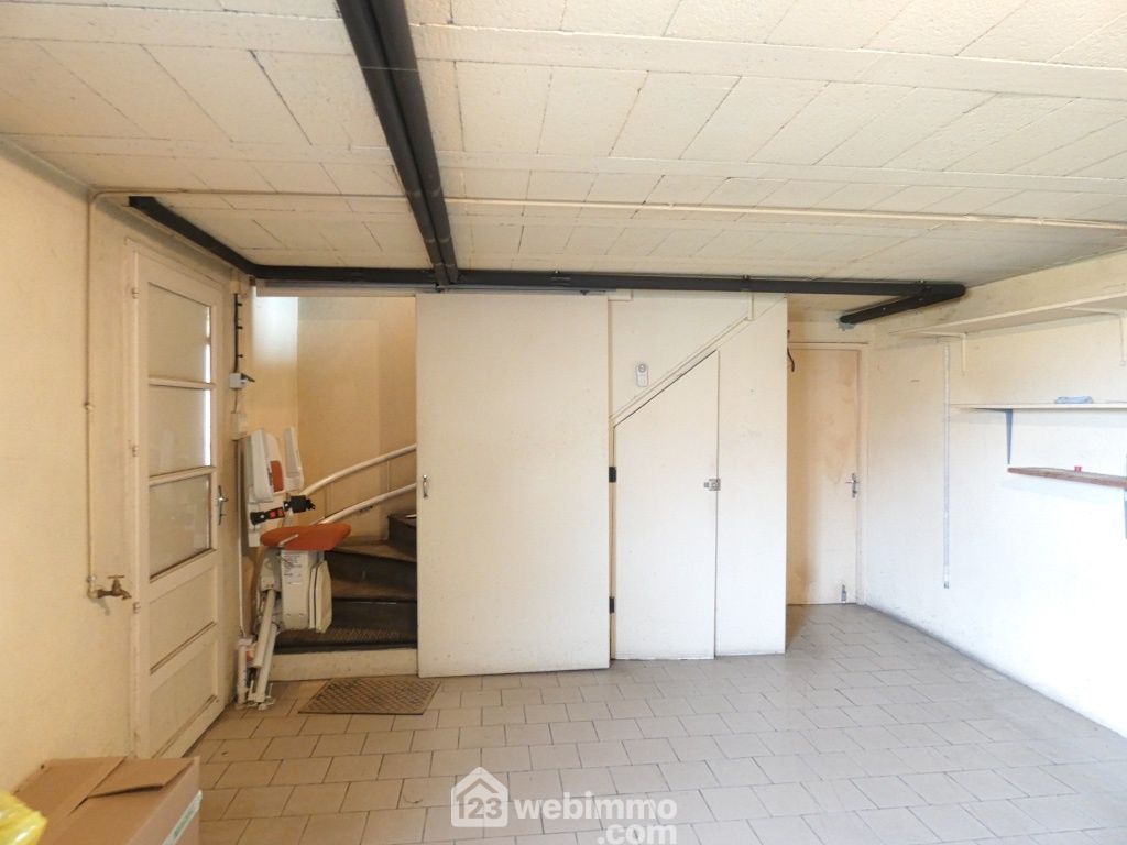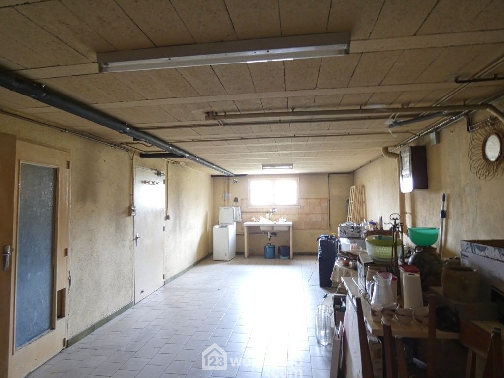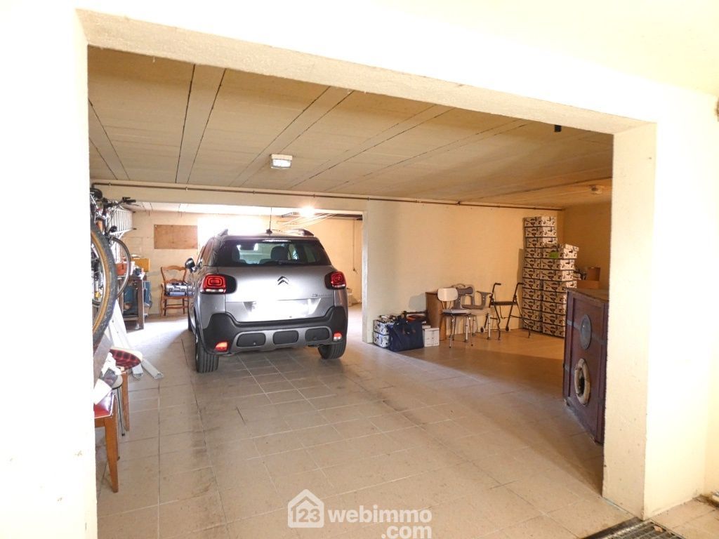 Au sous-sol, grand garage de 61 m2, cuisine d'été avec chaufferie (32 m2), salle d'eau avec WC à rafraîchir et cave.