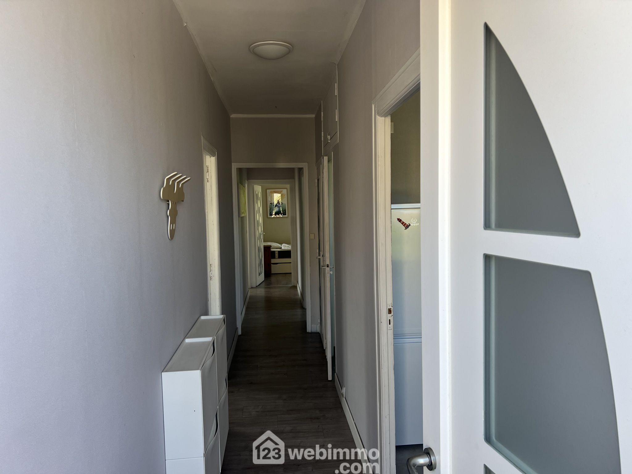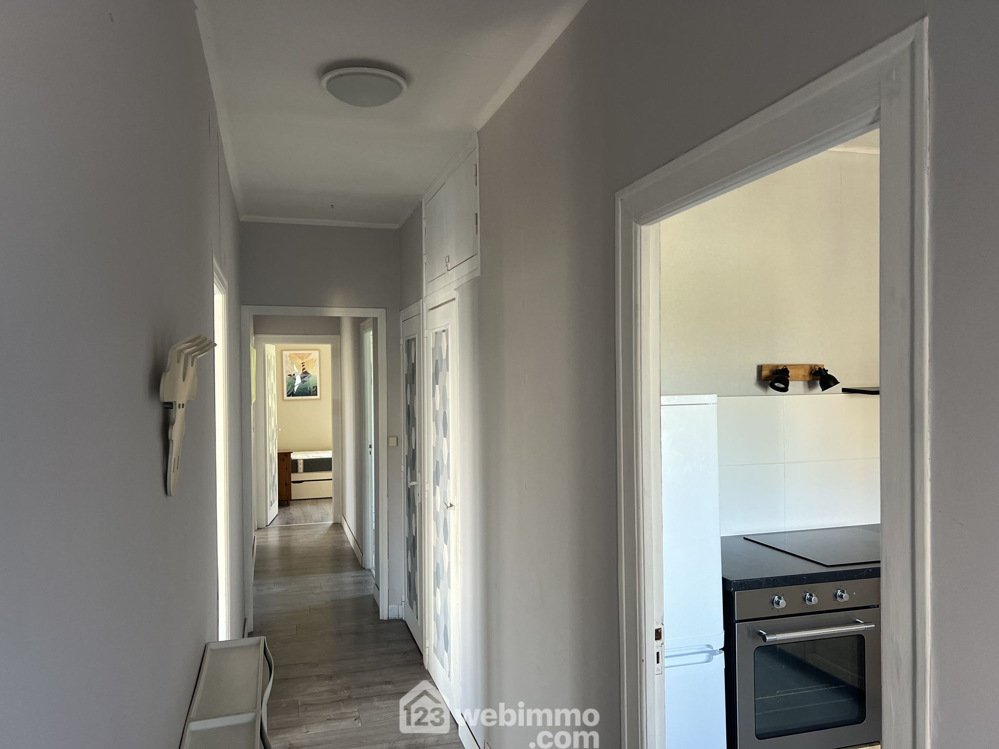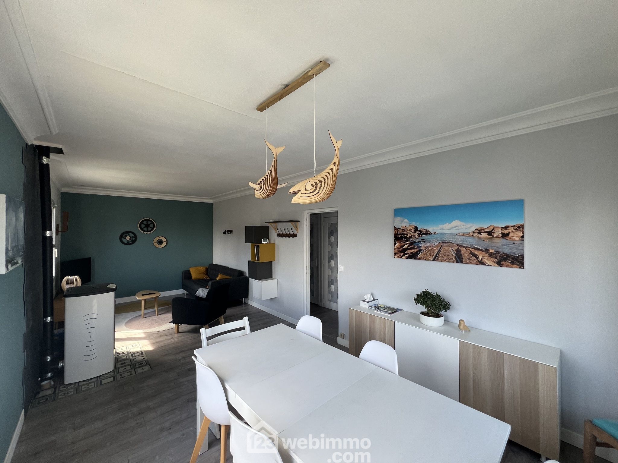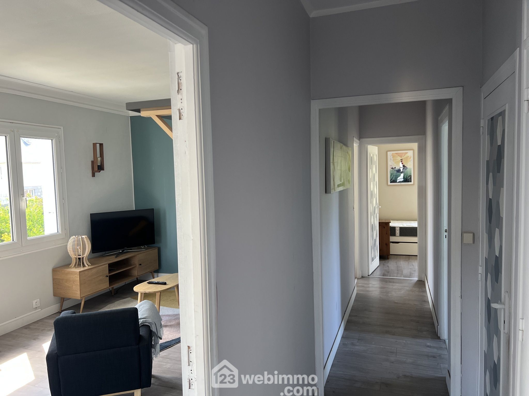 A l'étage 74m2, Un espace principal lumineux : séjour, salon, cuisine équipée, 3 chambres, salle de bain, WC indépendant