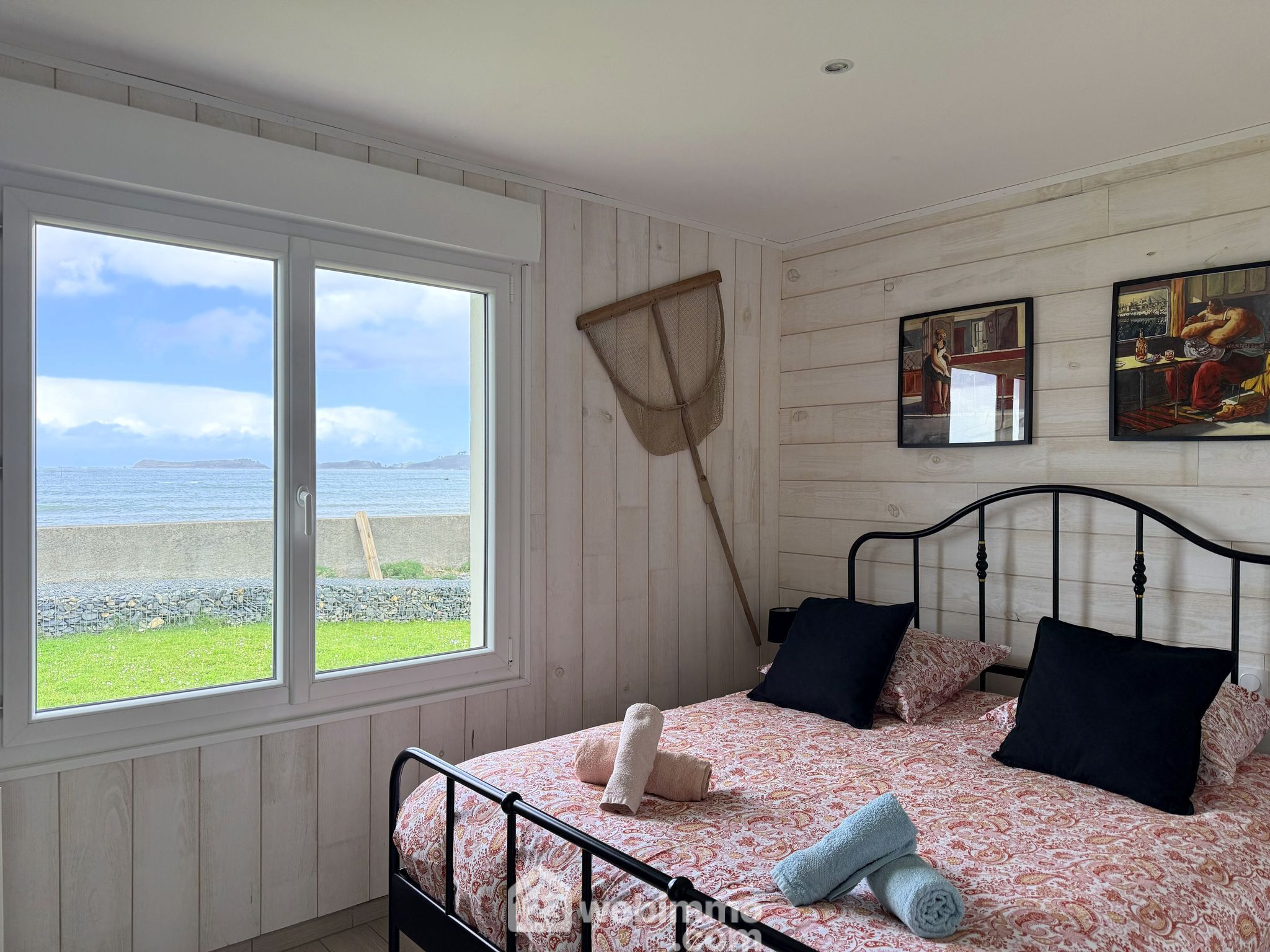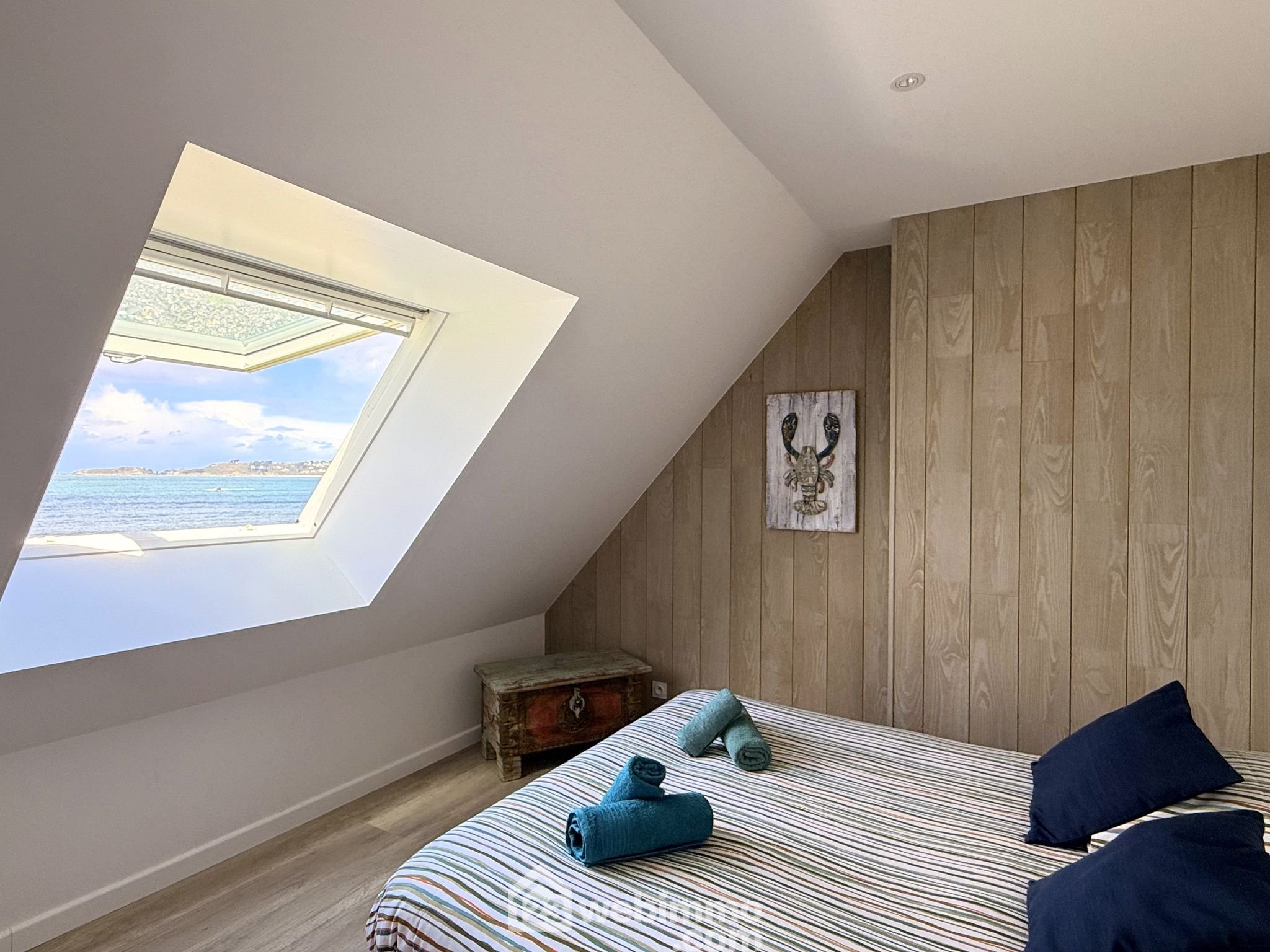 À l’étage, le palier/mezzanine offre un second espace de contemplation de la mer dont le tableau change à chaque instant. Il dessert deux chambres supplémentaires, elles aussi tournées vers la mer, ainsi qu’une seconde salle de douche et un WC séparé.