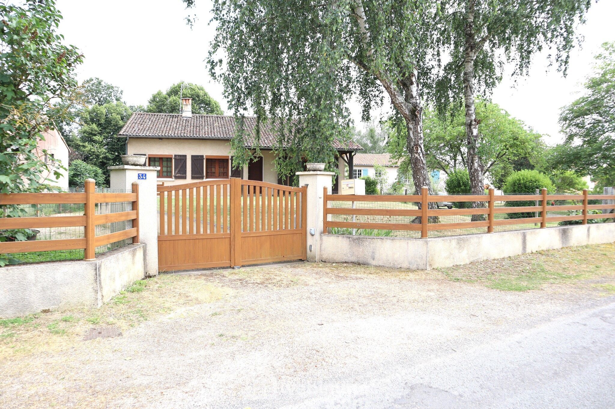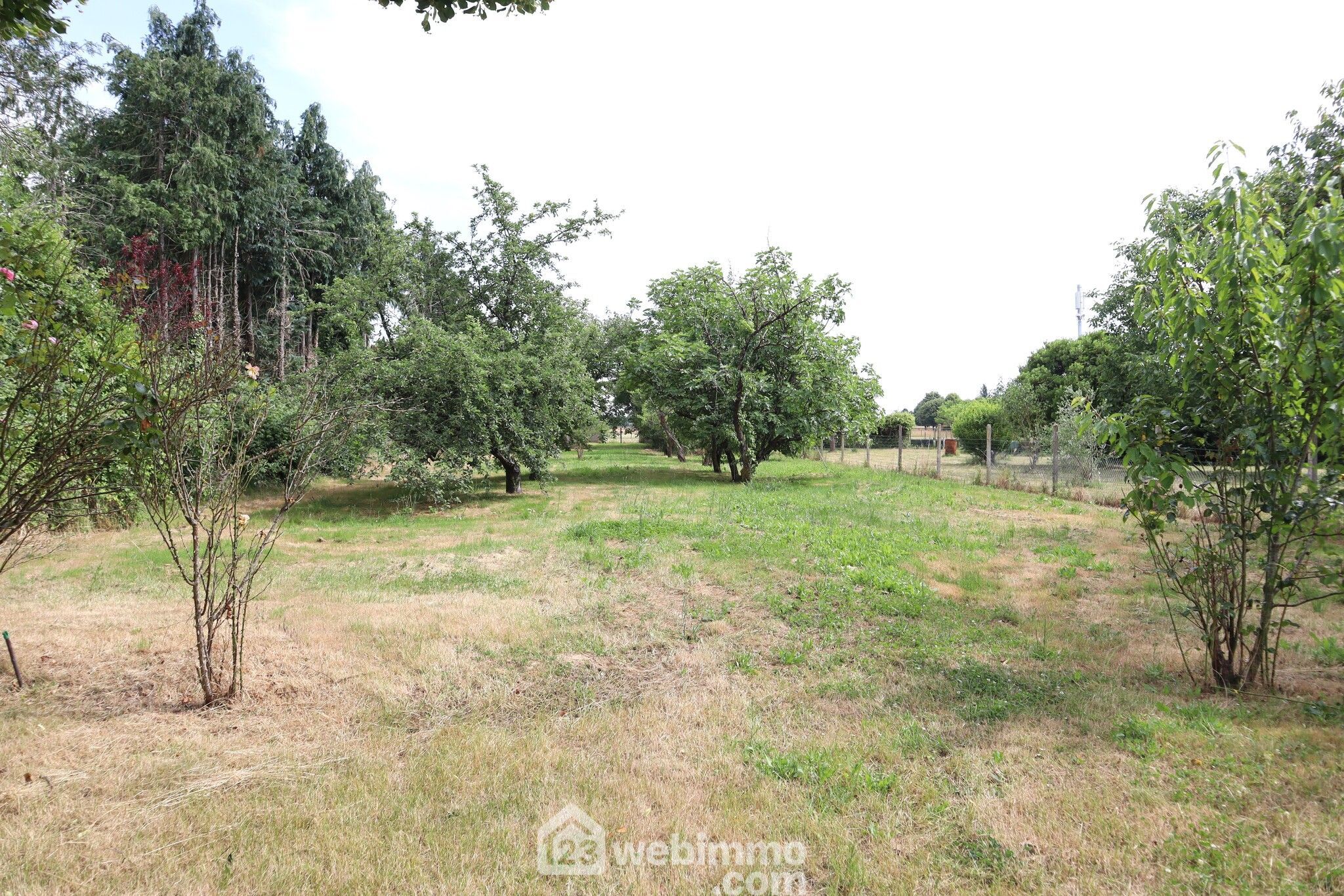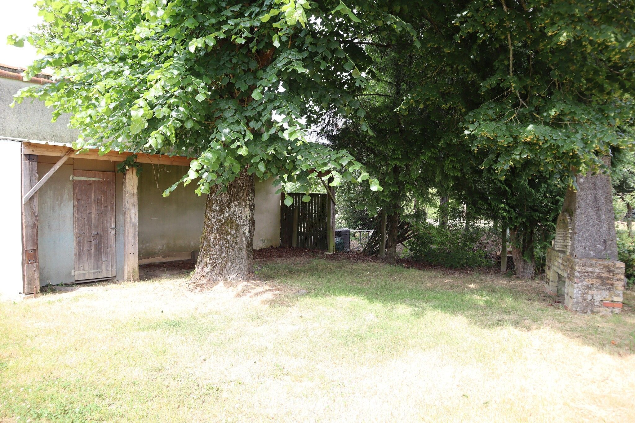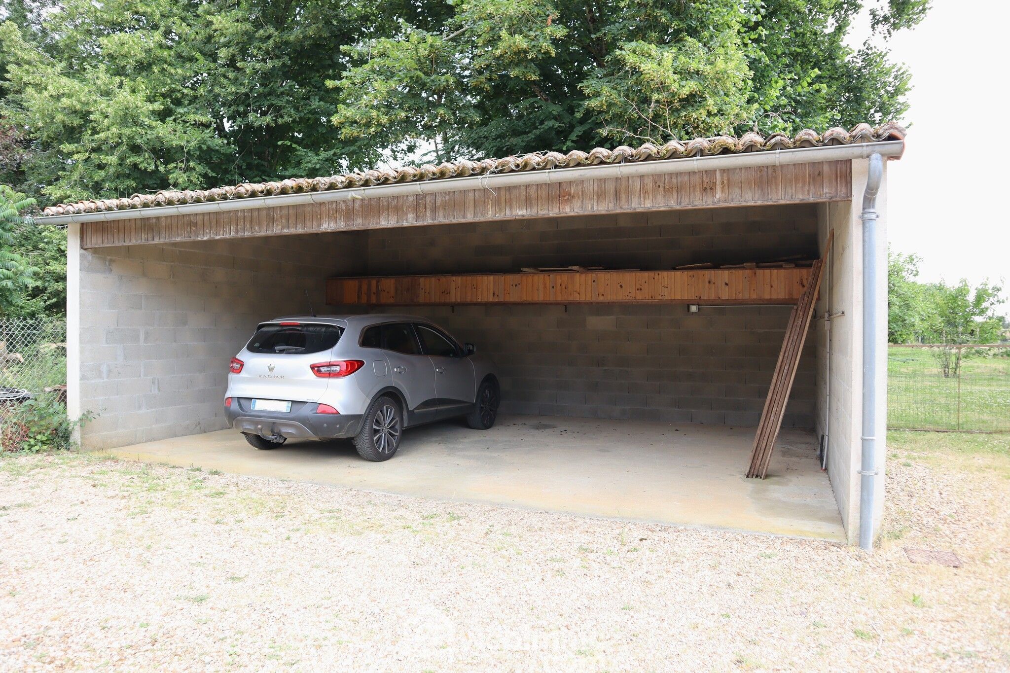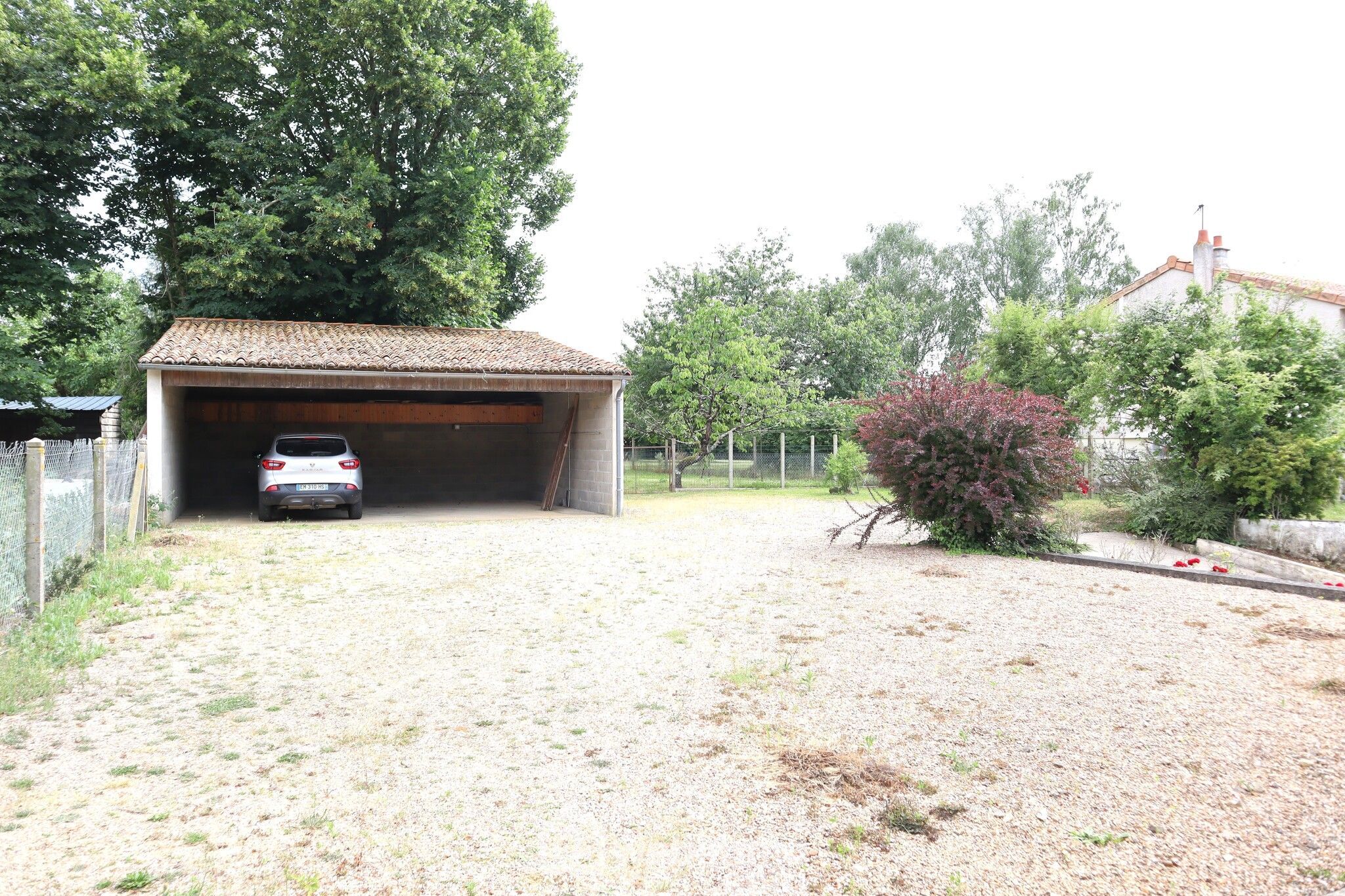 Beau terrain plat avec vaste zone de stationnement, grand carport, second garage avec accès indépendant, poulailler, barbecue et verger.