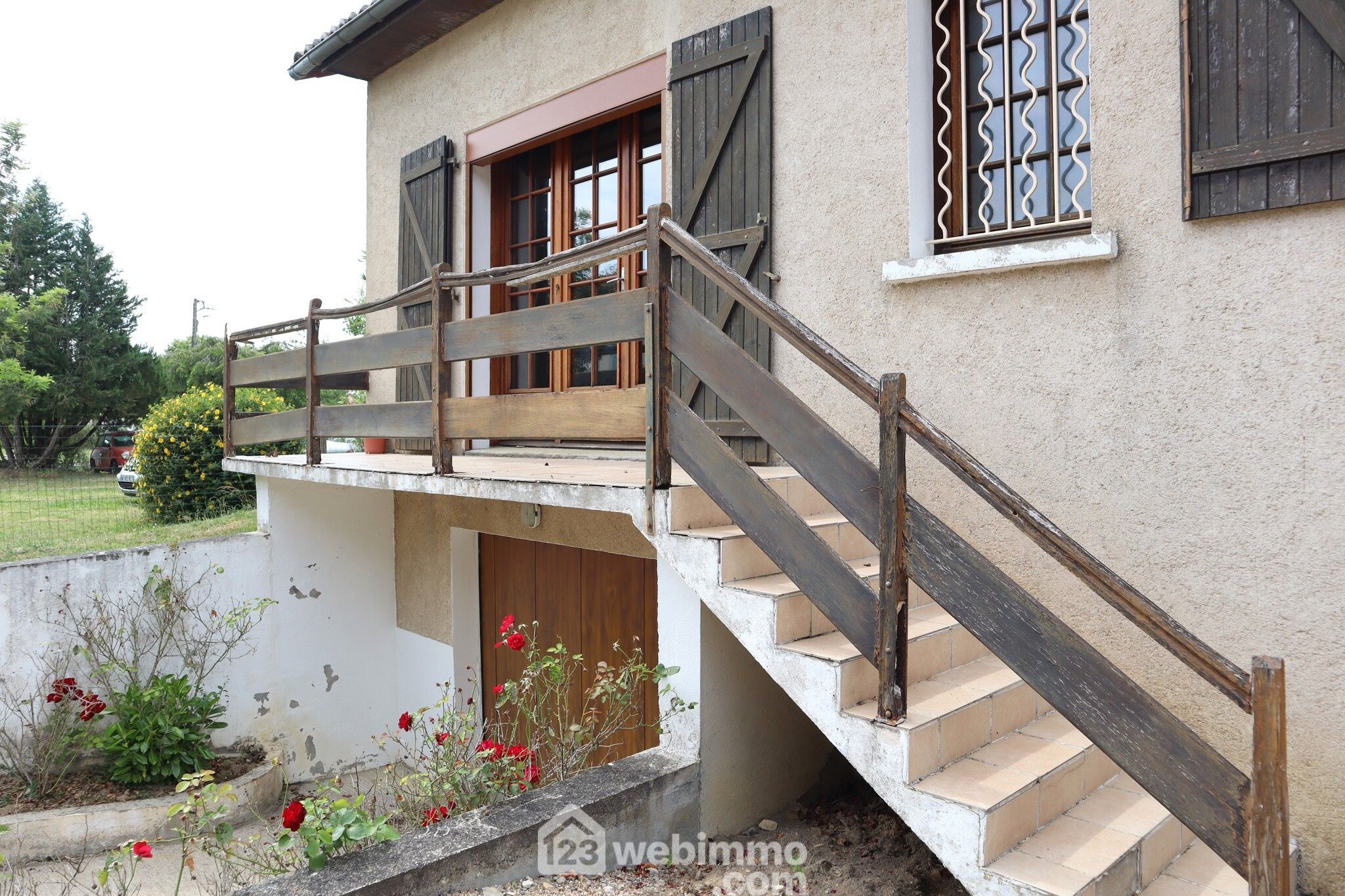 Maison de 1978 comprenant au rez-de-chaussée surélevé : entrée, séjour traversant avec cheminée, terrasse et balcon, cuisine aménagée, dégagement avec placards, cagibi-buanderie, 2 chambres avec placard, salle de bain avec douche et WC indépendant avec placard.