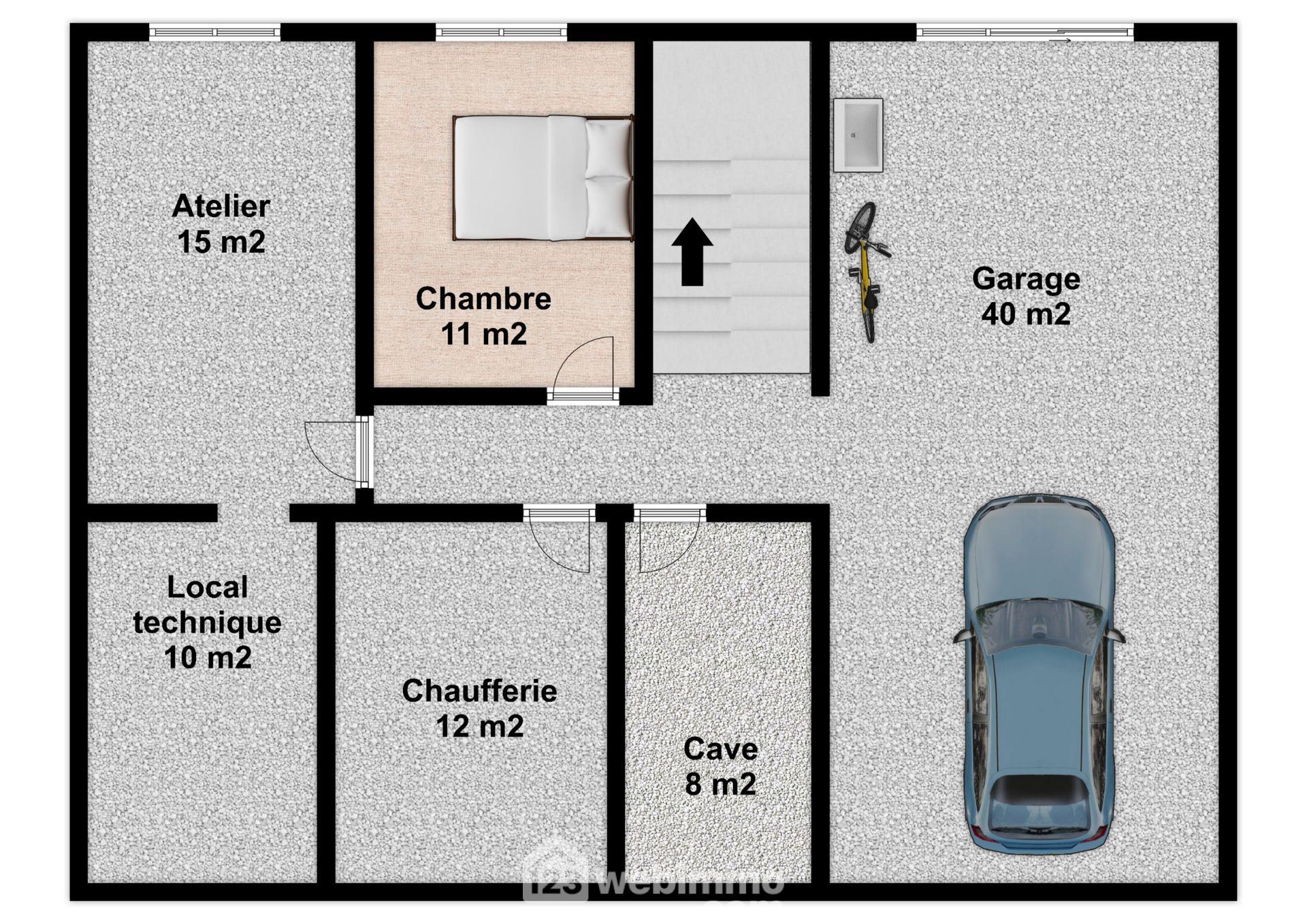 Au sous-sol : garage, dégagement, 1 chambre, atelier, local technique, chaufferie et cave.