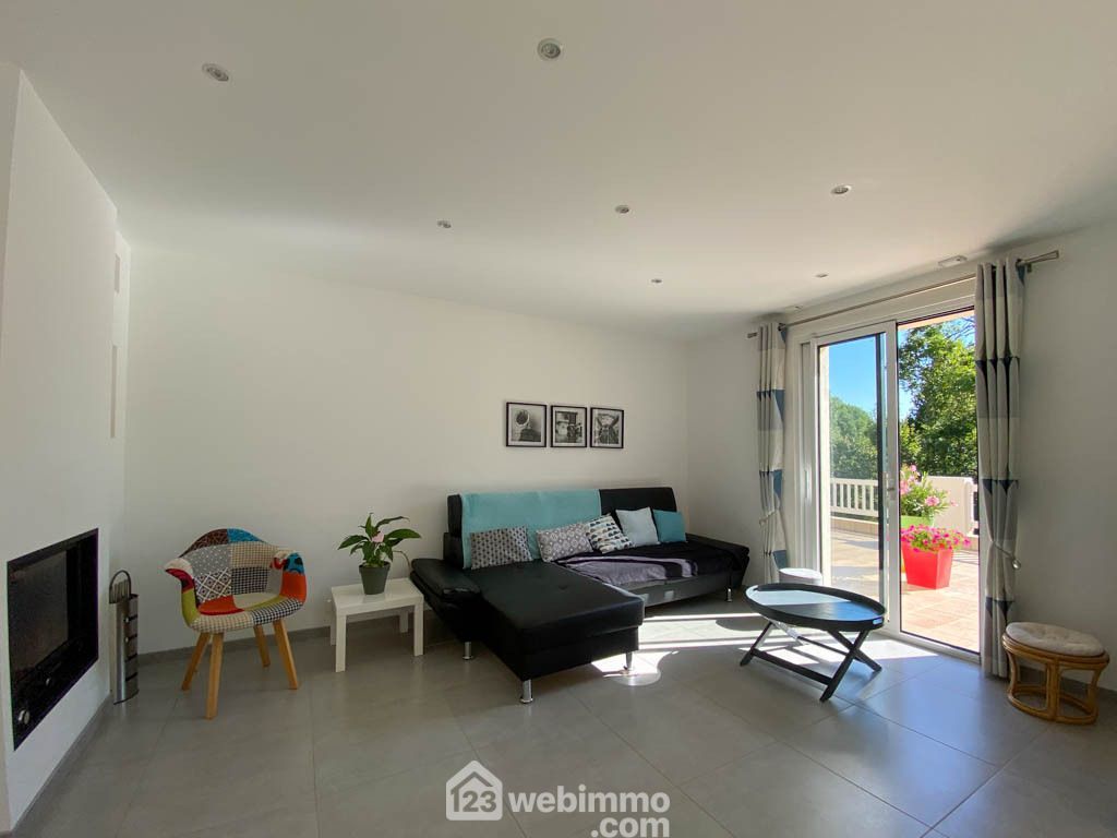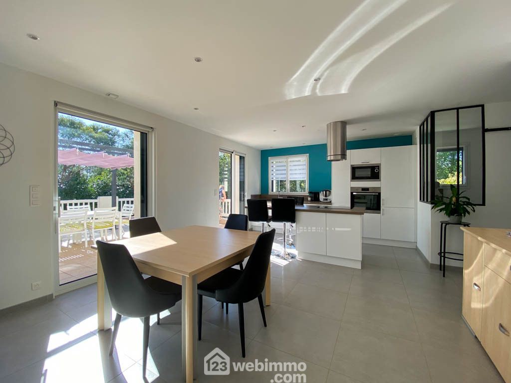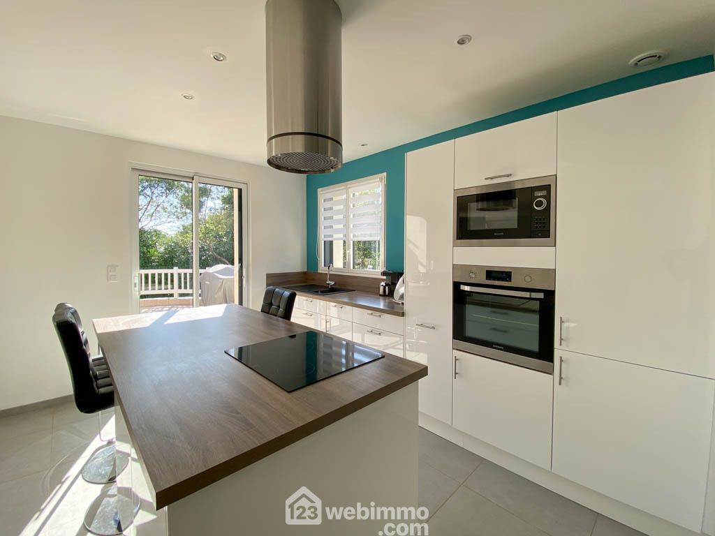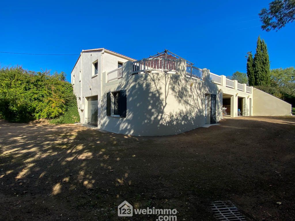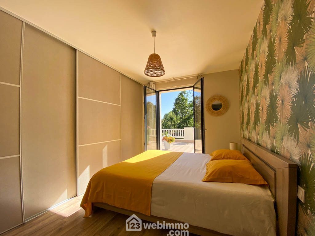 L’accès à la maison se fait par une entrée de plain-pied desservant une première chambre avec SDE, un bureau et une magnifique pièce de vie de 45 m². Celle-ci comprend : une cuisine moderne aménagée et équipée avec ilot central, un espace salle à manger et un salon avec cheminée insert. L'ensemble est baigné de lumière grâce une exposition plein sud et de très larges baies. Ces dernières ouvrent sur une immense terrasse panoramique en L avec vue sur le jardin sans aucun vis à vis. L’espace nuit propose, des WC séparés avec lave-mains, 3 chambres toutes équipées de placards, une SDB de 7 m² environ. Au sous-sol, une buanderie carrelée de 21 m², un garage avec portail motorisé pouvant accueillir un fourgon, une cave, une pièce supplémentaire de 23 m² et un préau de 39 m² environ.