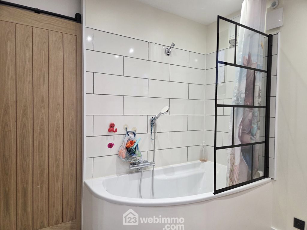 Au rez-de-chaussée, on retrouve une grande entrée, un coin nuit composé de deux chambres de 11m² environ avec des placards intégrés, et une salle de bain spacieuse avec un espace buanderie très bien agencé.