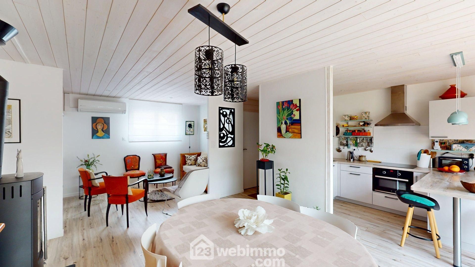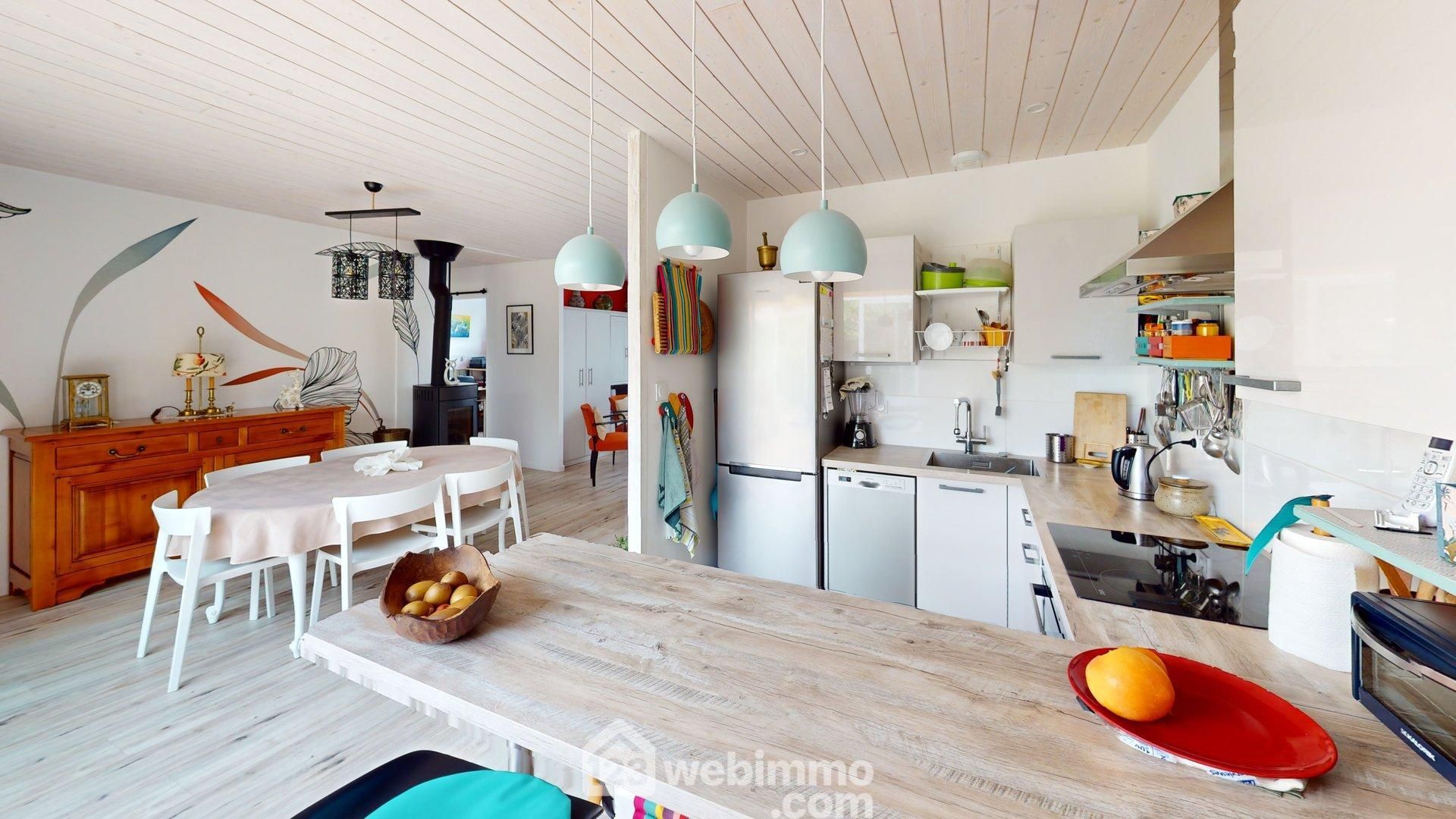Avec ses 110 m² répartis sur deux niveaux, la maison s’ouvre sur une entrée accueillante menant à une pièce de vie lumineuse de près de 40 m², avec son espace salon cocooning et sa cuisine américaine aménagée et équipée s’intégrant harmonieusement à l’ensemble. Un poêle à bois vient parfaire l’atmosphère conviviale.