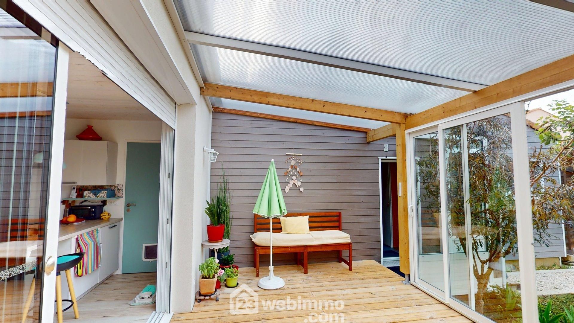 La grande baie vitrée s’ouvre sur une vaste terrasse en bois couverte et fermée par des baies vitrées, offrant une vue apaisante sur le potager et les arbres fruitiers.