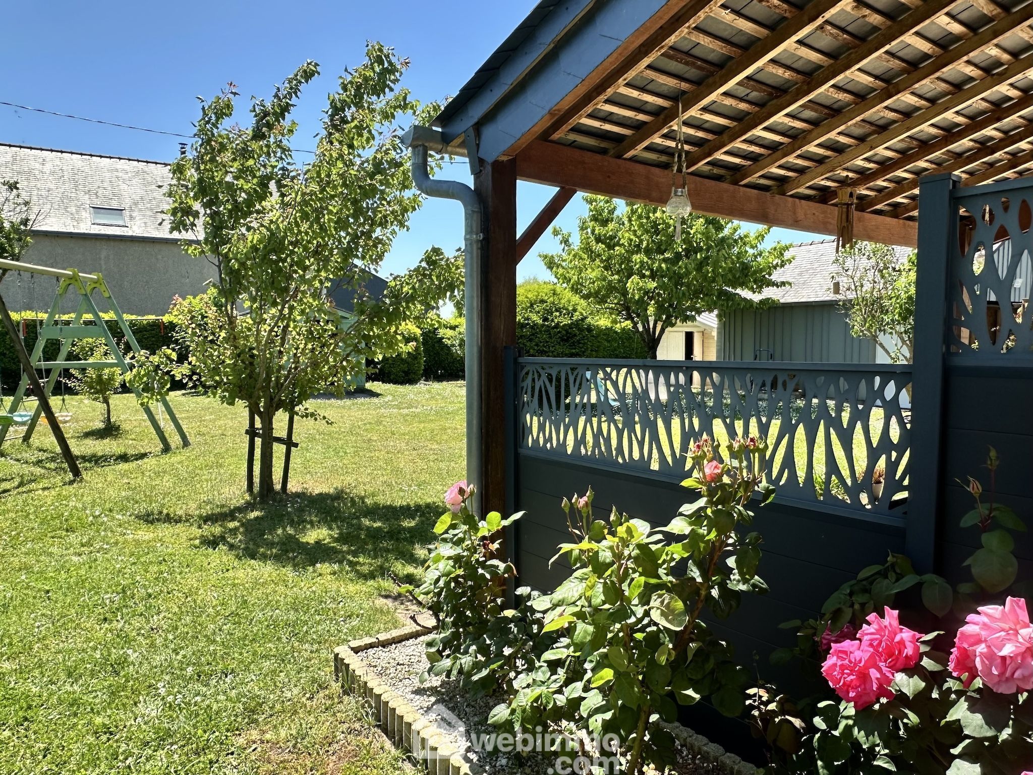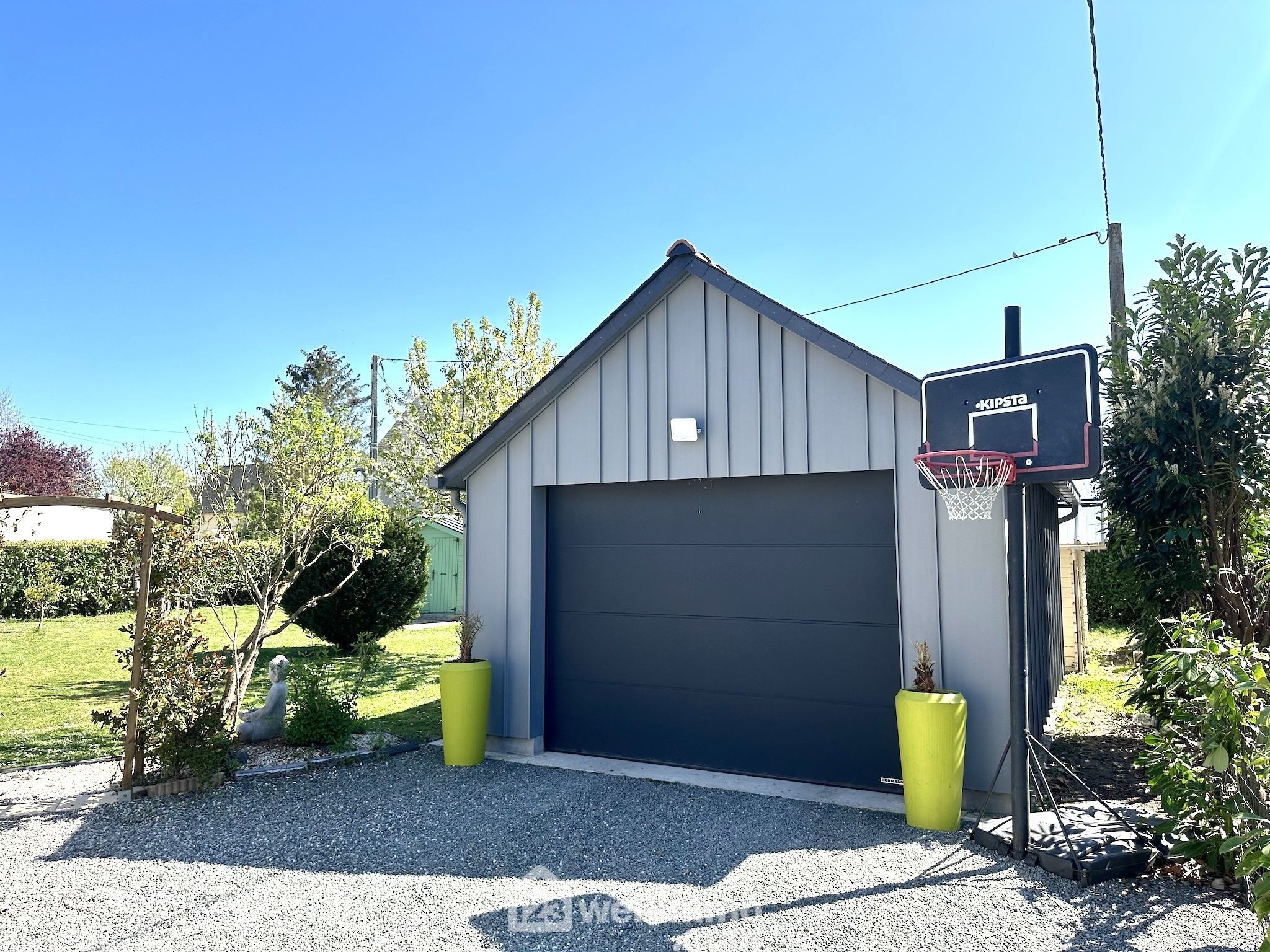 À l'extérieur, le jardin est arboré, paysagé et entièrement clos.