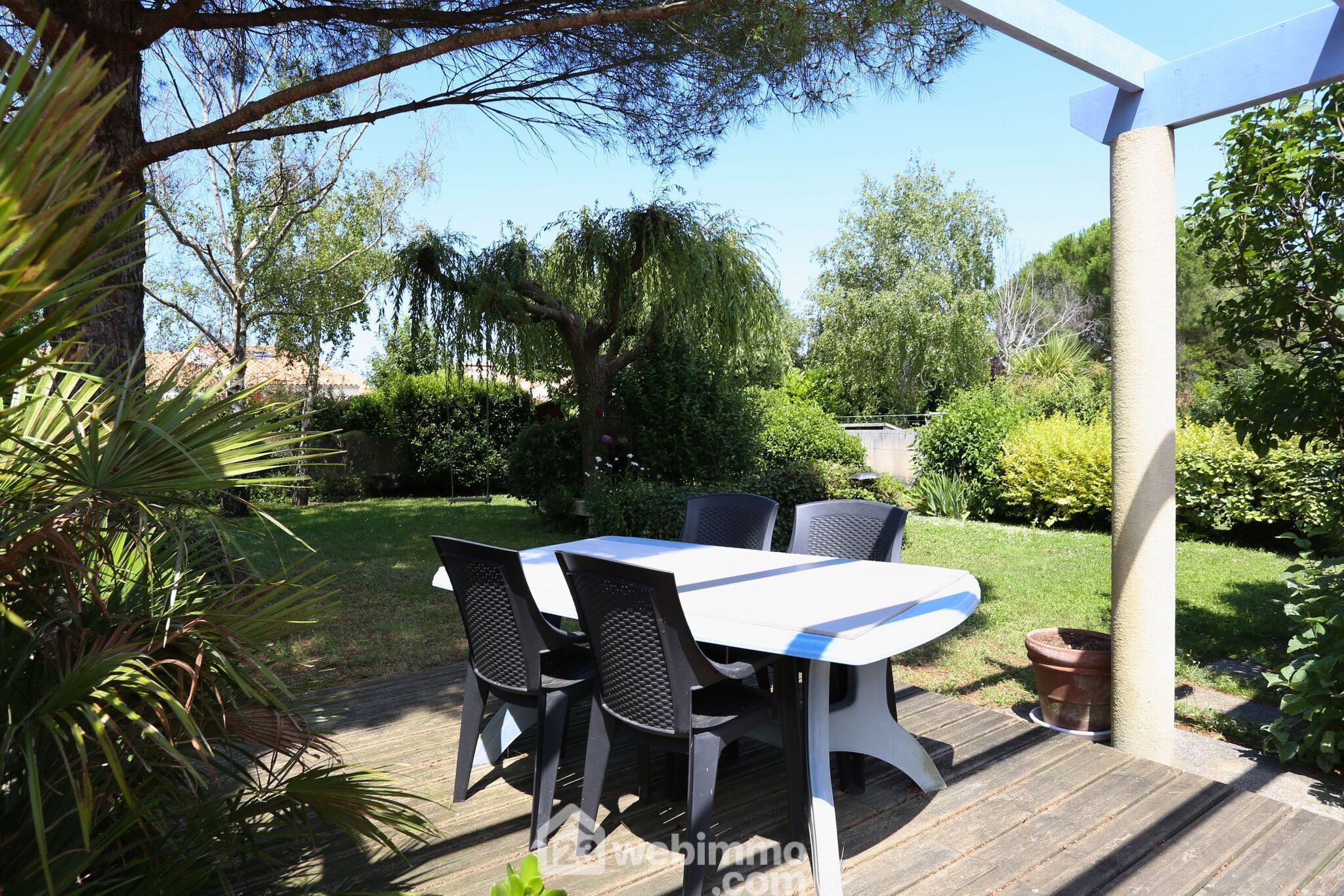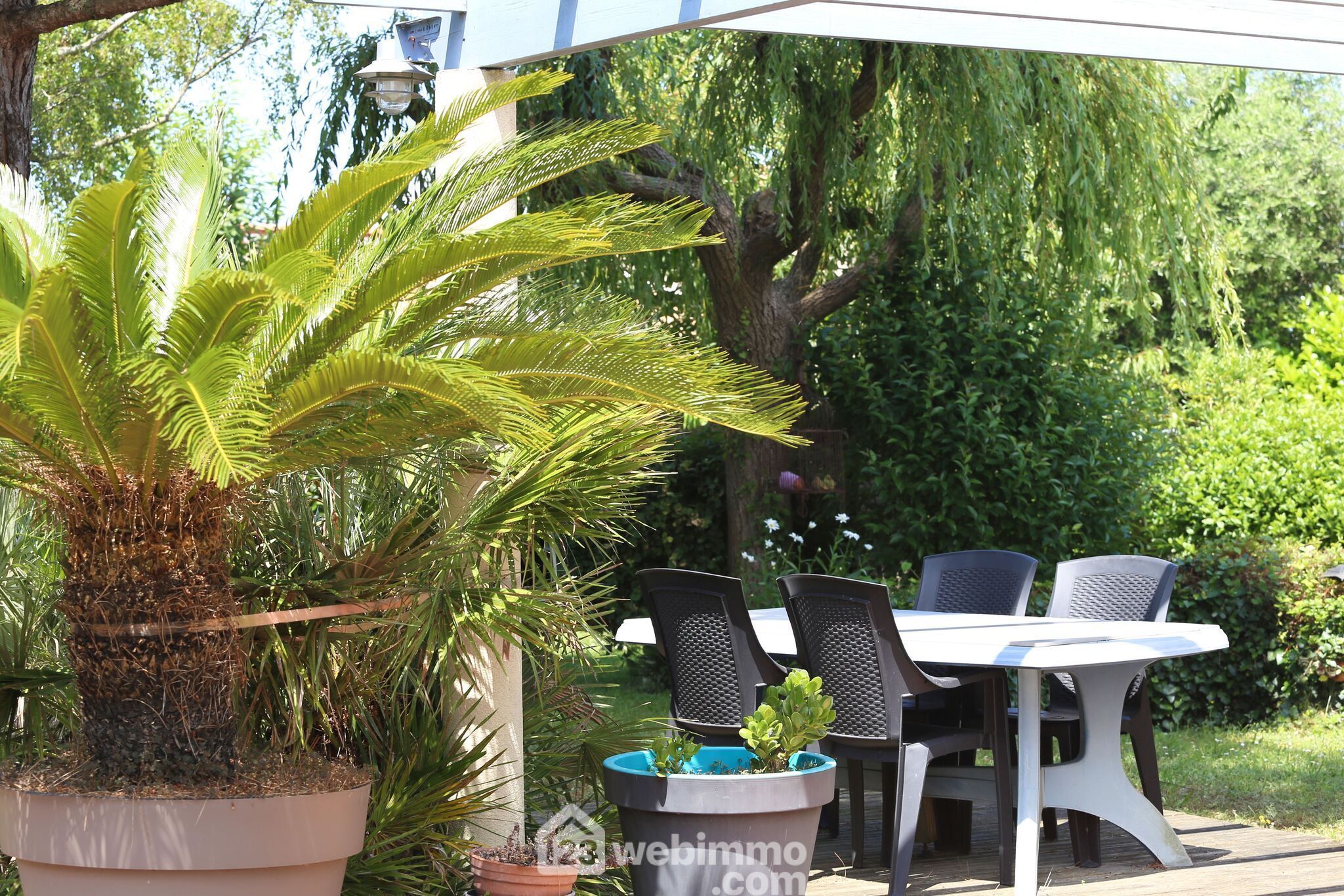 Superbe jardin arboré piscinable, idéalement exposé, avec terrasse sous pergola. Dépendance.