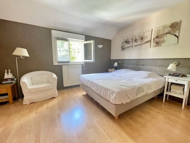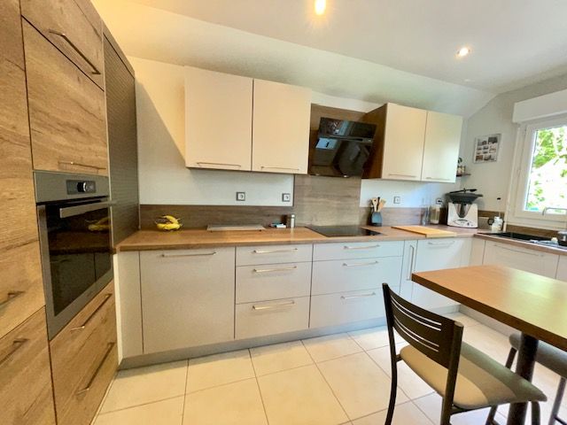 Au rez-de-chaussée: sas d'entrée, accès au garage, séjour double, cuisine récente de 2019 aménagée et équipée, belle véranda de 14m² donnant accès au jardin exposé EST avec barbecue, terrasse et cabanon.