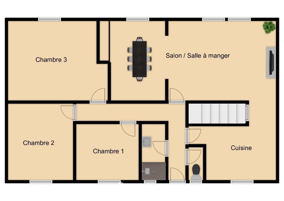 Entrée, salon-séjour, cuisine traditionnelle aménagée équipée, 3 chambres, salle d'eau, WC indépendant.