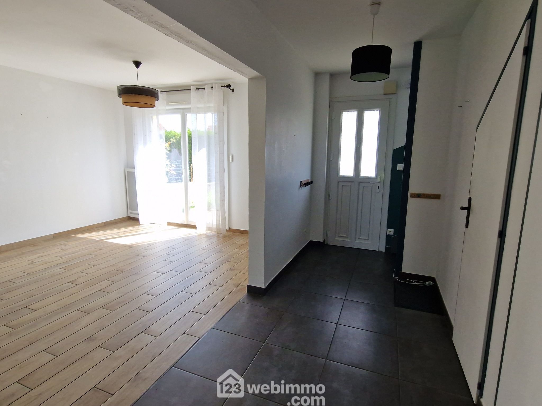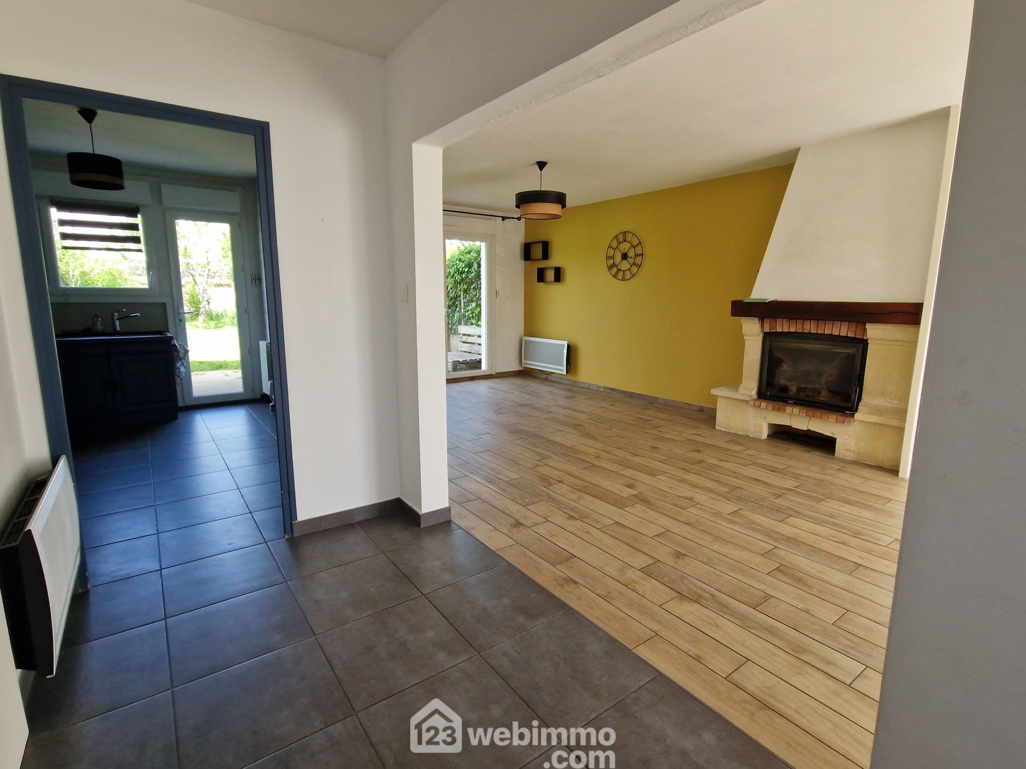 Le rez-de-chaussée offre un bel espace d'accueil, une pièce de vie traversante avec cheminée insert et accès au jardin, une cuisine de bonne dimension avec accès au jardin et au garage, un wc.