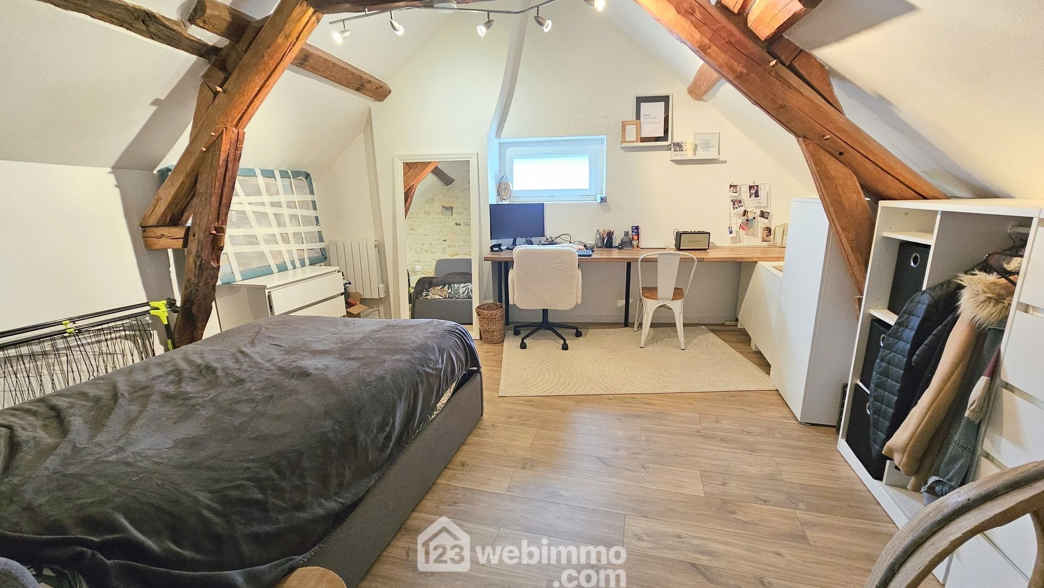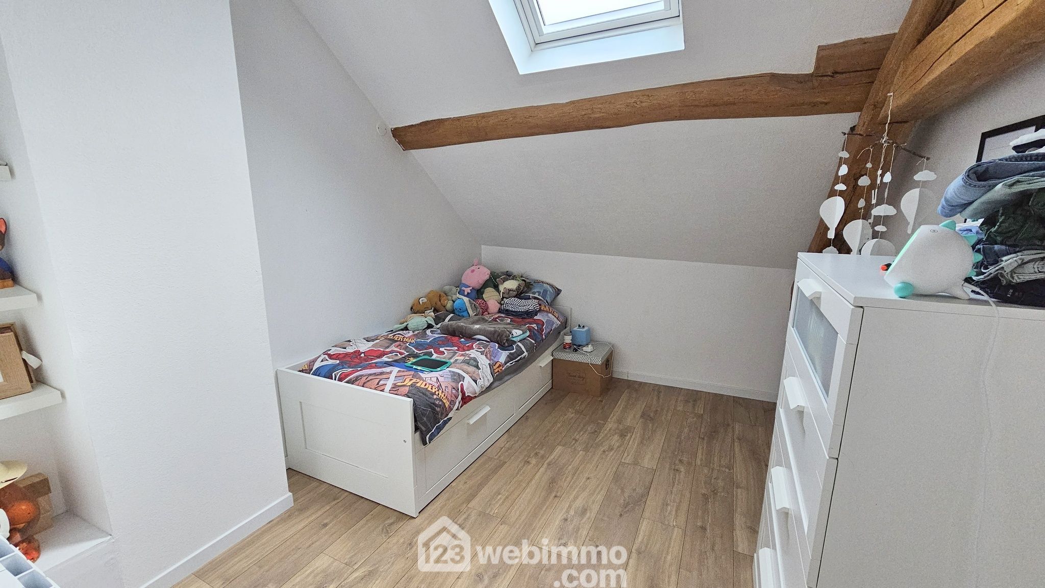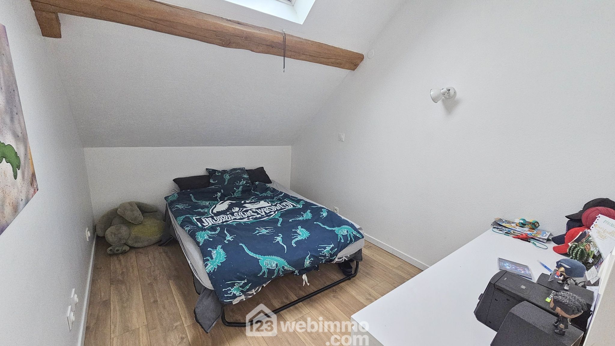 À l’étage, un vaste dégagement ouvre sur un espace idéal pour un bureau ou un coin lecture. Deux petites chambres douillettes et une grande chambre spacieuse offrent à chacun son espace personnel.