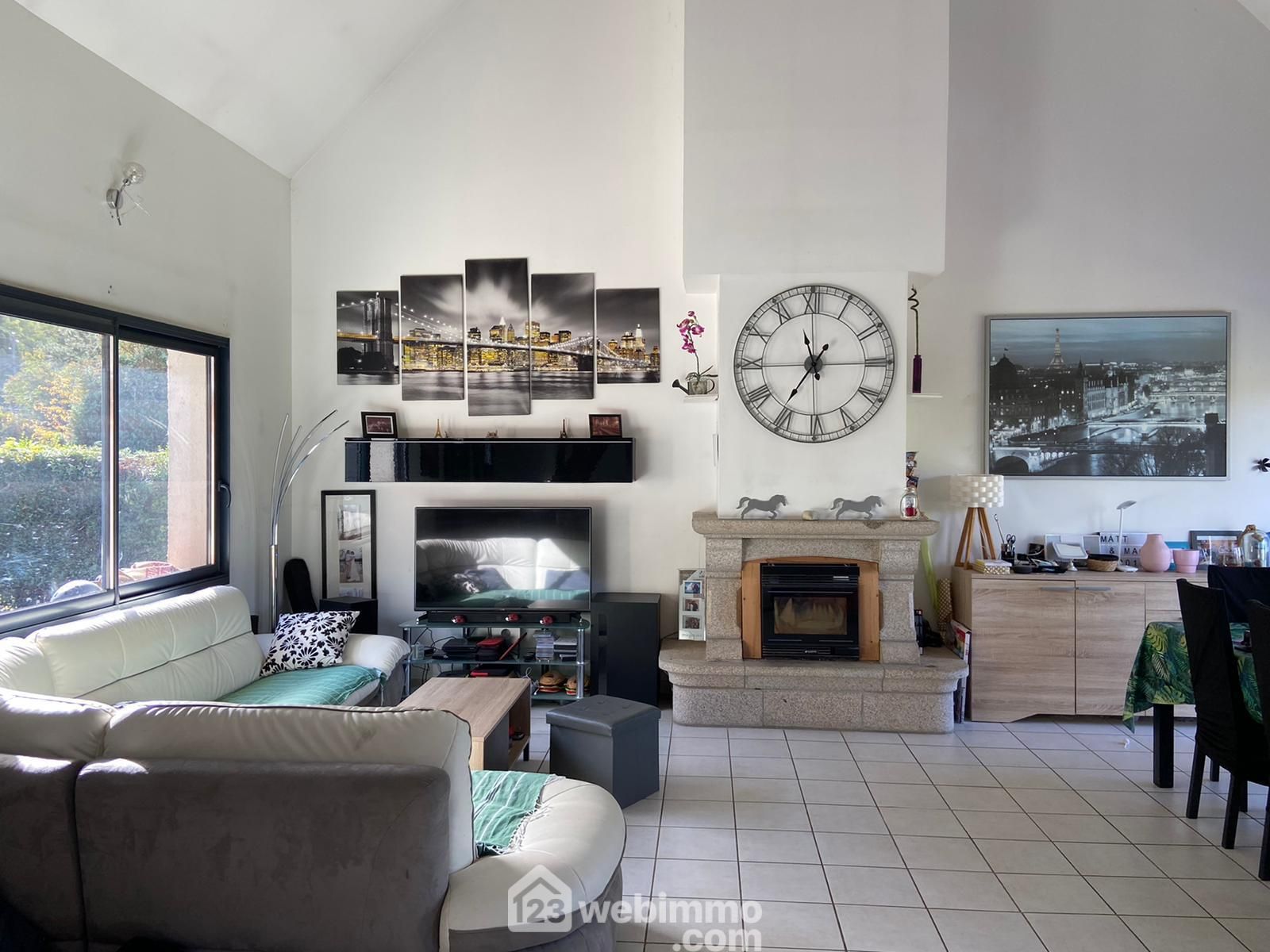 - au rez-de-chaussée un très grand séjour-salon sous un magnifique plafond cathédrale avec une cheminée à foyer fermé, cuisine ouverte équipée, 1 chambre, 1 salle de bains, wc séparé.