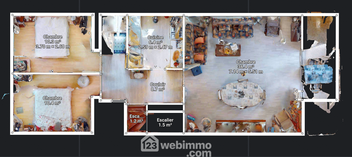 Elle se compose d’une grande pièce de vie, cuisine indépendante, 3 chambres, 2 salles d’eau, 2 WC, et un garage d’environ 25 m².
