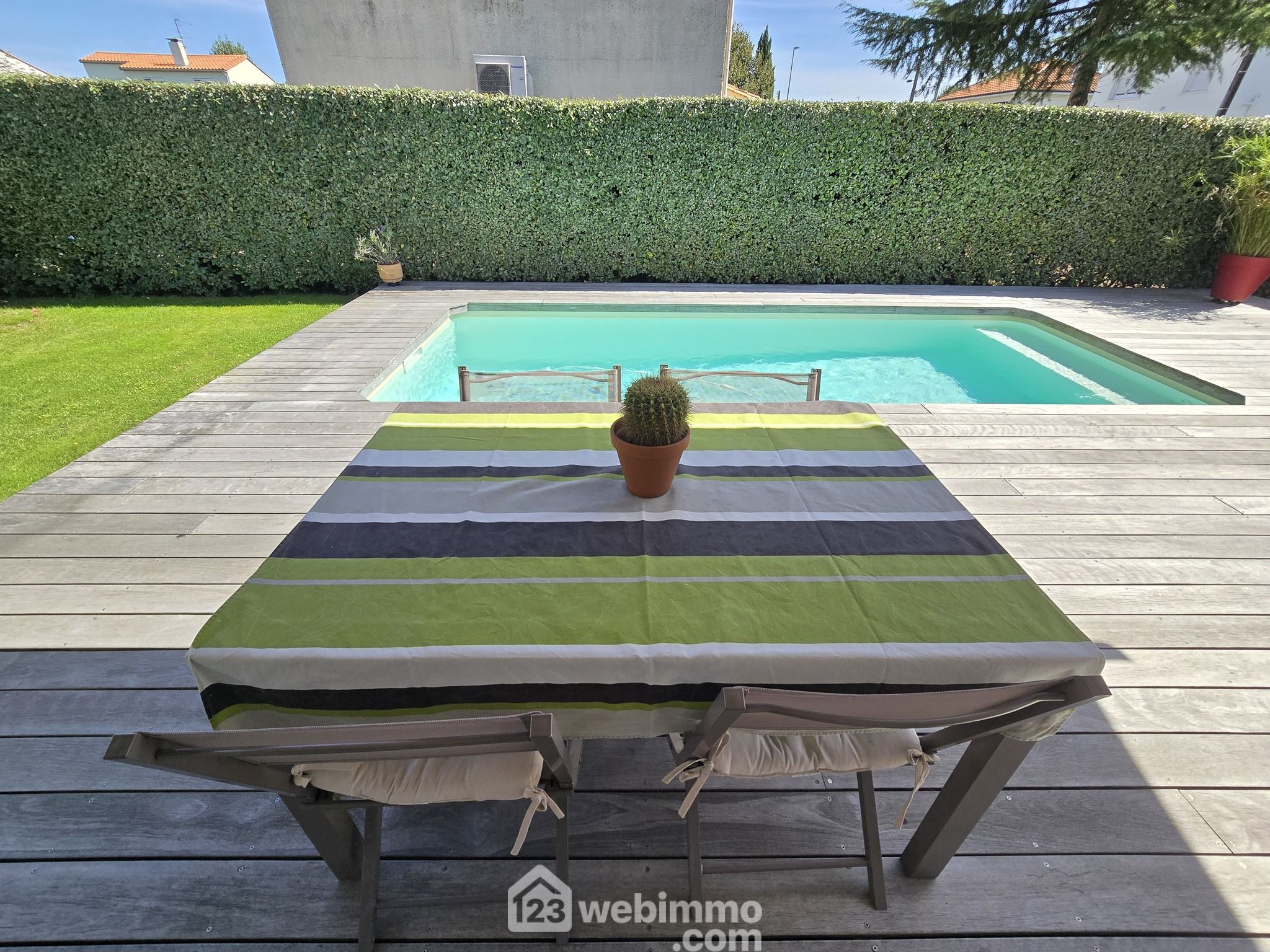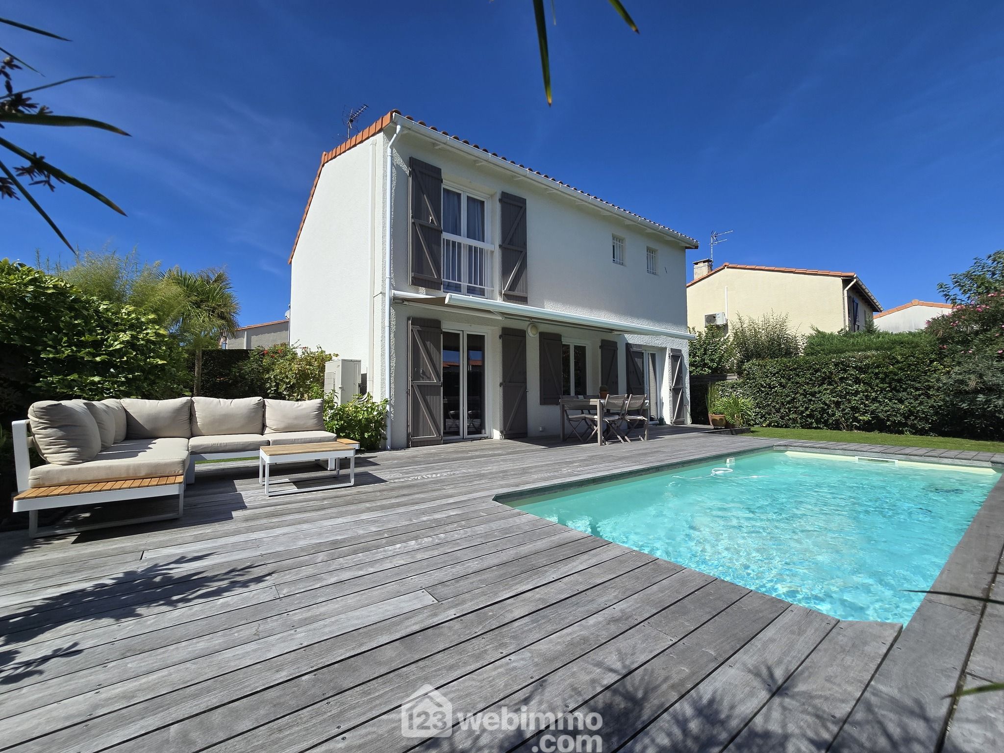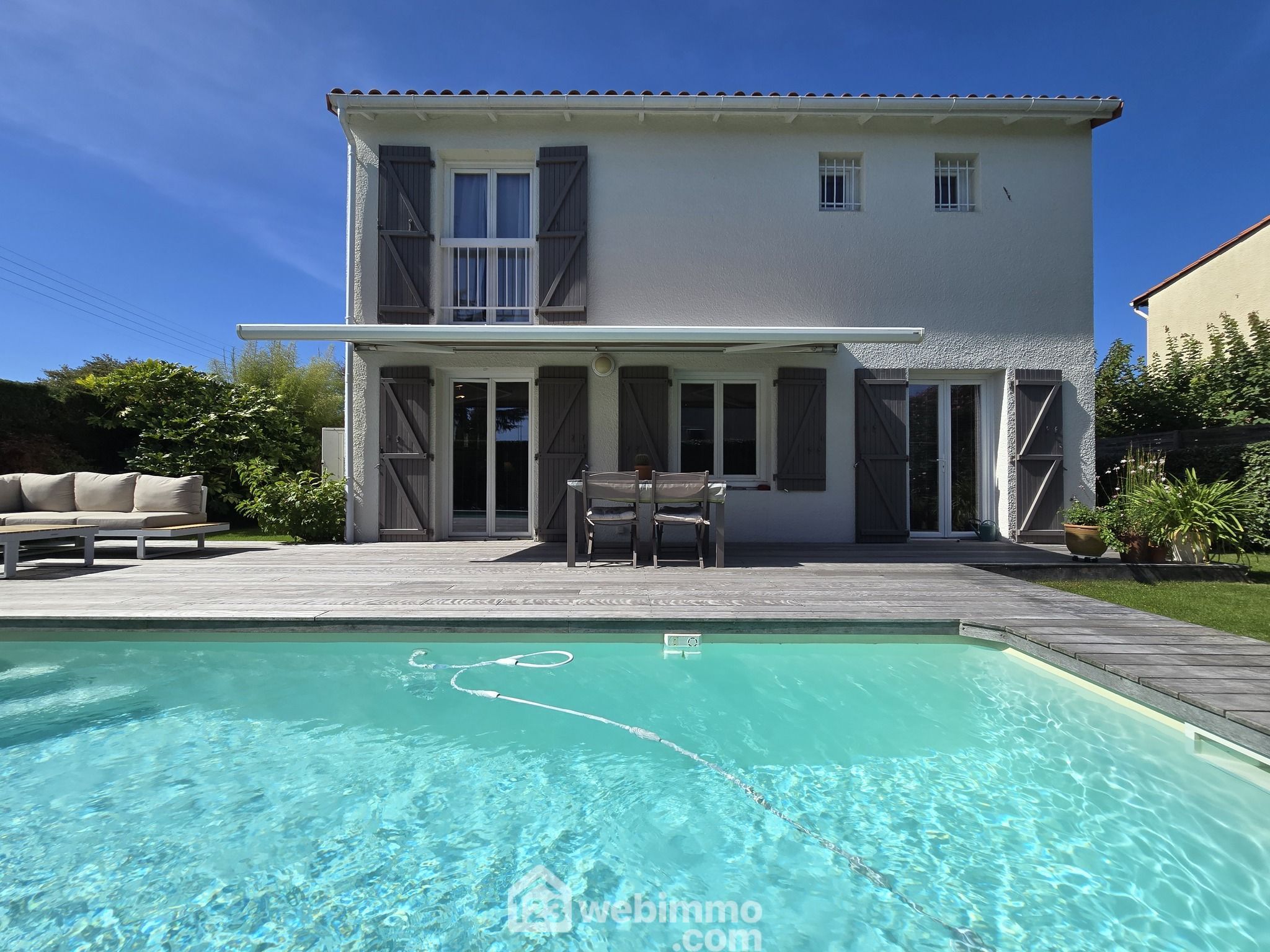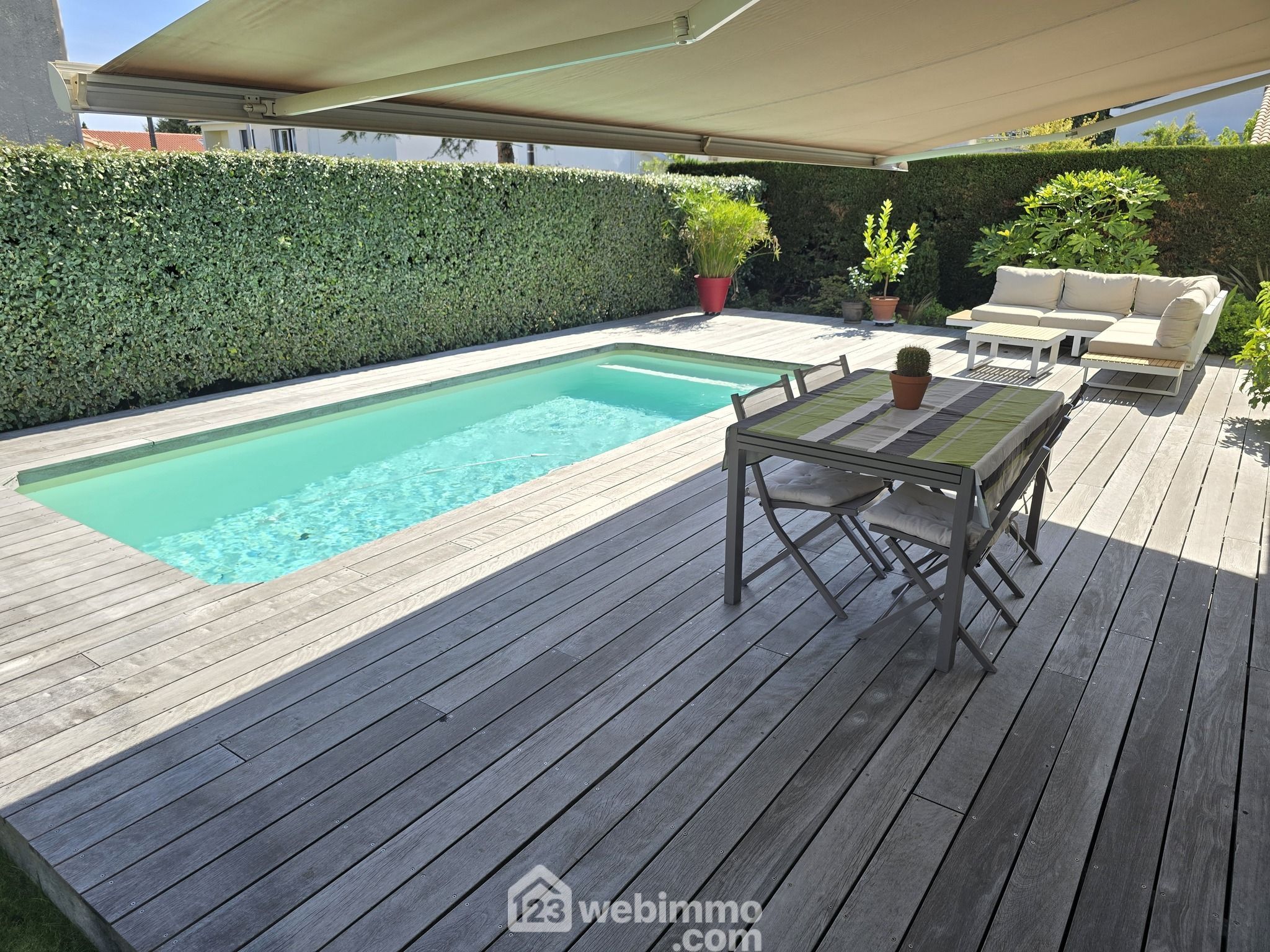 Et pour l'extérieur une terrasse bois et son store banne électrique orientée sud est pour profiter en toute quiétude des belles journées ensoleillées entre deux baignades dans la piscine. Le tout sur un terrain arboré et paysagé de 355 m².