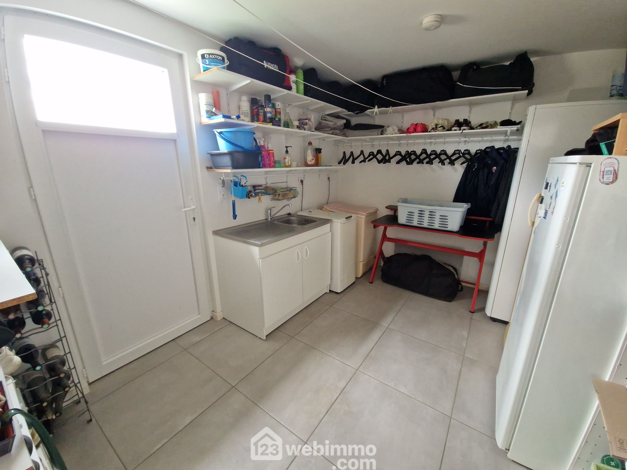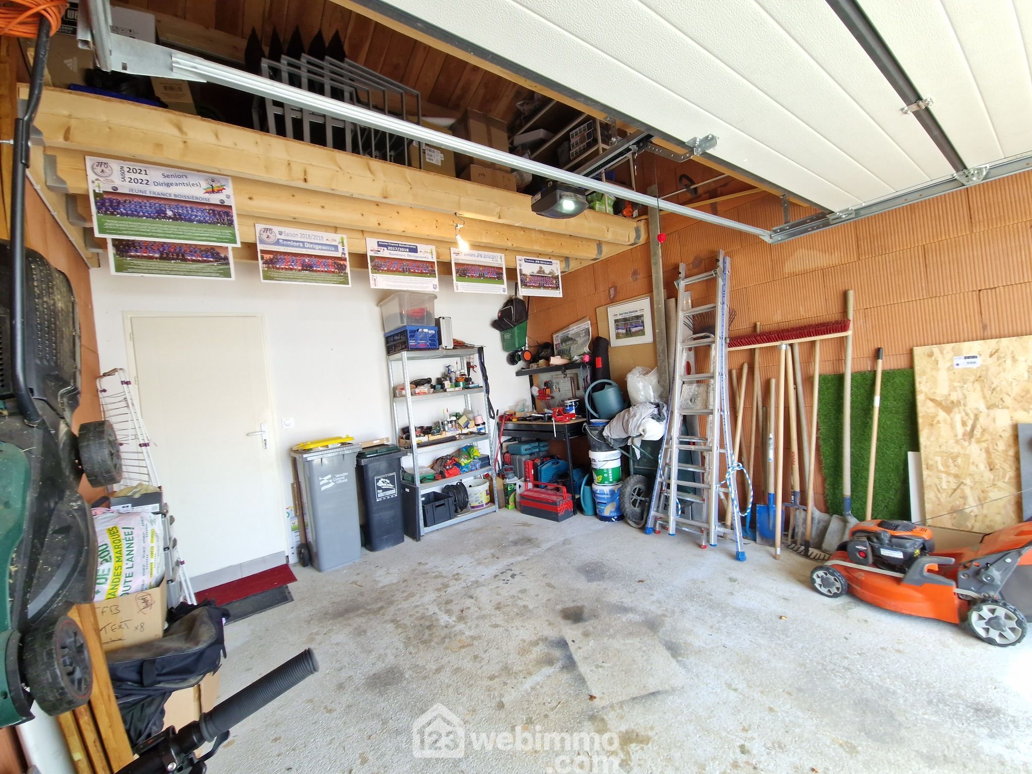 Beau garage de 23 m² avec porte sectionnelle motorisée et faux-grenier, cellier/lingerie chauffé de 10 m² avec porte de service.