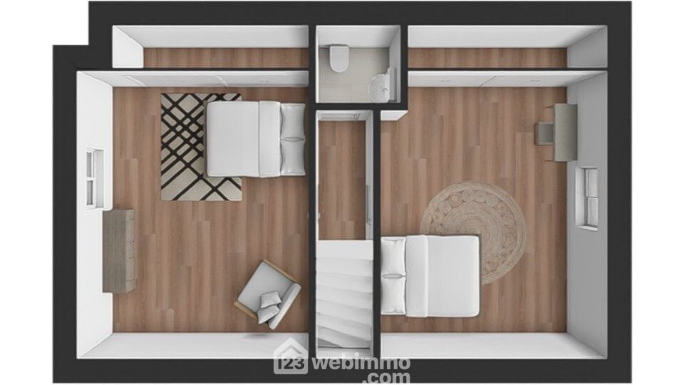 Au rez-de-chaussée : salon, salle à manger, cuisine aménagée et équipée, salle d’eau et WC.