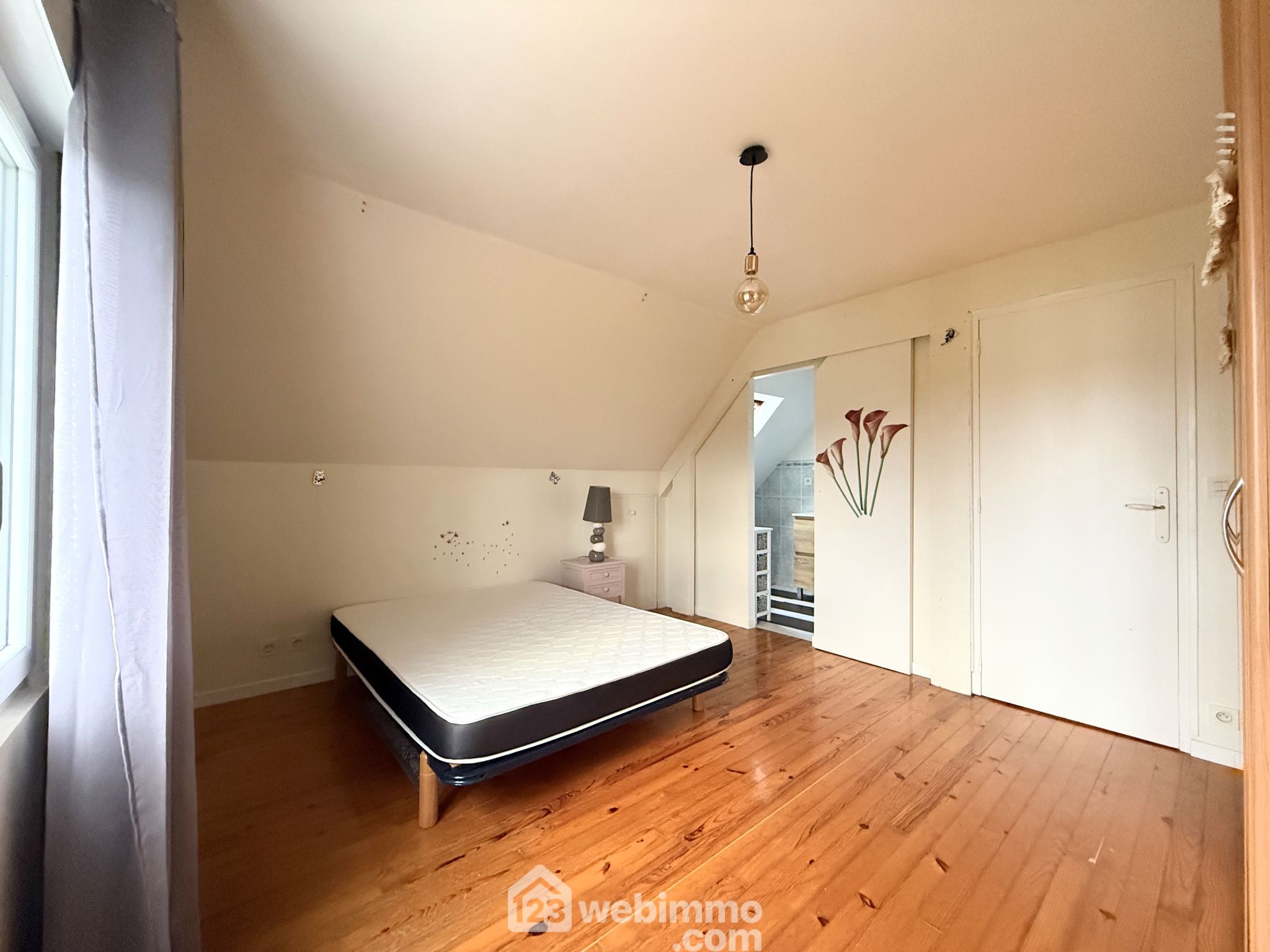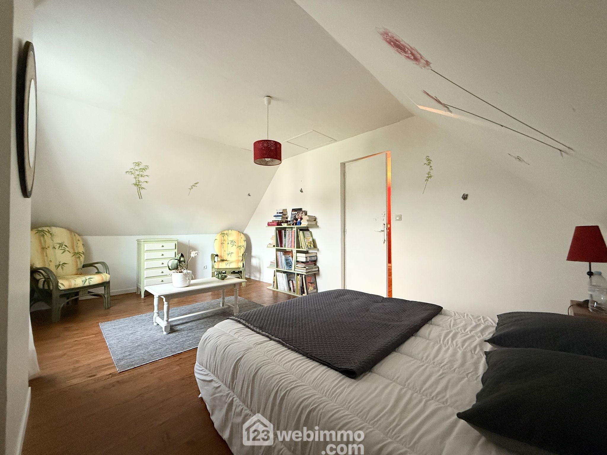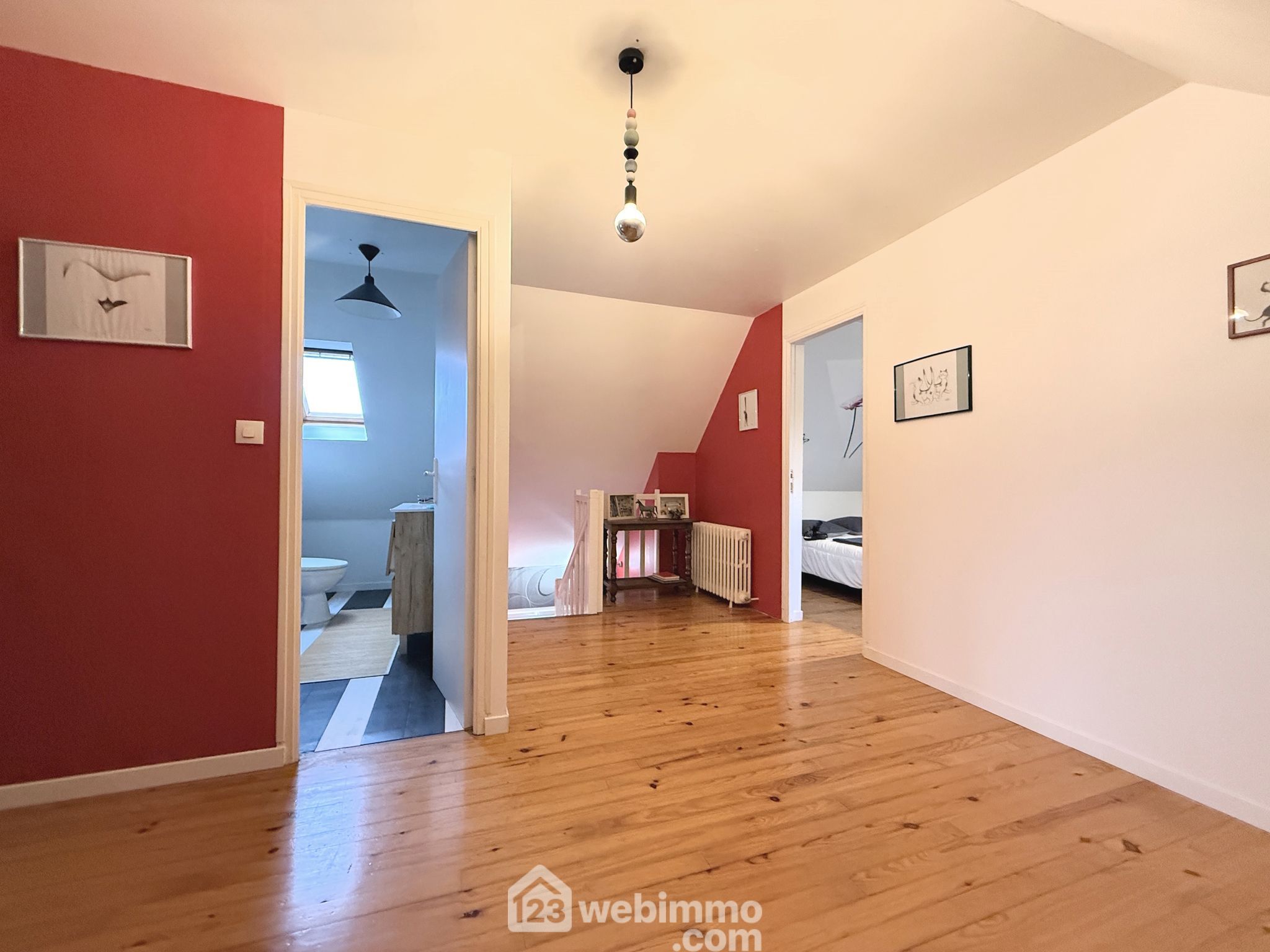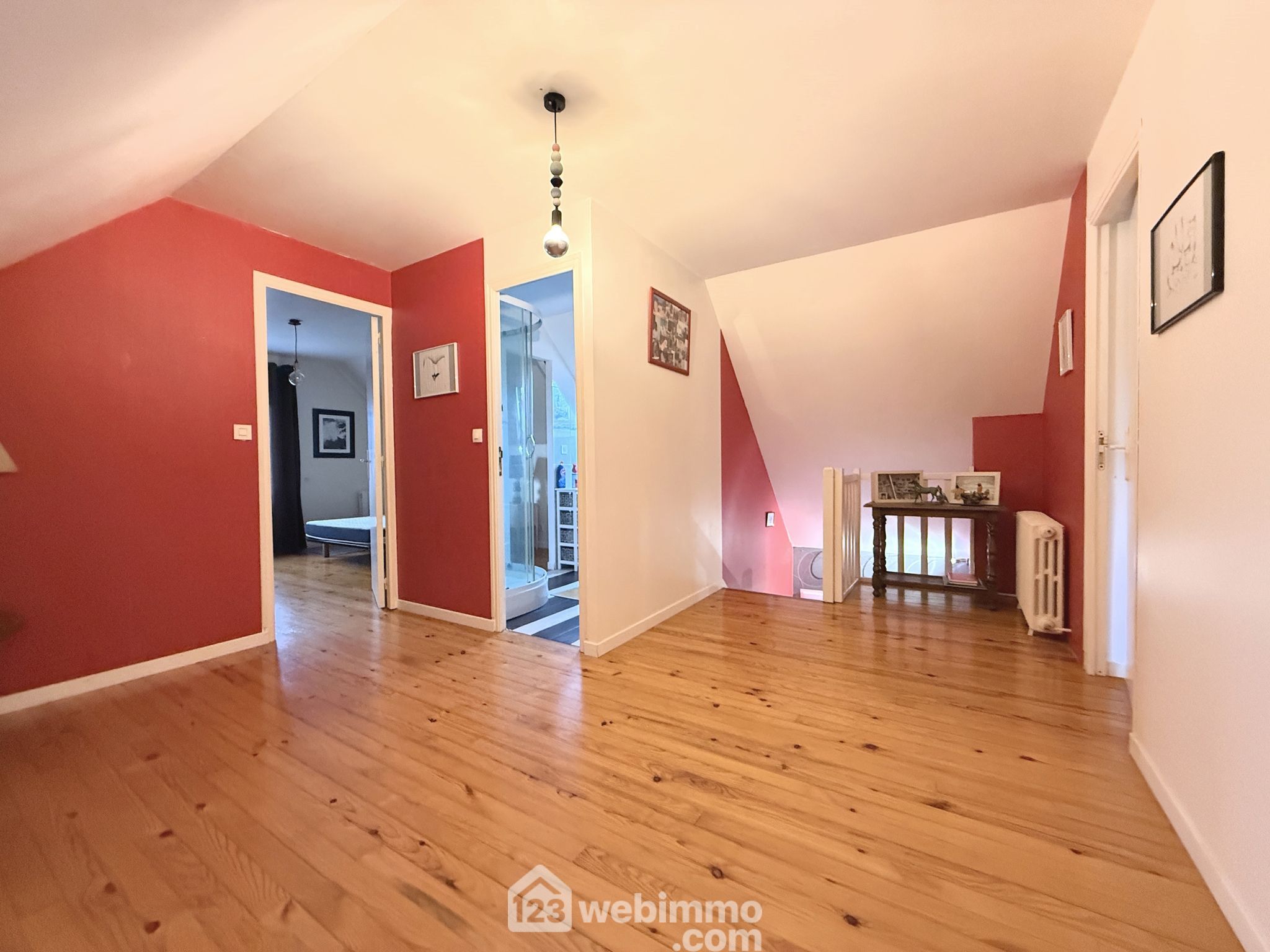 A l'étage, un grand palier mezzanine de 11,5m2 habitables dessert, 2 grandes chambres de 13m2 et 16m2 au sol, des greniers sous rampants, ainsi qu'une salle de douche de 3m2 habitables avec WC.