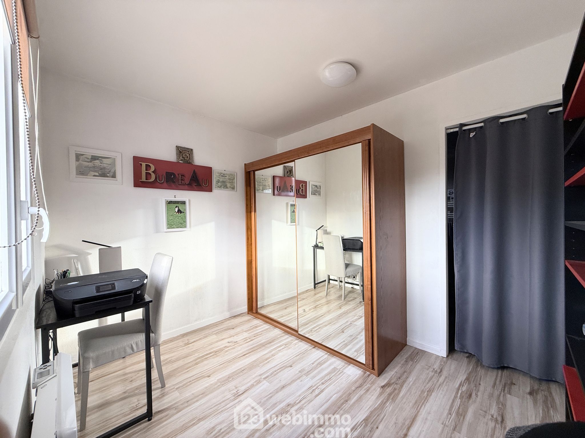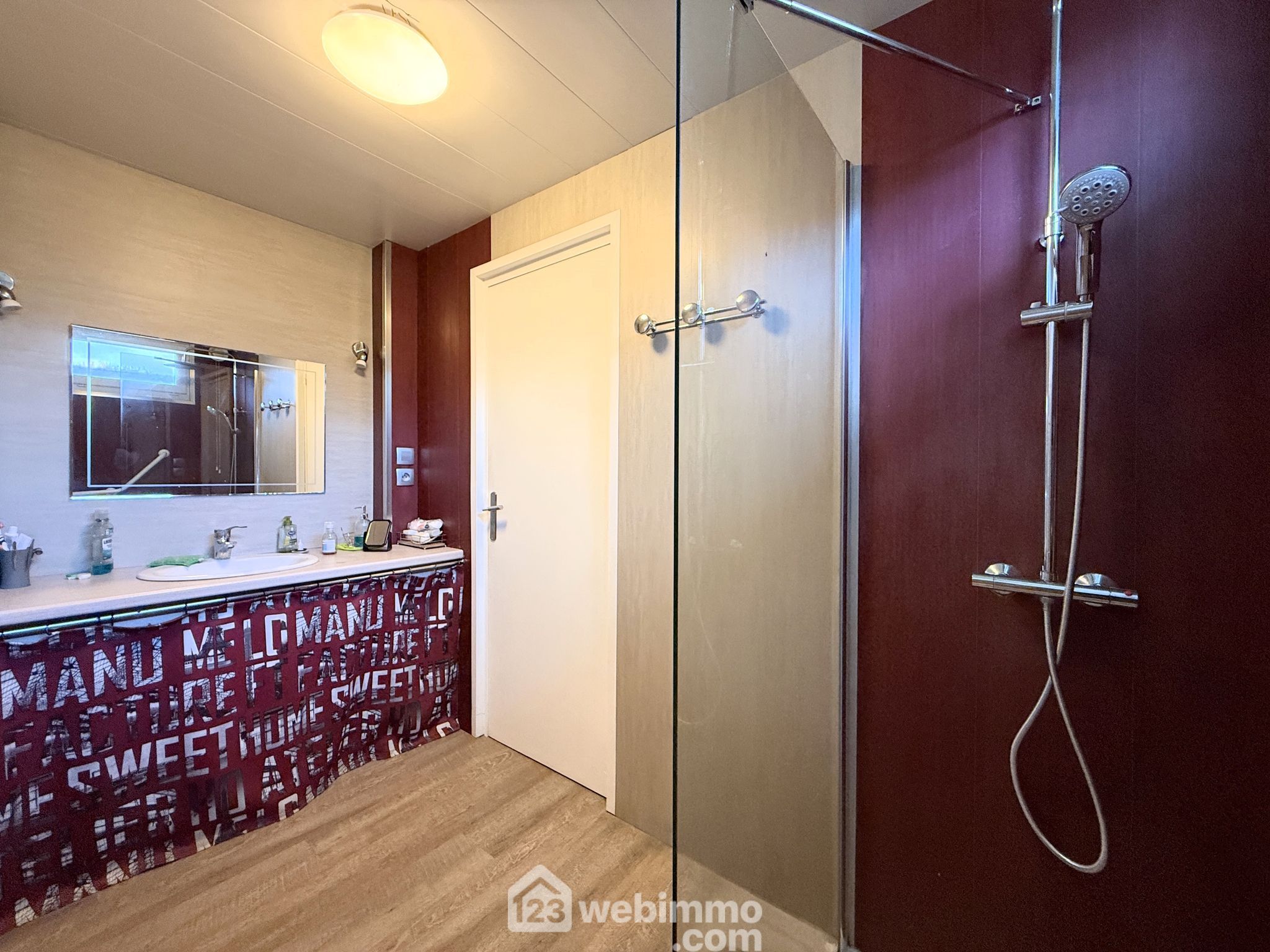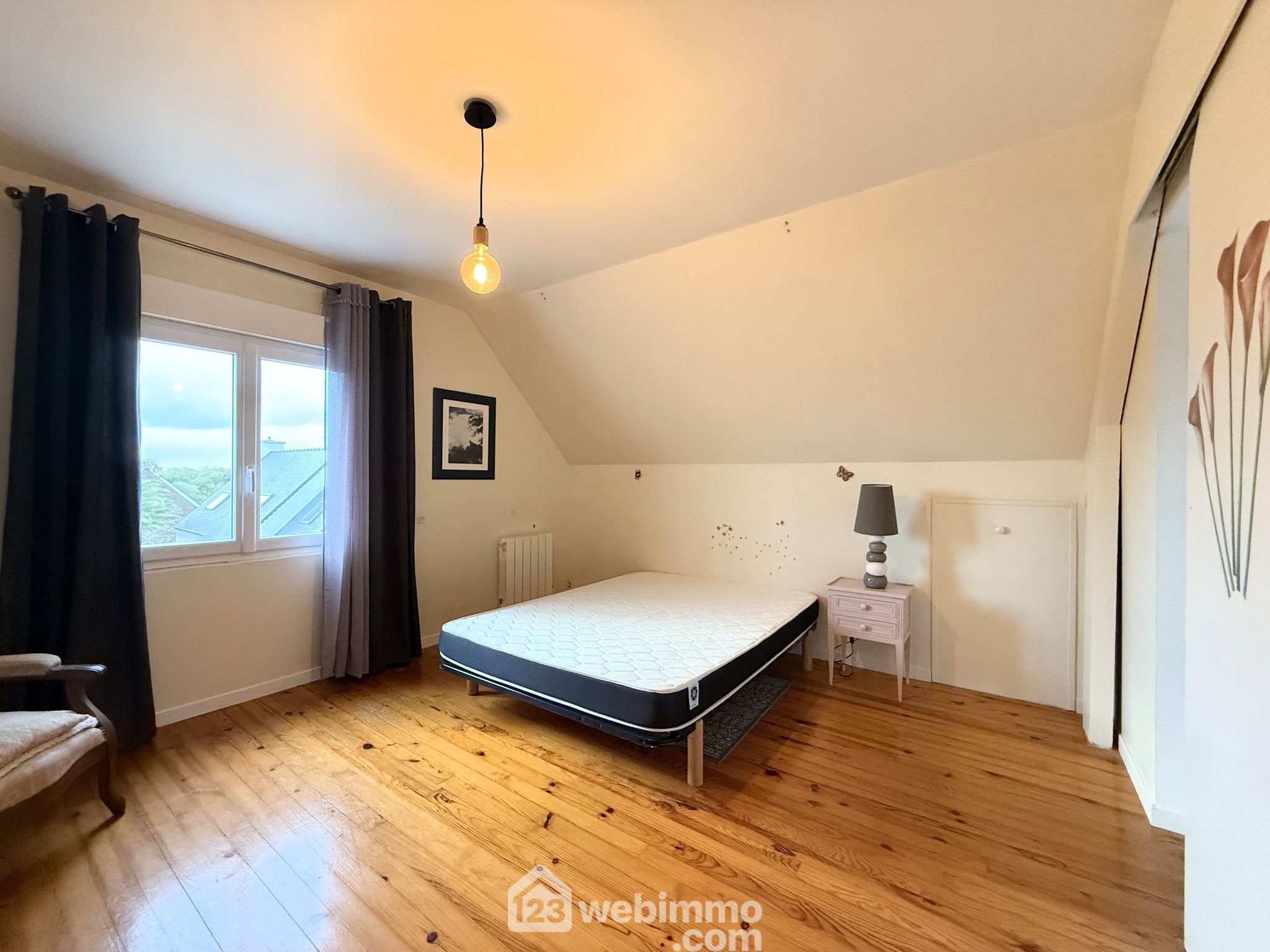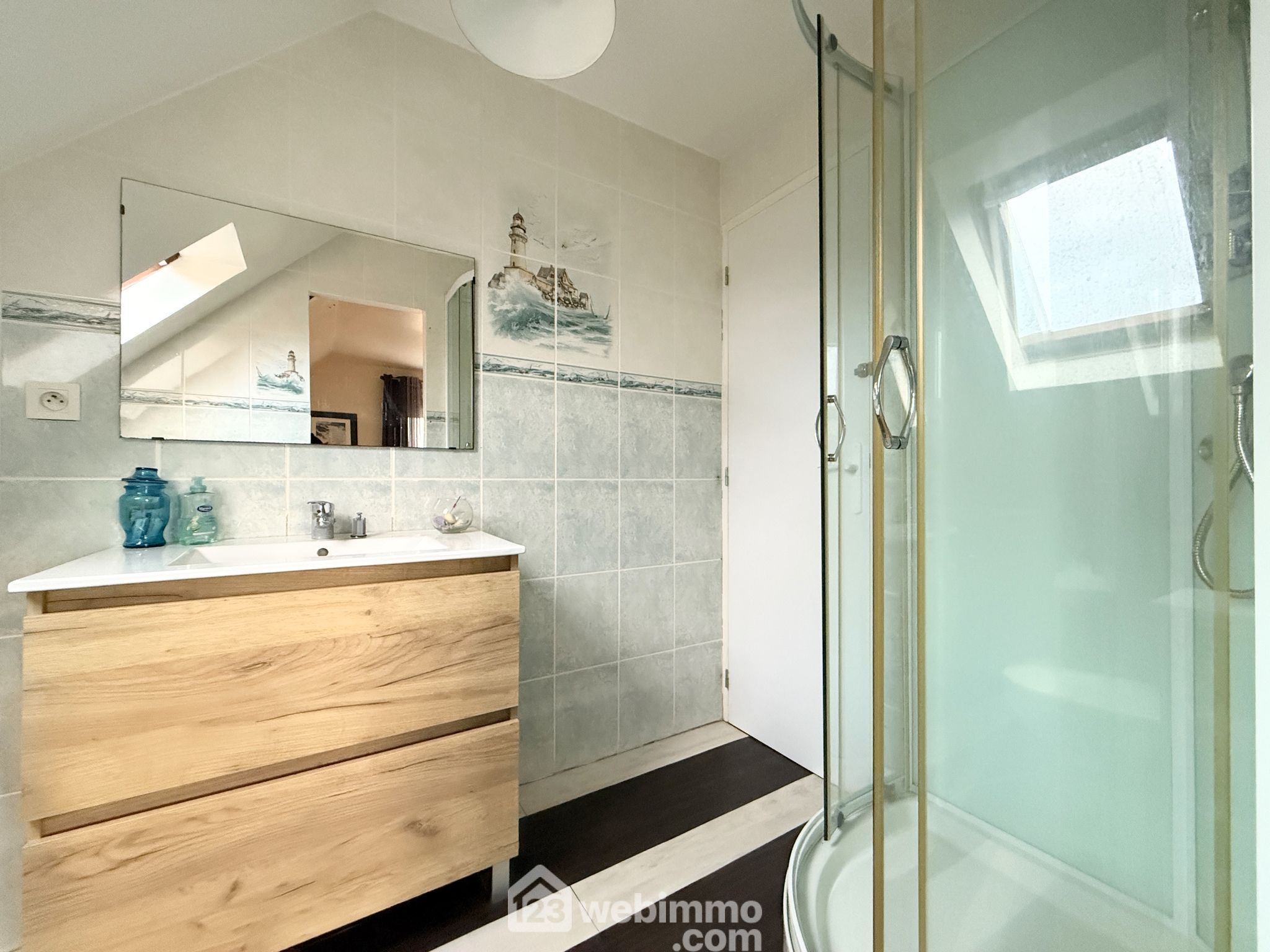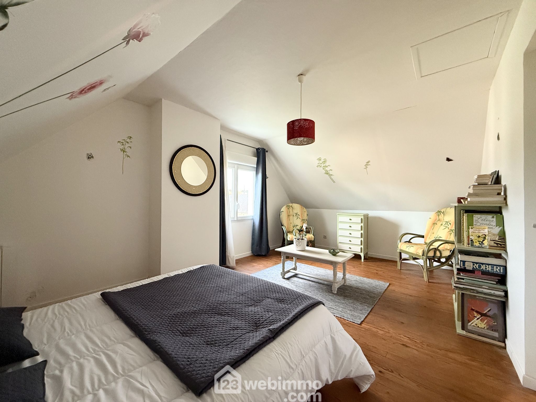 A l'étage, un grand palier mezzanine de 11,5m2 habitables dessert, 2 grandes chambres de 13m2 et 16m2 au sol, des greniers sous rampants, ainsi qu'une salle de douche de 3m2 habitables avec WC.