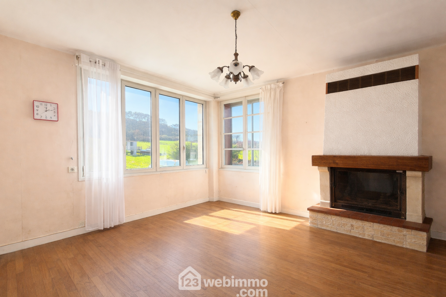 Prestations : Toiture neuve (2025) – Menuiseries bois, aluminium et PVC (double et simple vitrage) avec volets manuels – Cheminée avec insert fermé – Chaudière fioul – Assainissement collectif (tout-à-l’égout) – Puits.