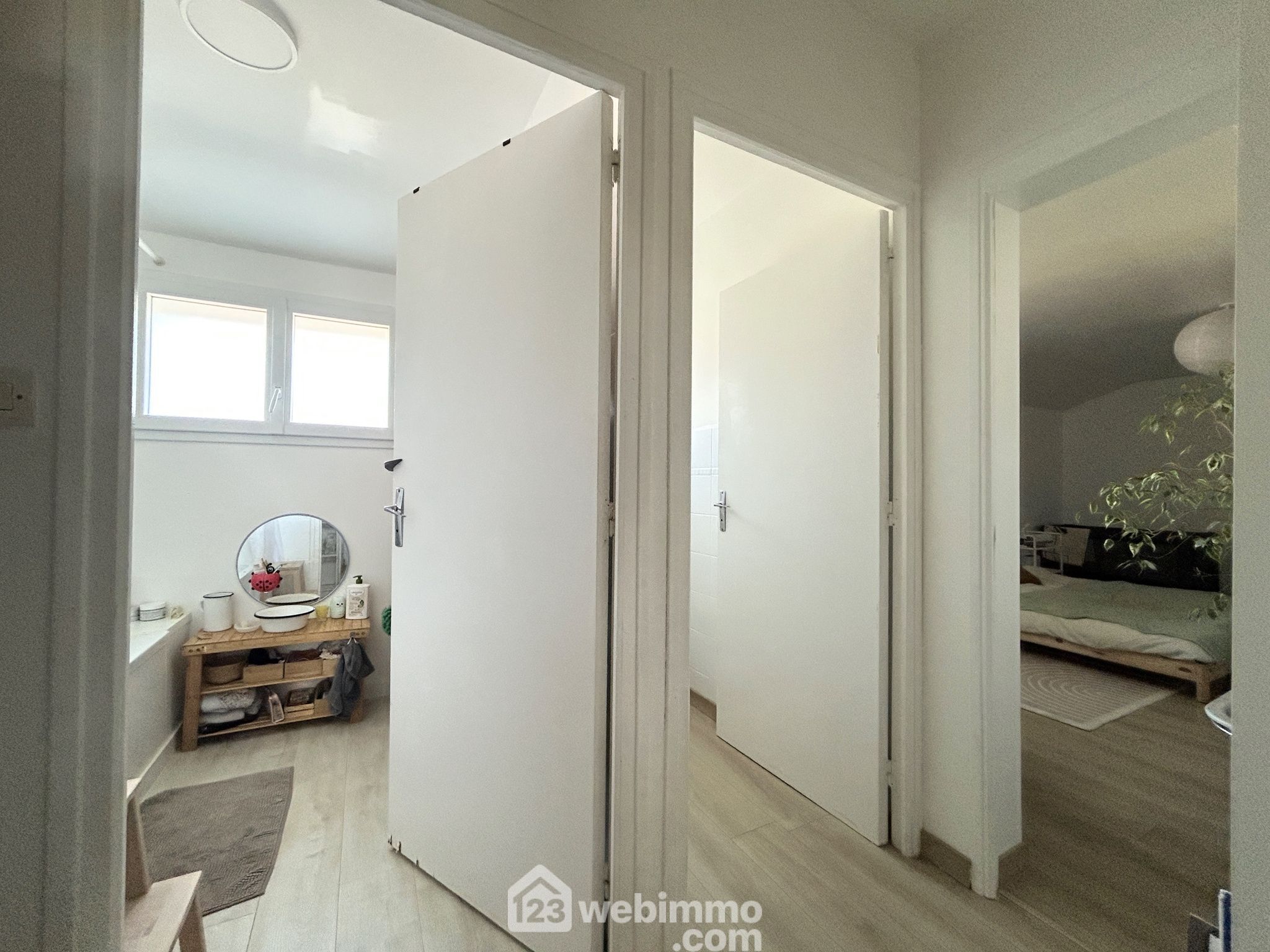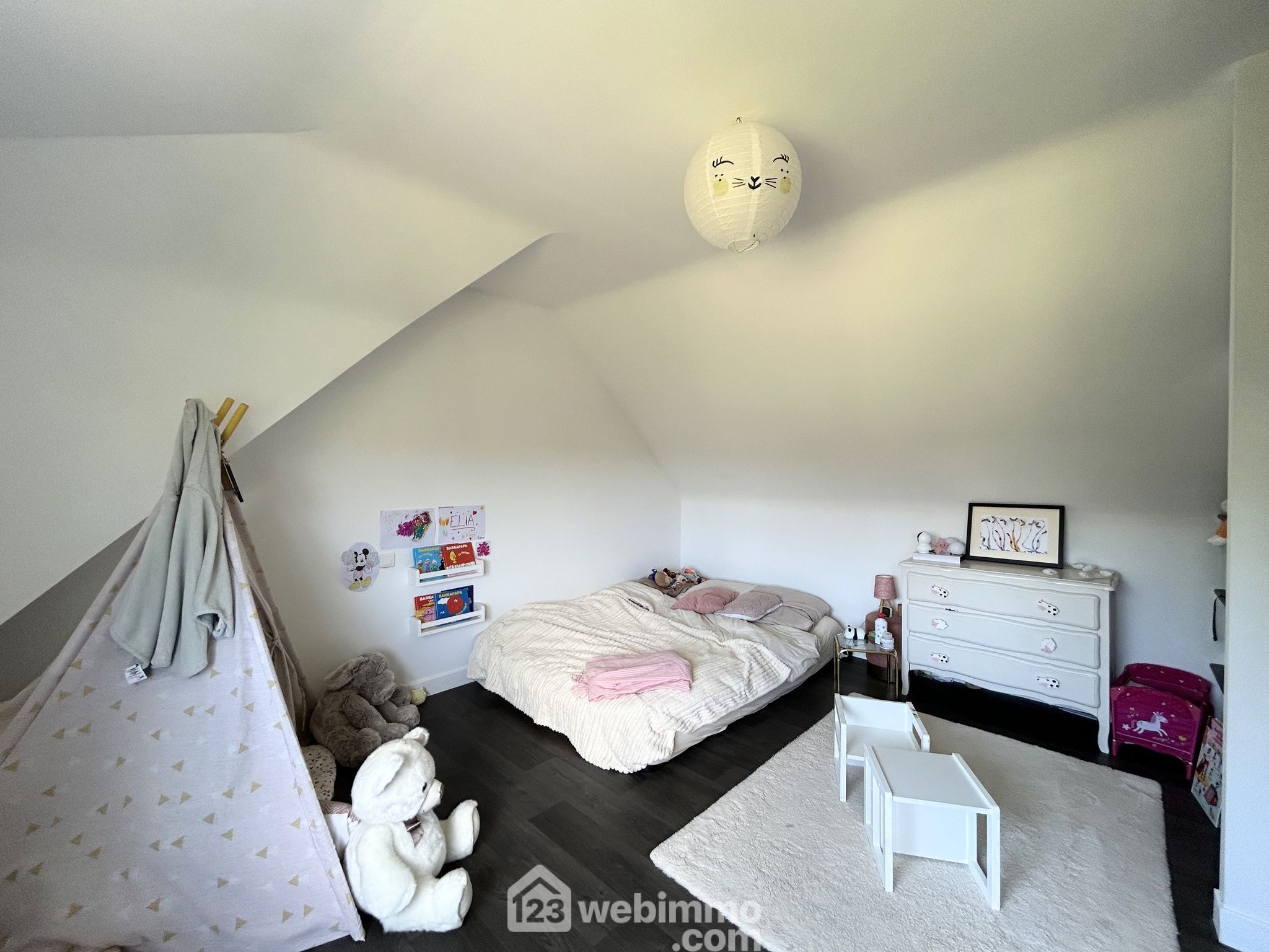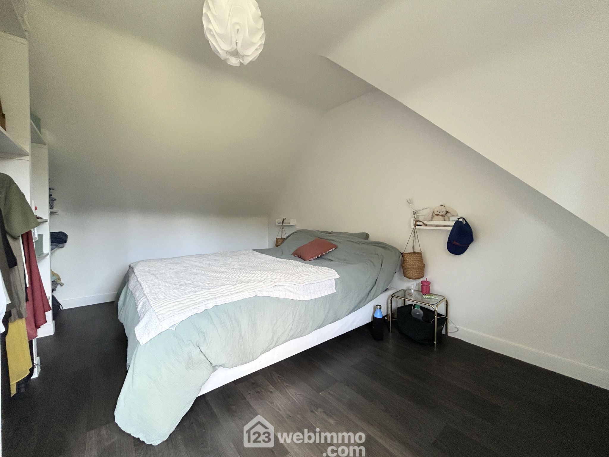 À l’étage principal, deux chambres mansardées complètent l’espace nuit.
