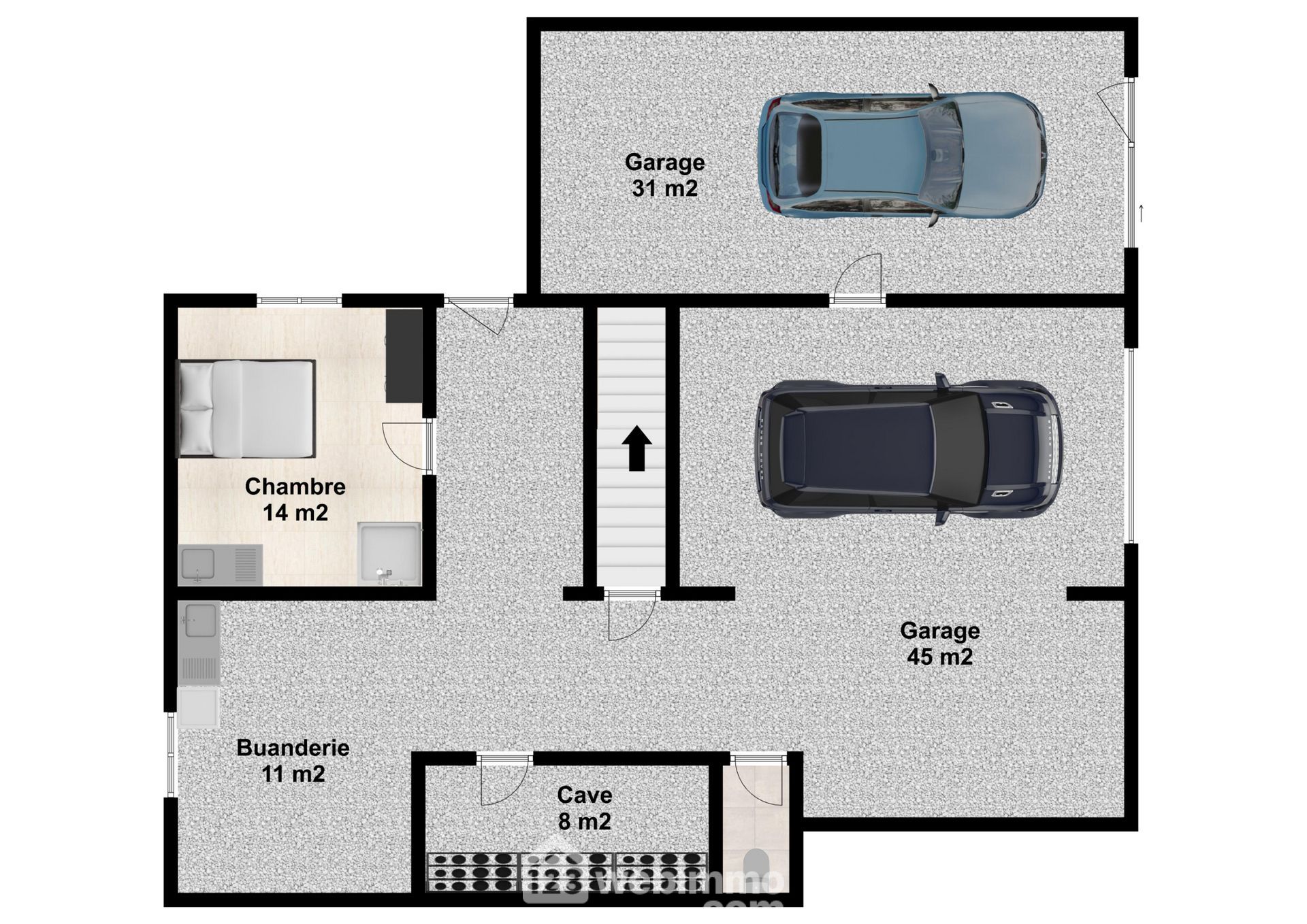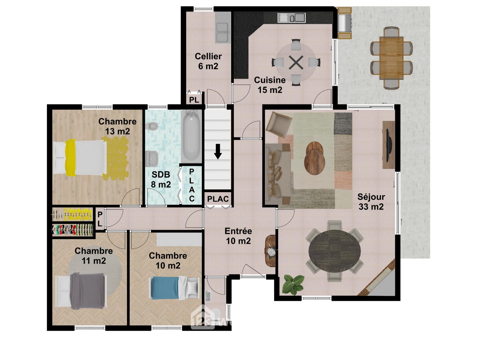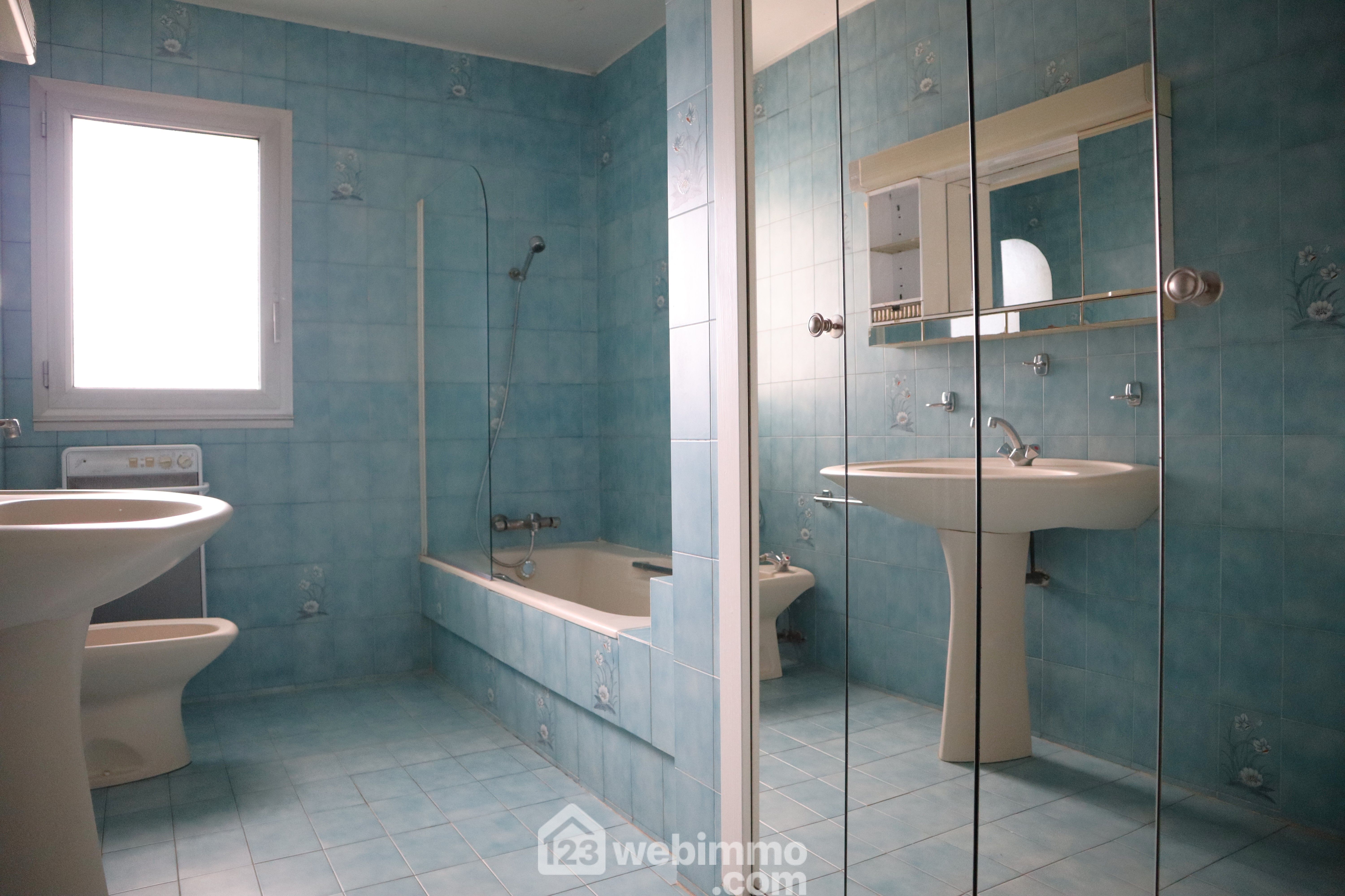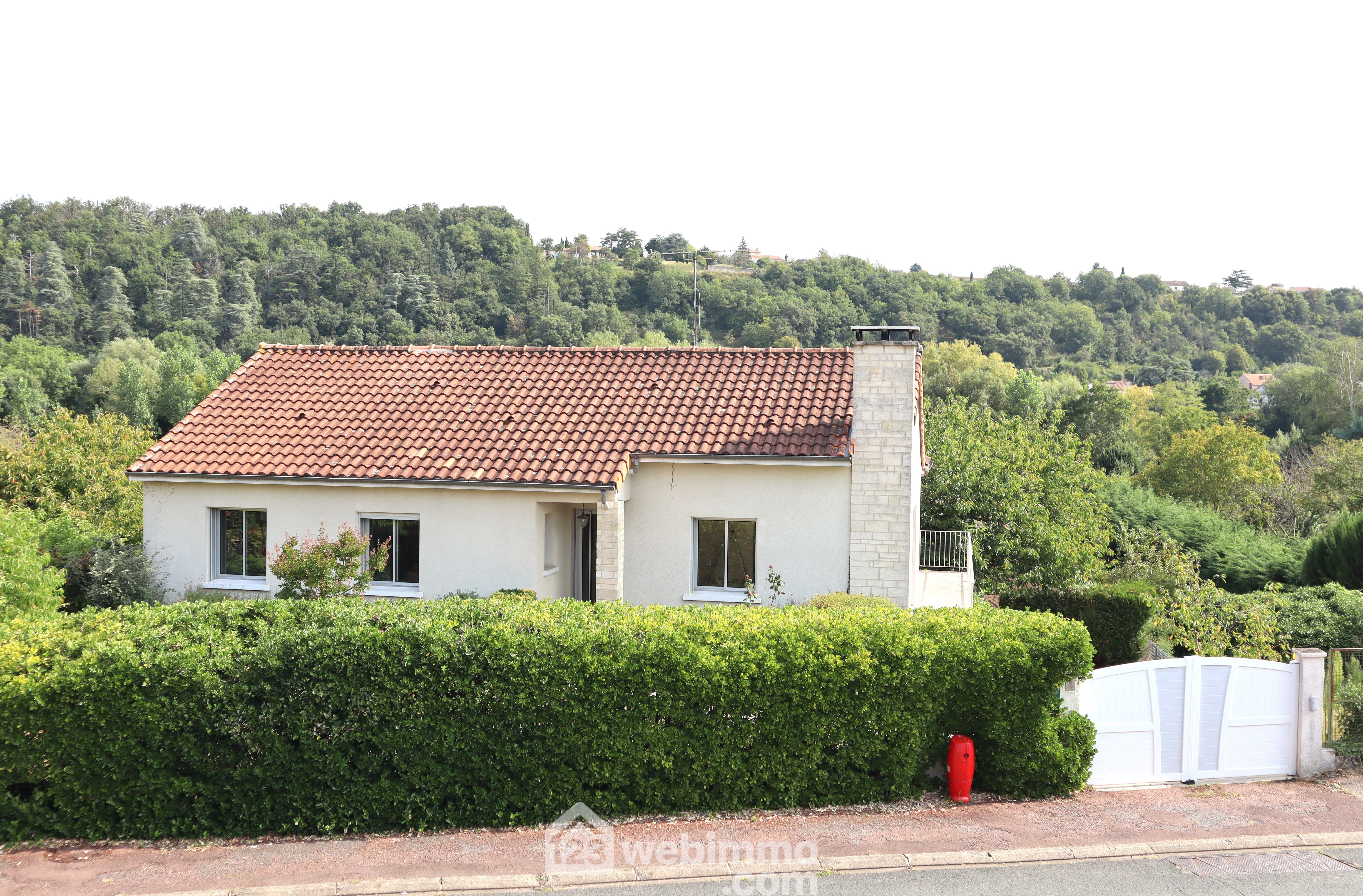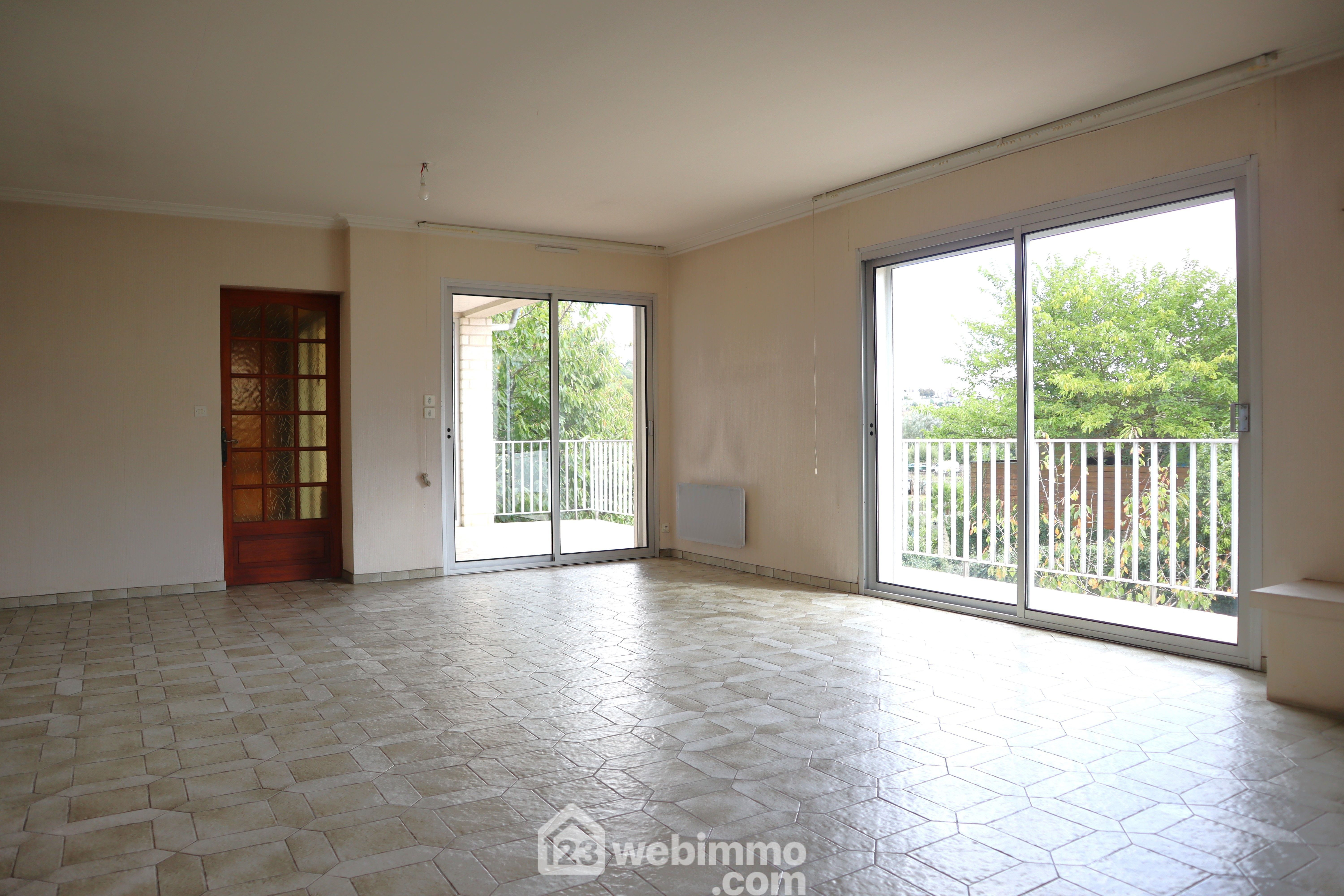 Maison sur sous-sol avec vie de plain-pied, 124 m2 habitables, 5 pièces, 4 chambres. Terrain de 721 m2 avec puits et arbres fruitiers.