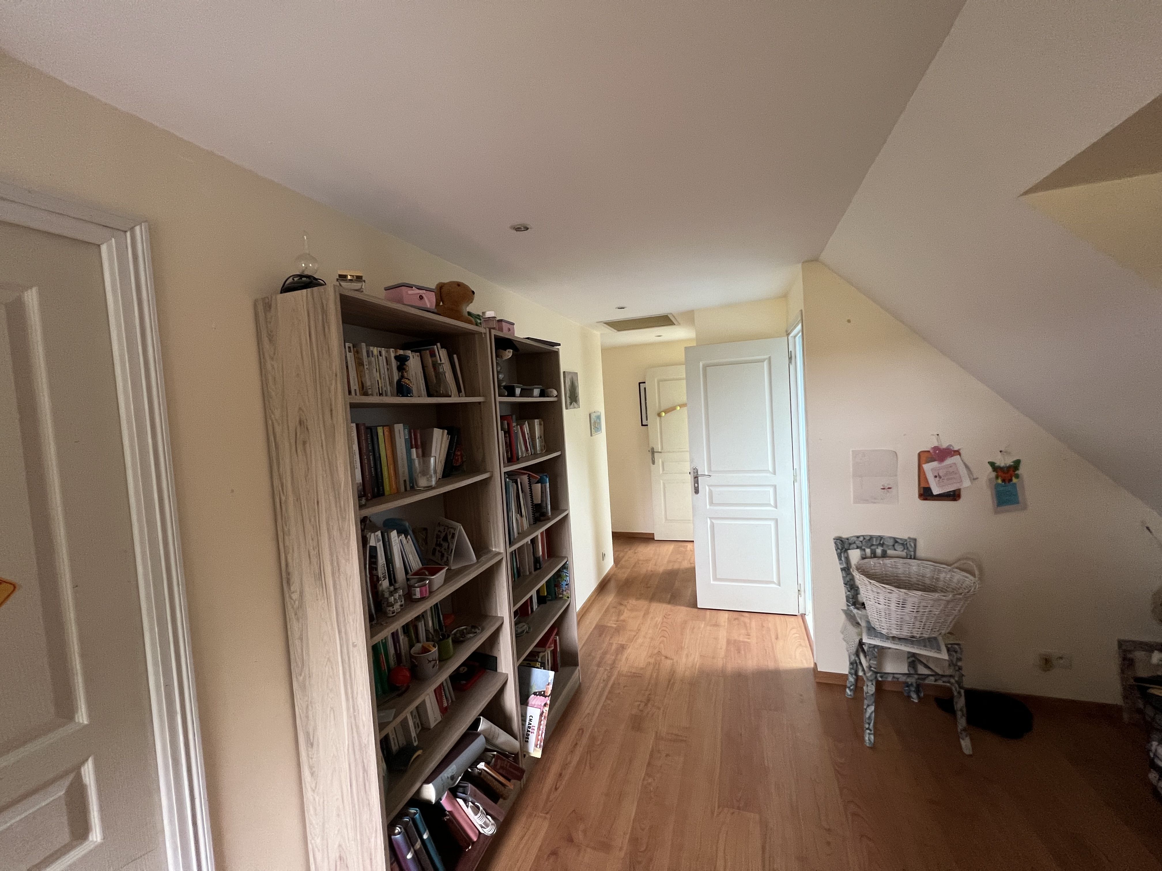 A l'étage, un palier mezzanine de 11m2 dessert une grande chambre de 19m2 mansardée avec rangement, 2 autres chambres mansardées avec rangements de 11m2 et 9m2, un grenier aménageable de 10m2, une salle de bain de 8m2 et un WC.