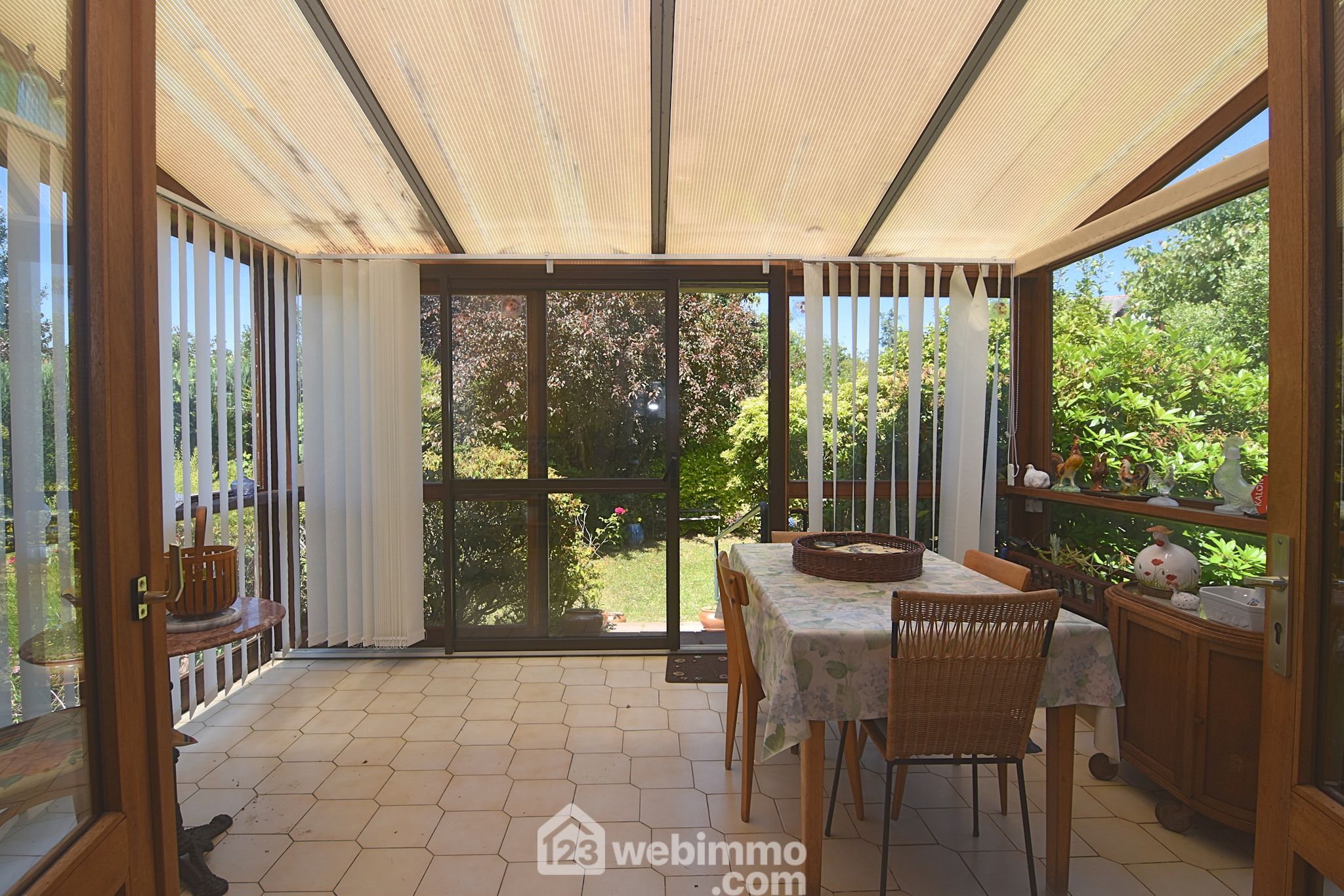 À l’extérieur : cour à l’avant, jardin arboré à l’arrière, bûcher sous la véranda, serre et abri de jardin.