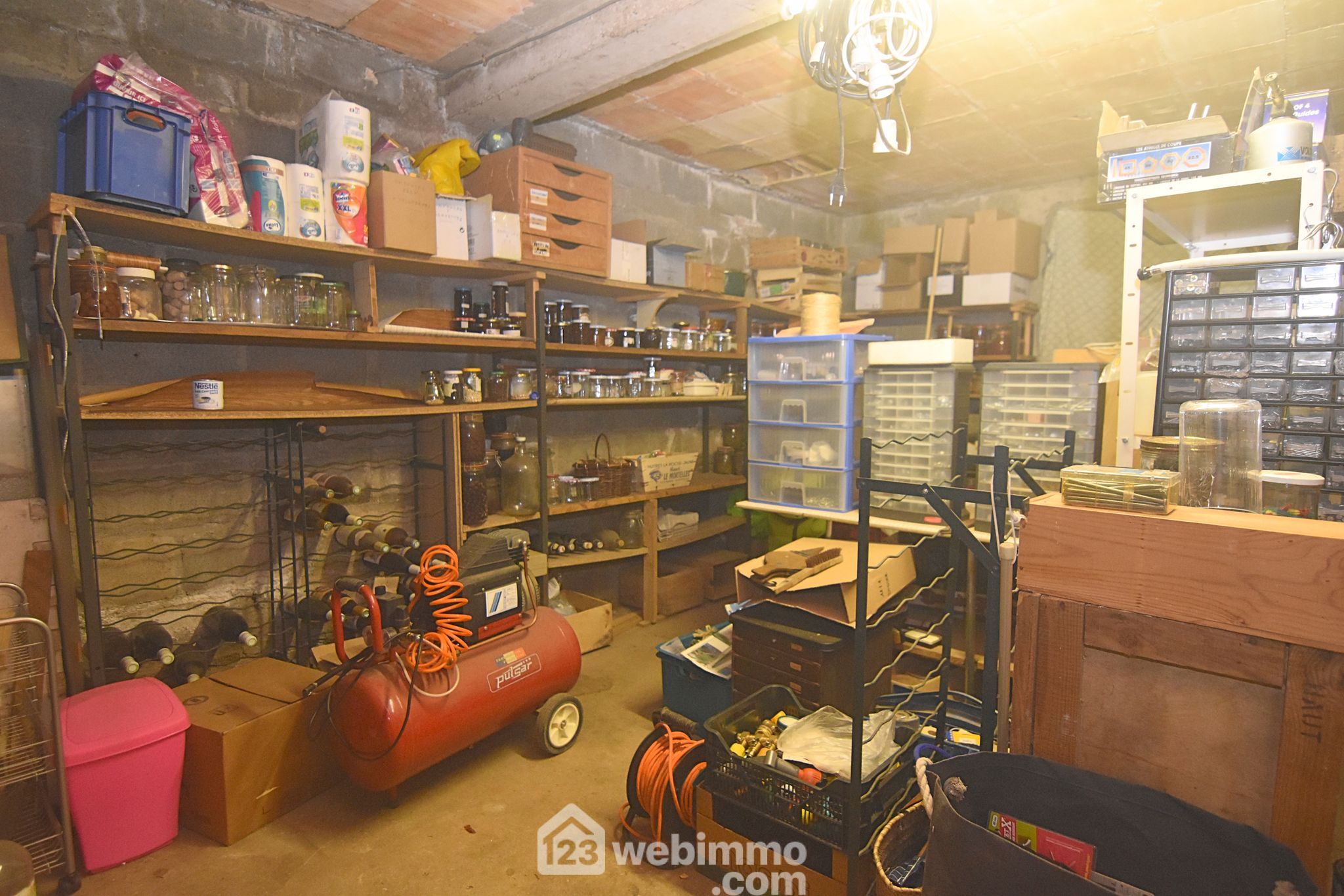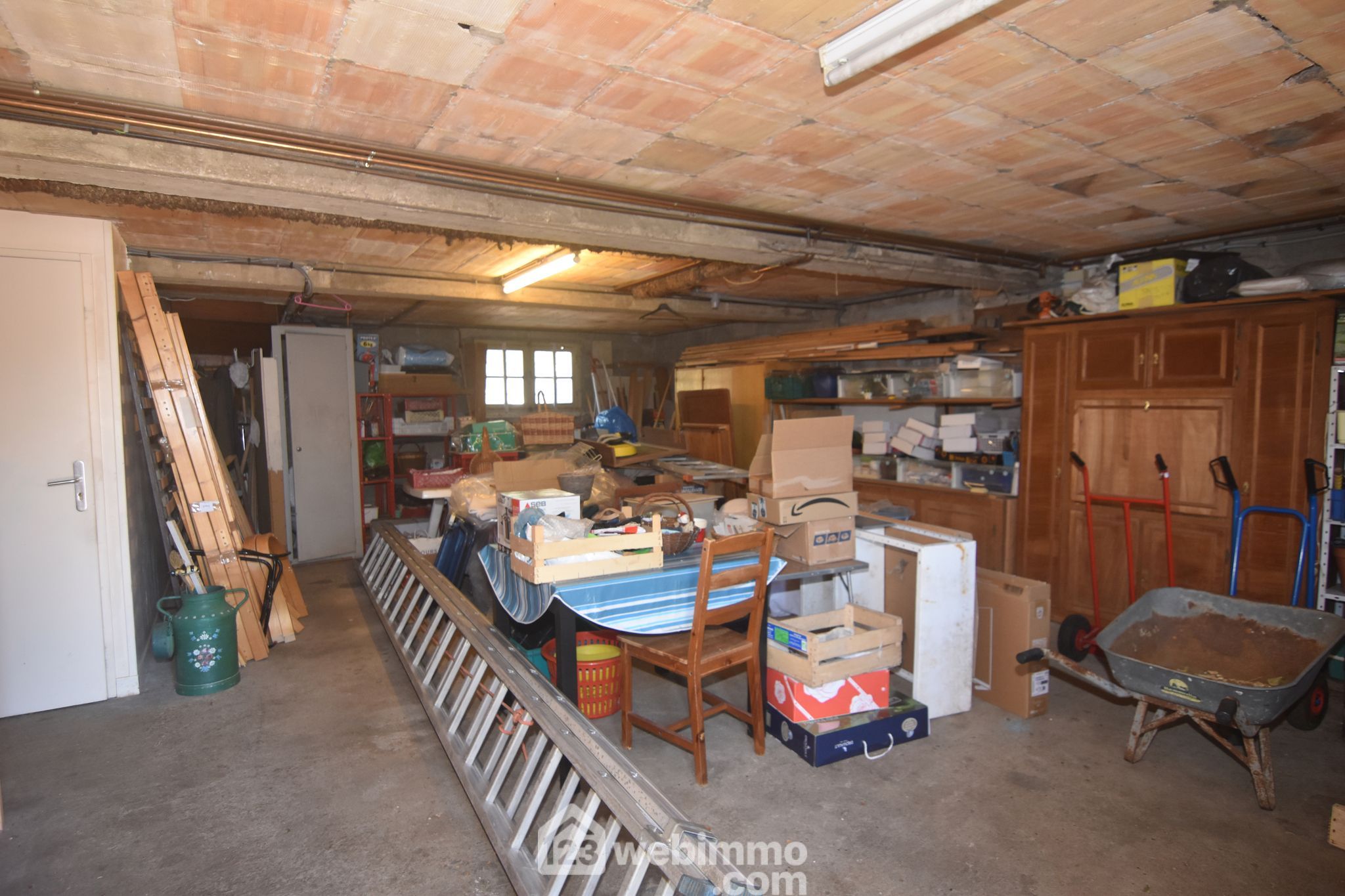 Sous-sol complet propre et pratique : double garage, buanderie, WC, et accès direct au jardin.