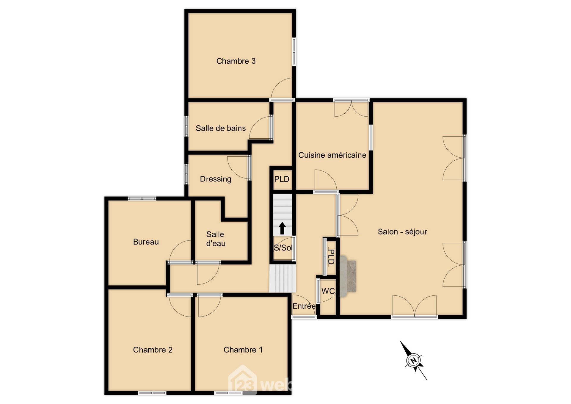 Maison sur sous-sol, 128 m2 habitables, 5 pièces, 3 chambres, bureau, dressing, salle de bains et salle d'eau, garage, terrain 807 m2.