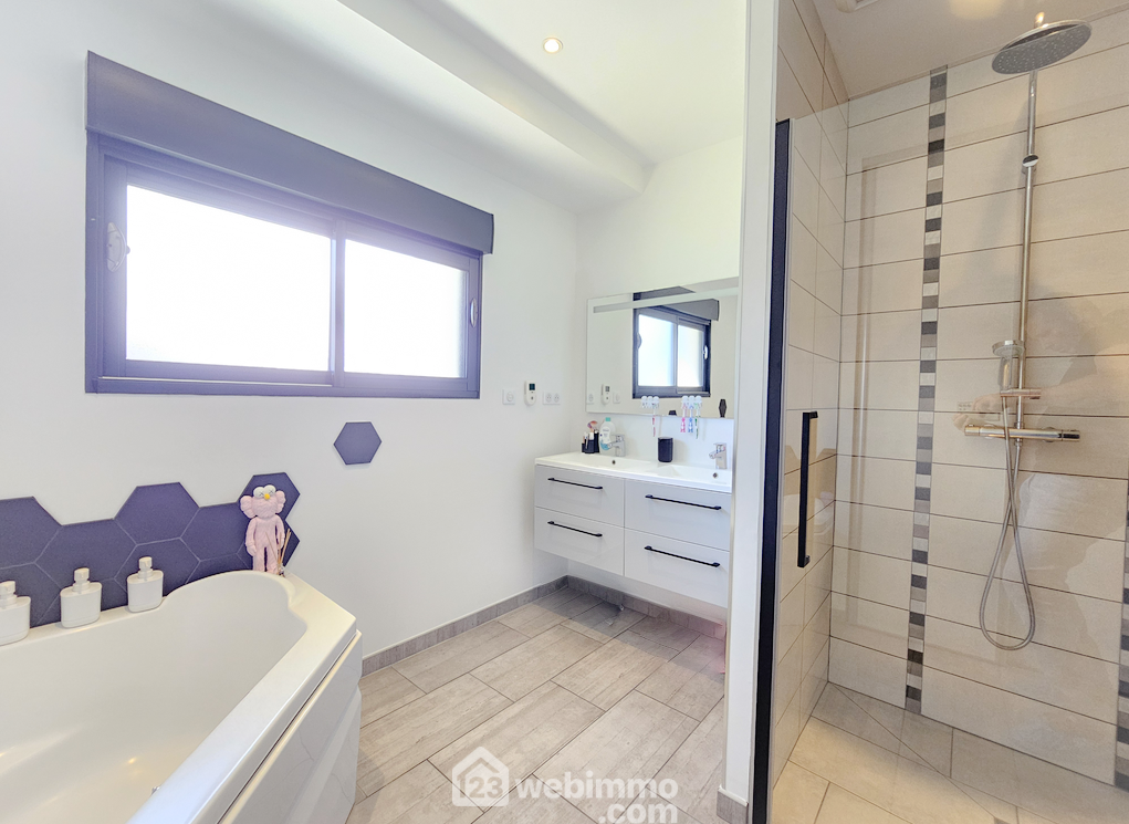 Avec une superficie habitable de 132 m², vous profiterez d’une entrée, un espace de vie très lumineux avec une belle vue sur la piscine et les végétations, une cuisine ouverte qui rayonne directement sur la terrasse, 4 chambres avec placards intégrés, une salle de bains avec douche et baignoire, 2 WC séparés et la pièce indispensable buanderie / cellier offrant de nombreux rangements très pratiques.