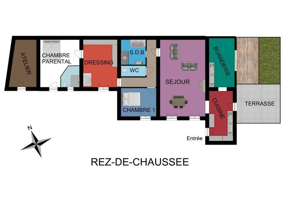 Maison avec vie de plain-pied, 134 m2 habitables, 5 pièces, 3 chambres, sur terrain de 971 m2.