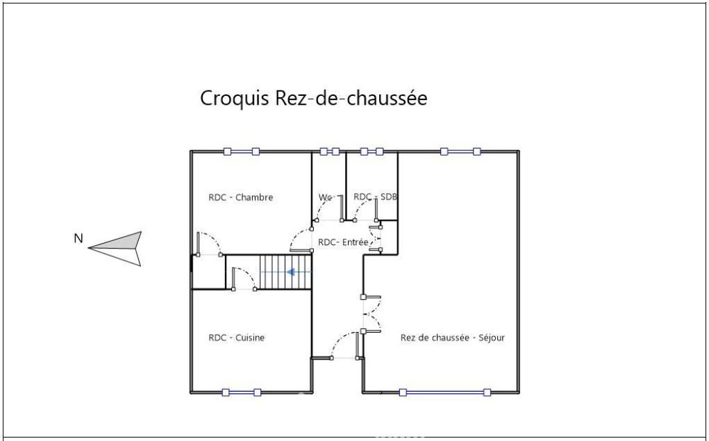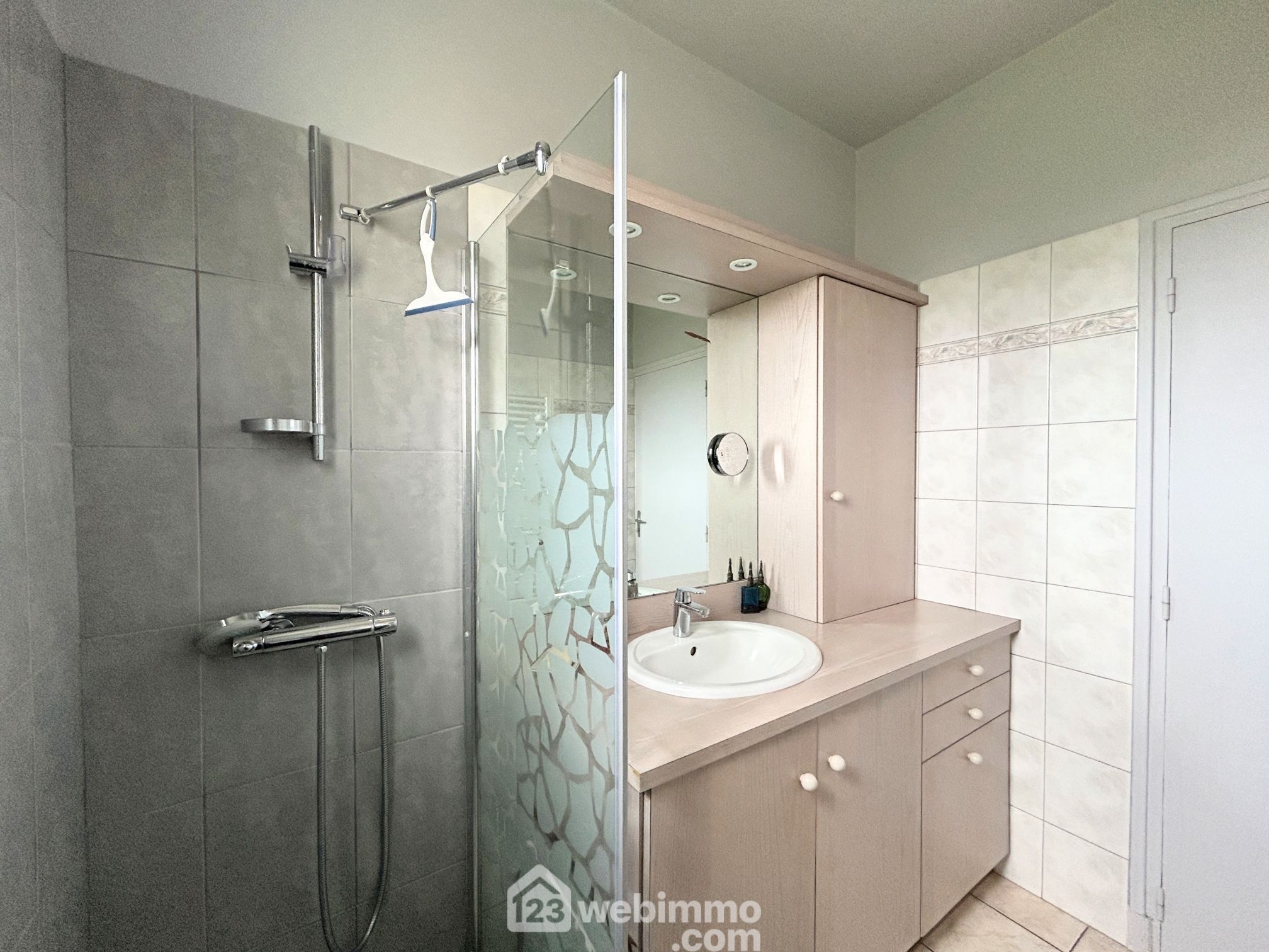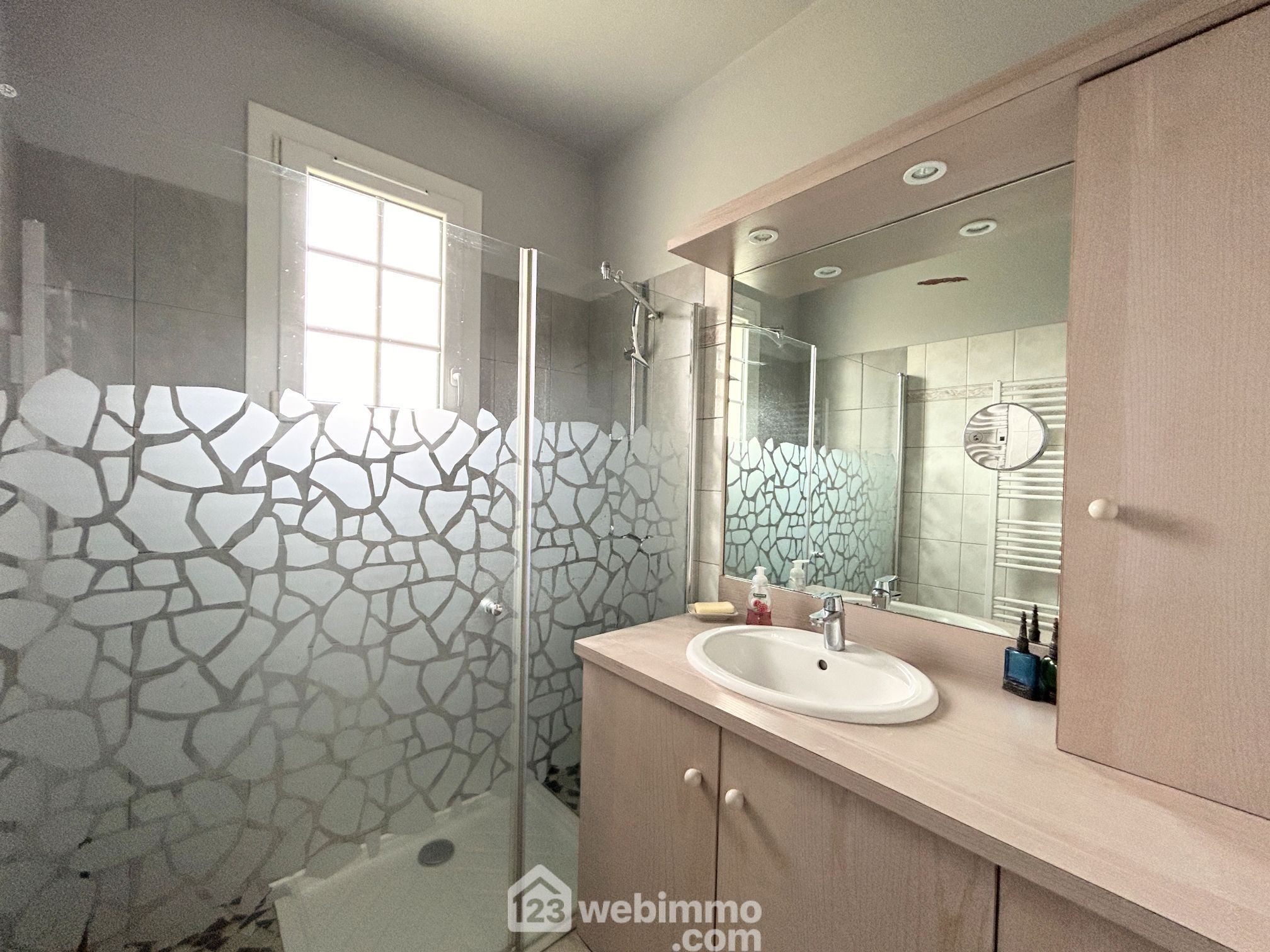 Le rez-de-chaussée surélevé comprend une entrée de 6m2 avec placards desservant une cuisine traditionnelle de 11m2 aménagée et équipée, un salon séjour de 29m2 tourné à l'ouest vers le balcon-terrasse de 15m2, une chambre de 12m2 avec placards intégrés. Une salle de bains de 4m2 avec sèche-serviettes et un WC séparé avec lave-mains complètent ce niveau.