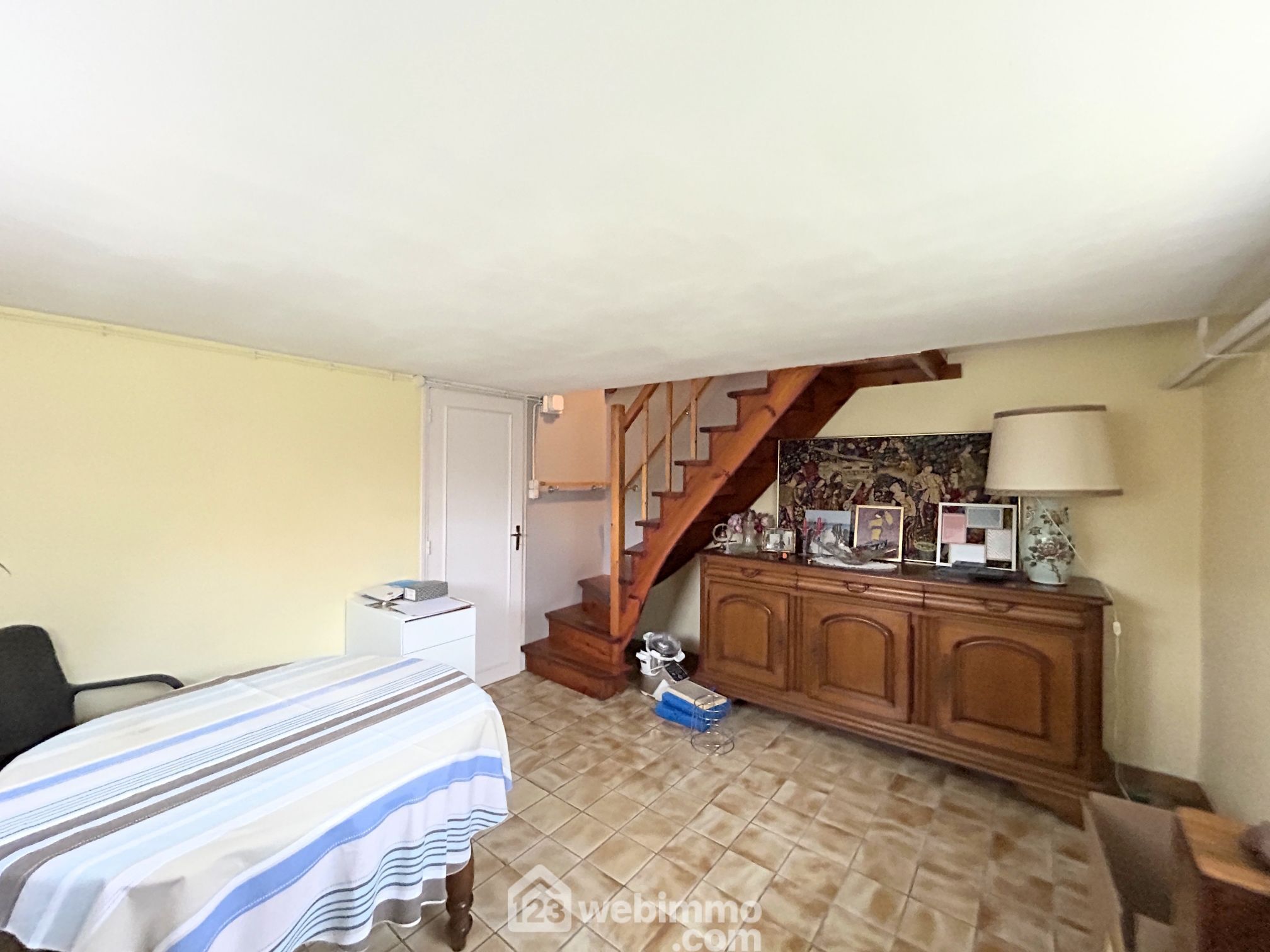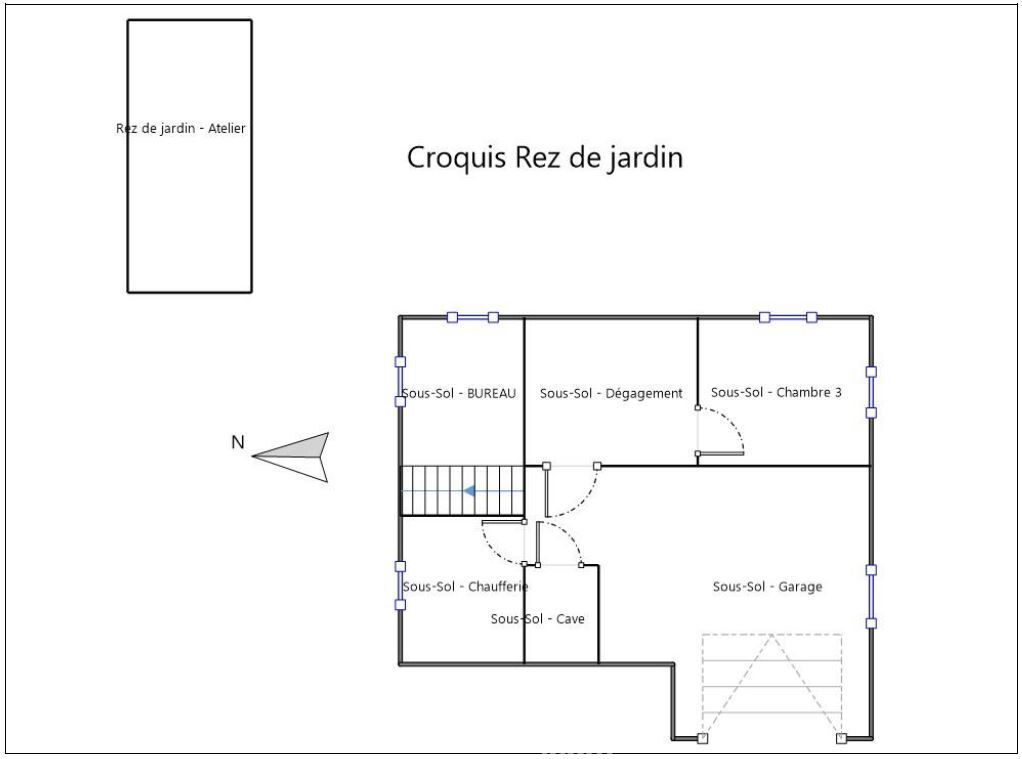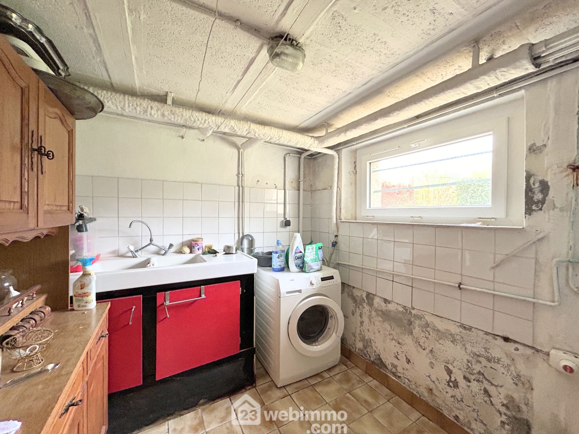 La maison dispose également d'un sous-sol total de 65m2 utiles, accessible par la cuisine. Ce dernier est divisé en un espace garage de 28m2, une chaufferie-buanderie avec évier de 6,5m2, une cave de 3m2, un bureau de 14m2, un dégagement de 6m2 et une chambre avec lavabo de 12,5m2.