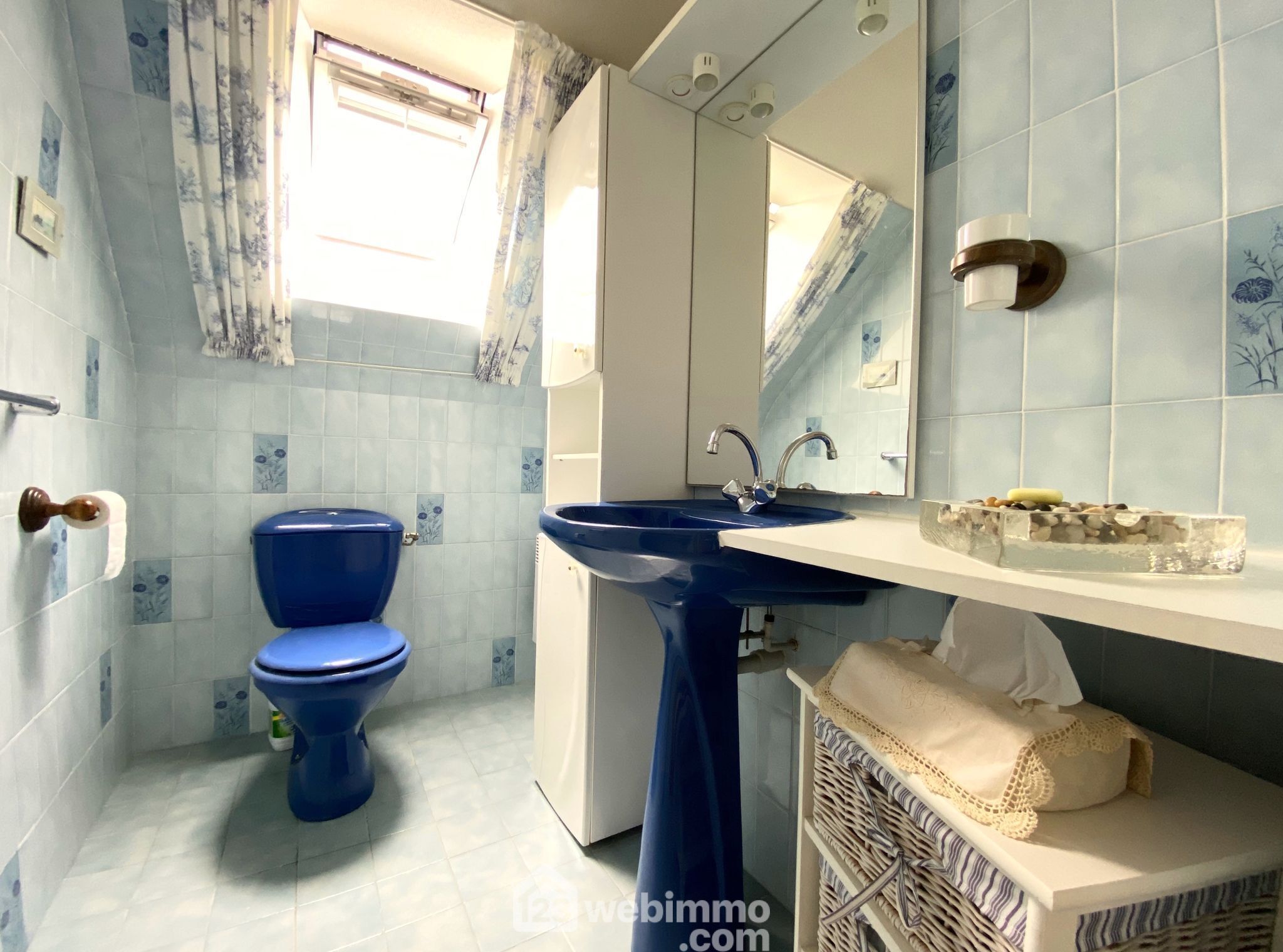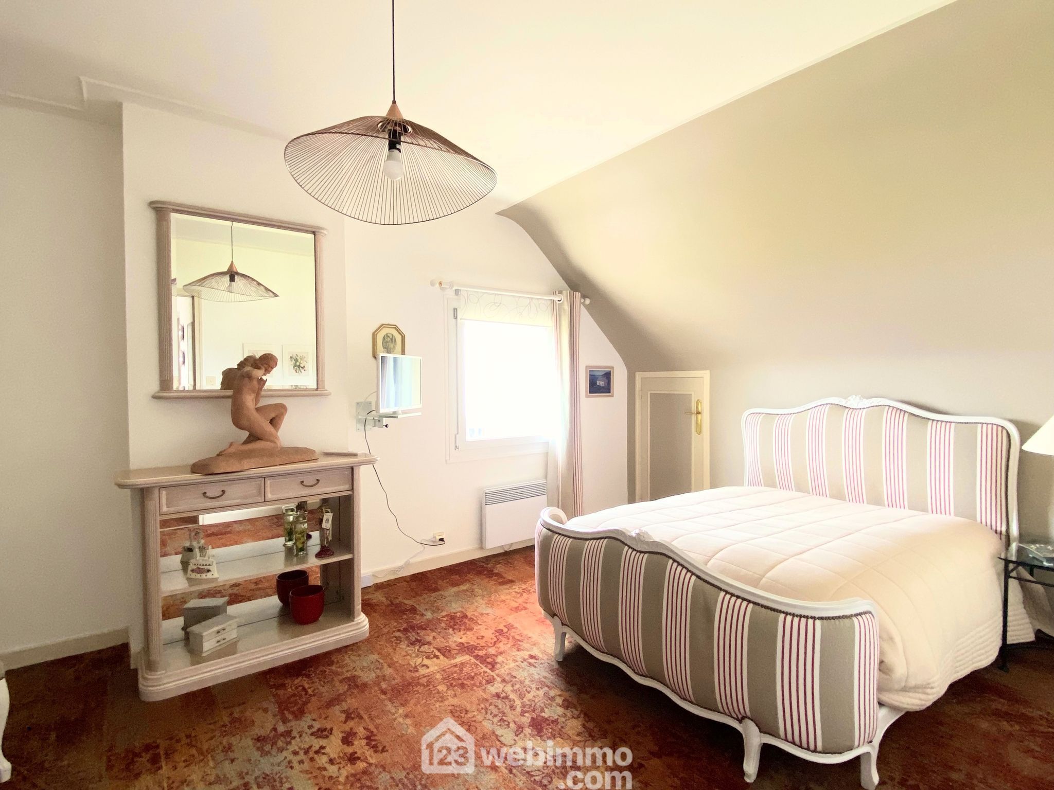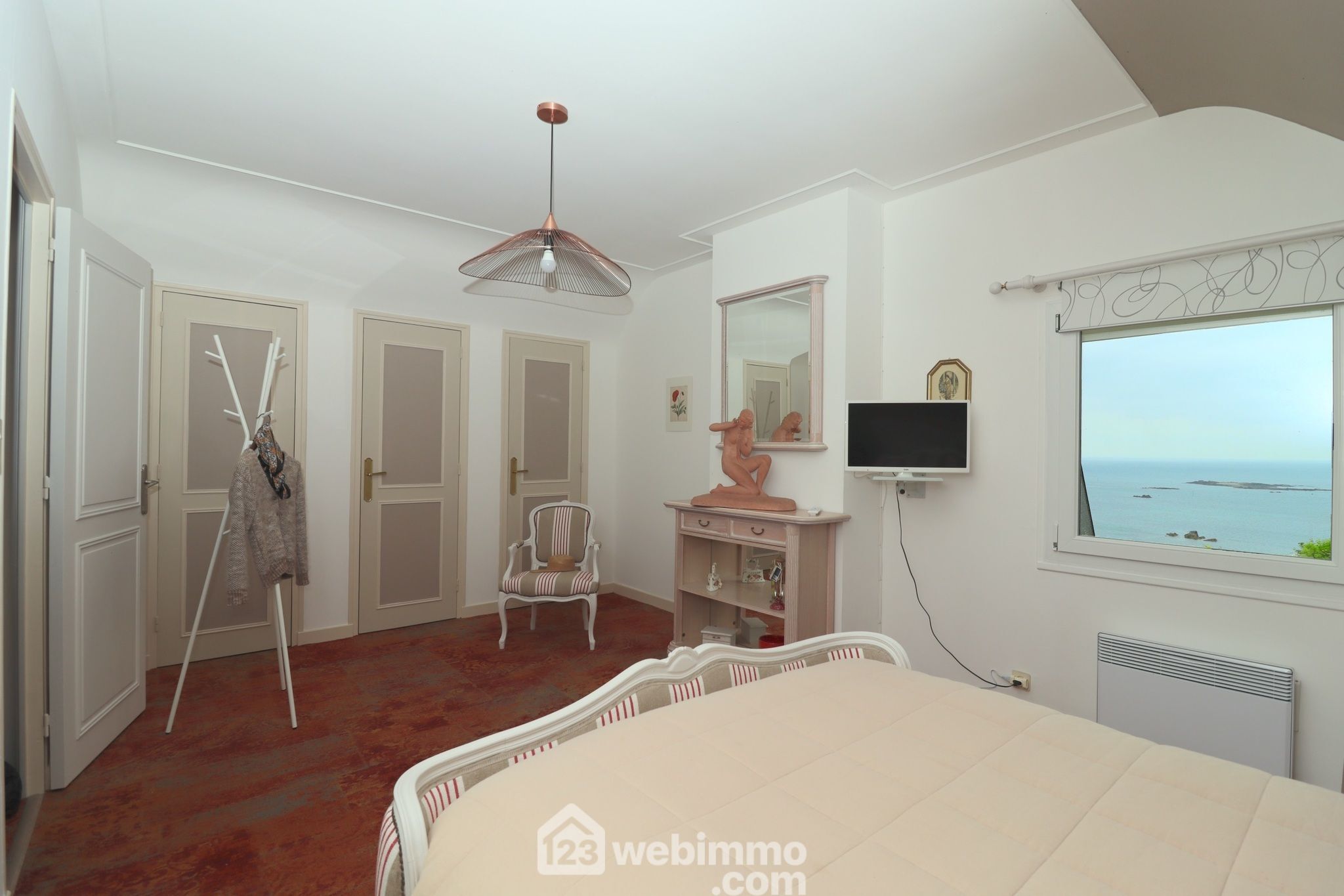 La maison comprend 3 niveaux: Le rez-de-chaussée s'ouvre sur une grande entrée desservant un salon/salle à manger de 30m2 avec vue mer et une cheminée avec insert, prolongé au sud d'une véranda de 16m2, une cuisine aménagée et équipée de 14m2, une grande chambre de 13m2 avec dressing, une salle de douche de 6m2 et un WC séparé.