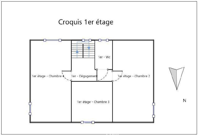 Au 1er étage, sur une dalle béton, un palier de 5m2 dessert 3 chambres de 10, 22 et 23m2 au sol dont une avec vue mer. Un cabinet de toilette de 3m2 avec WC complète ce niveau.