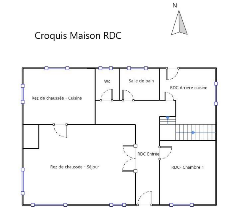 Cette maison comprend, au rez-de-chaussée, une entrée desservant un séjour de 29m², une cuisine de 13 m², un WC séparé, une salle de douche de 5 m², une chambre de 11 m² et une arrière-cuisine de 12 m² avec un accès à l’extérieur.