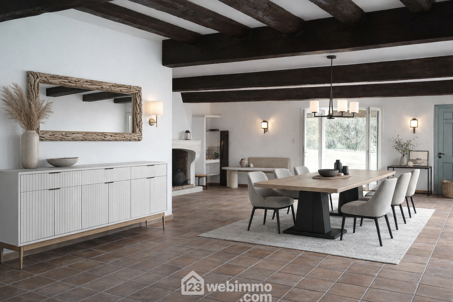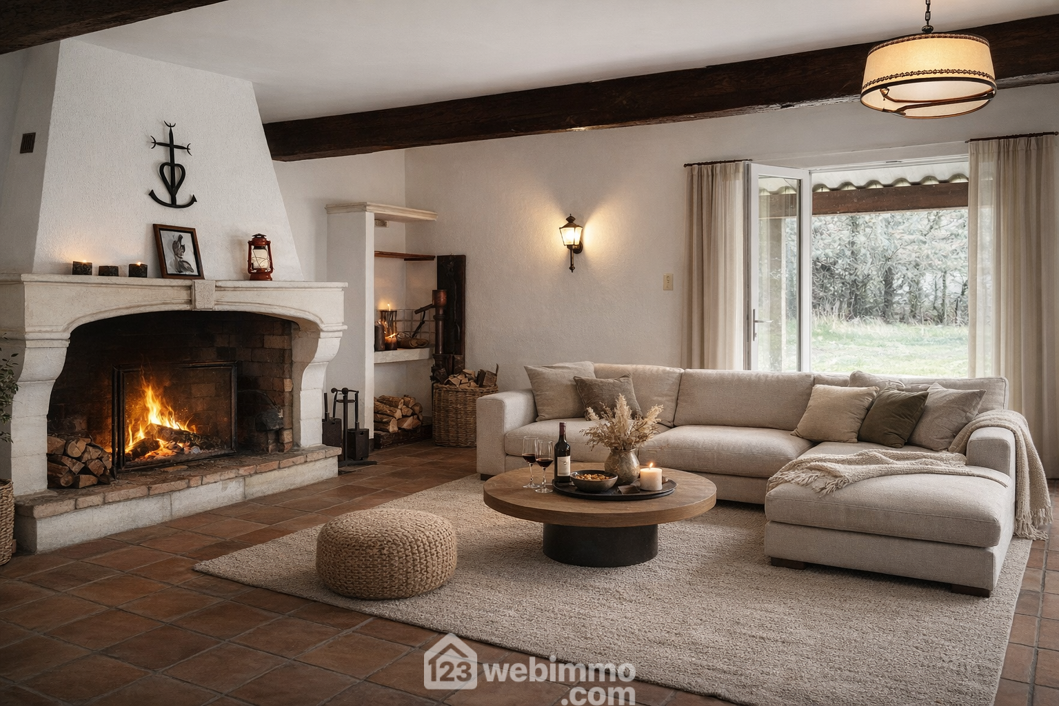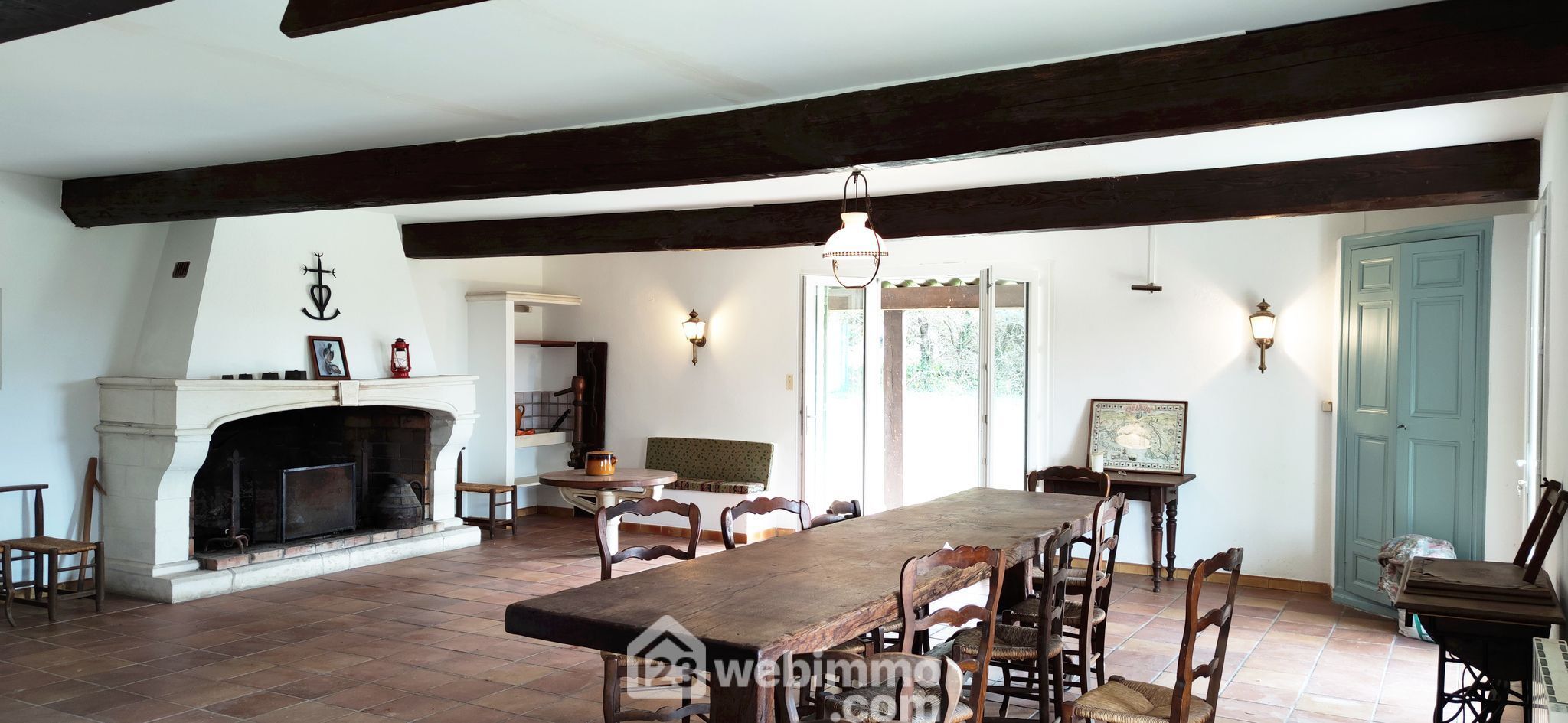Elément majeur de la maison, sa pièce de vie exceptionnelle de 75m² avec vue sur la propriété, est équipée d'une cheminée en pierre de taille.