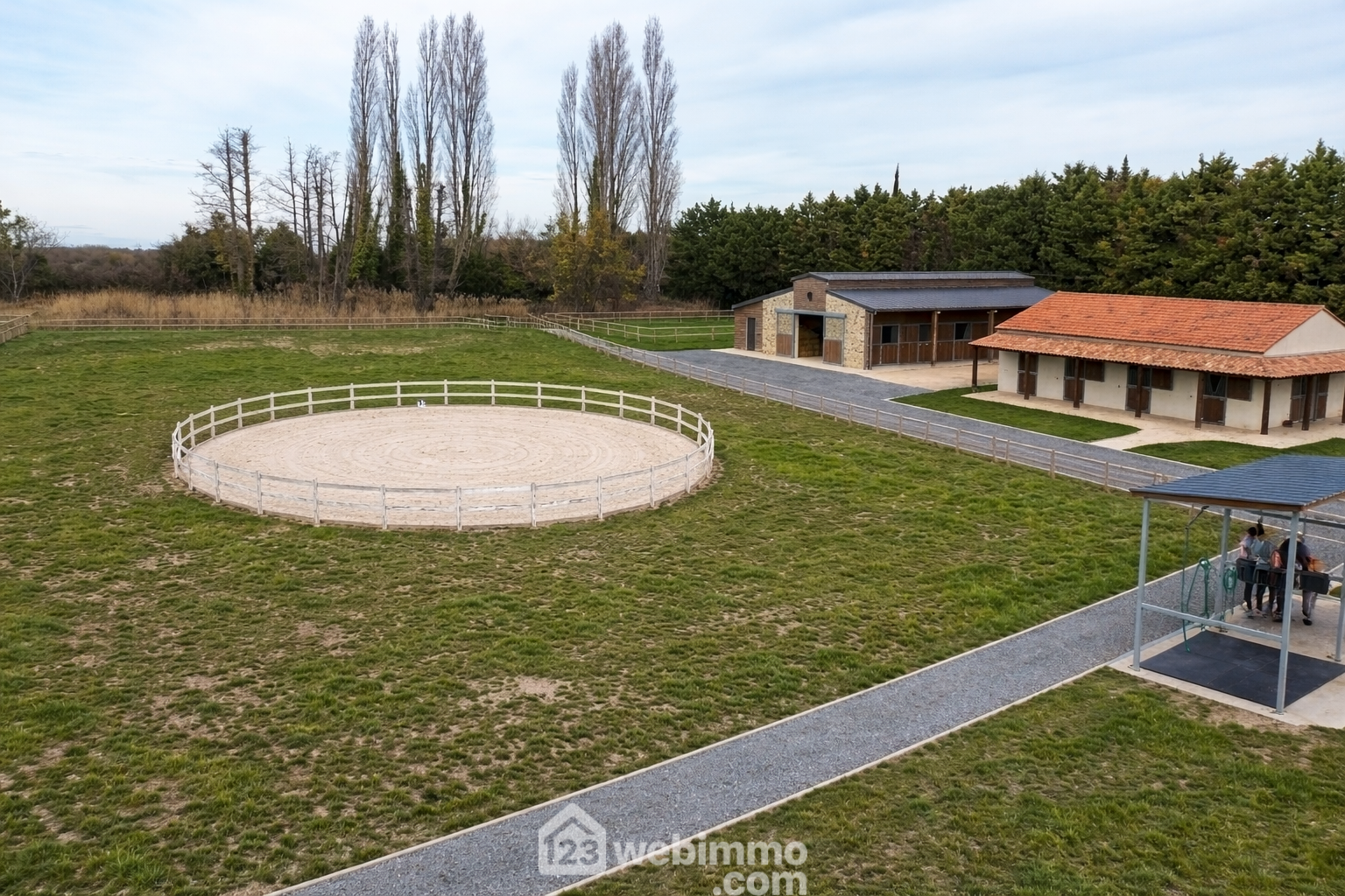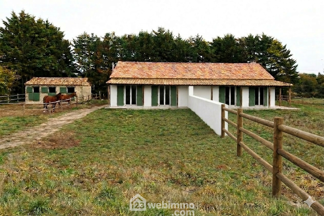 Nous vous proposons 3 photos générés I.A. (intelligence artificielle) avec une projection réalisable, une photo avec une piscine, une photo avec deux chevaux, une photo avec pièce de vie moderne.