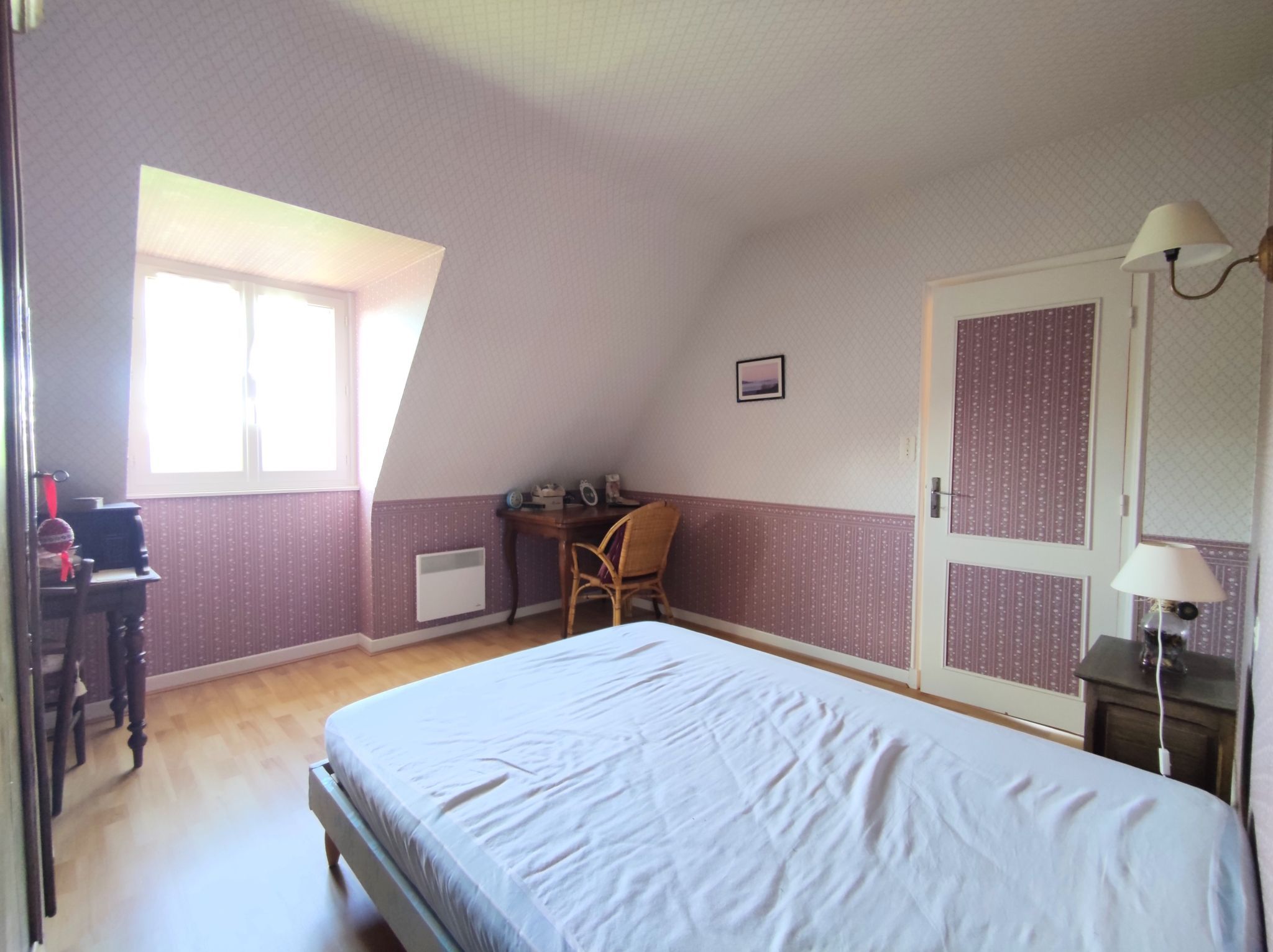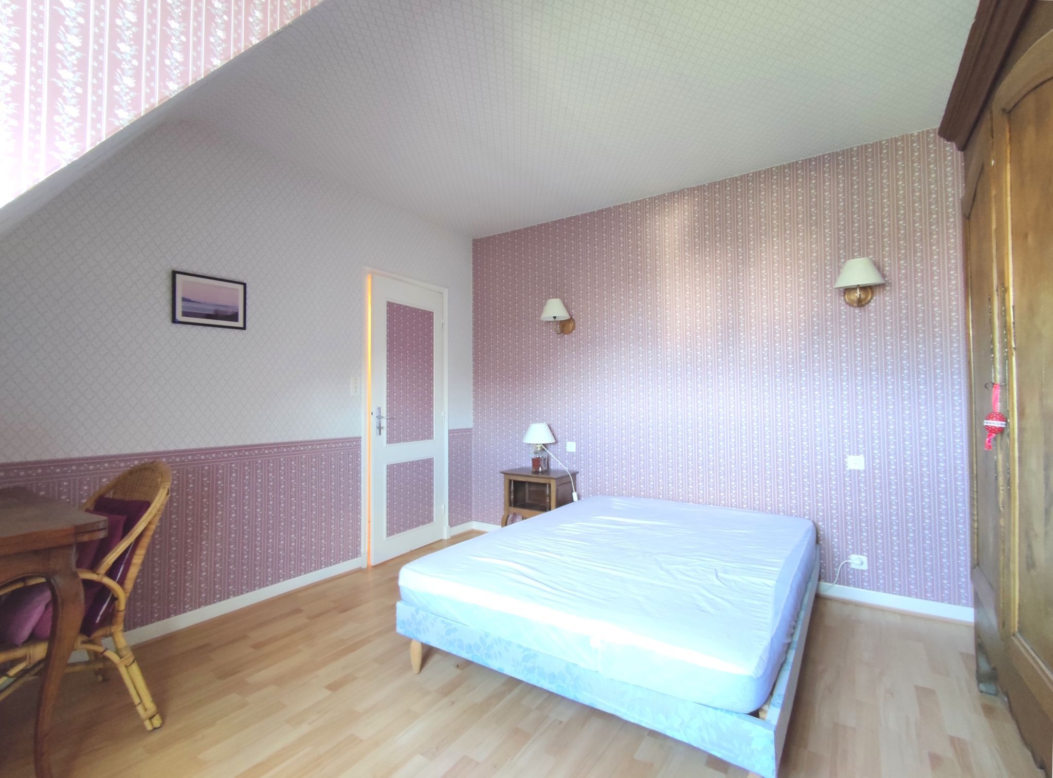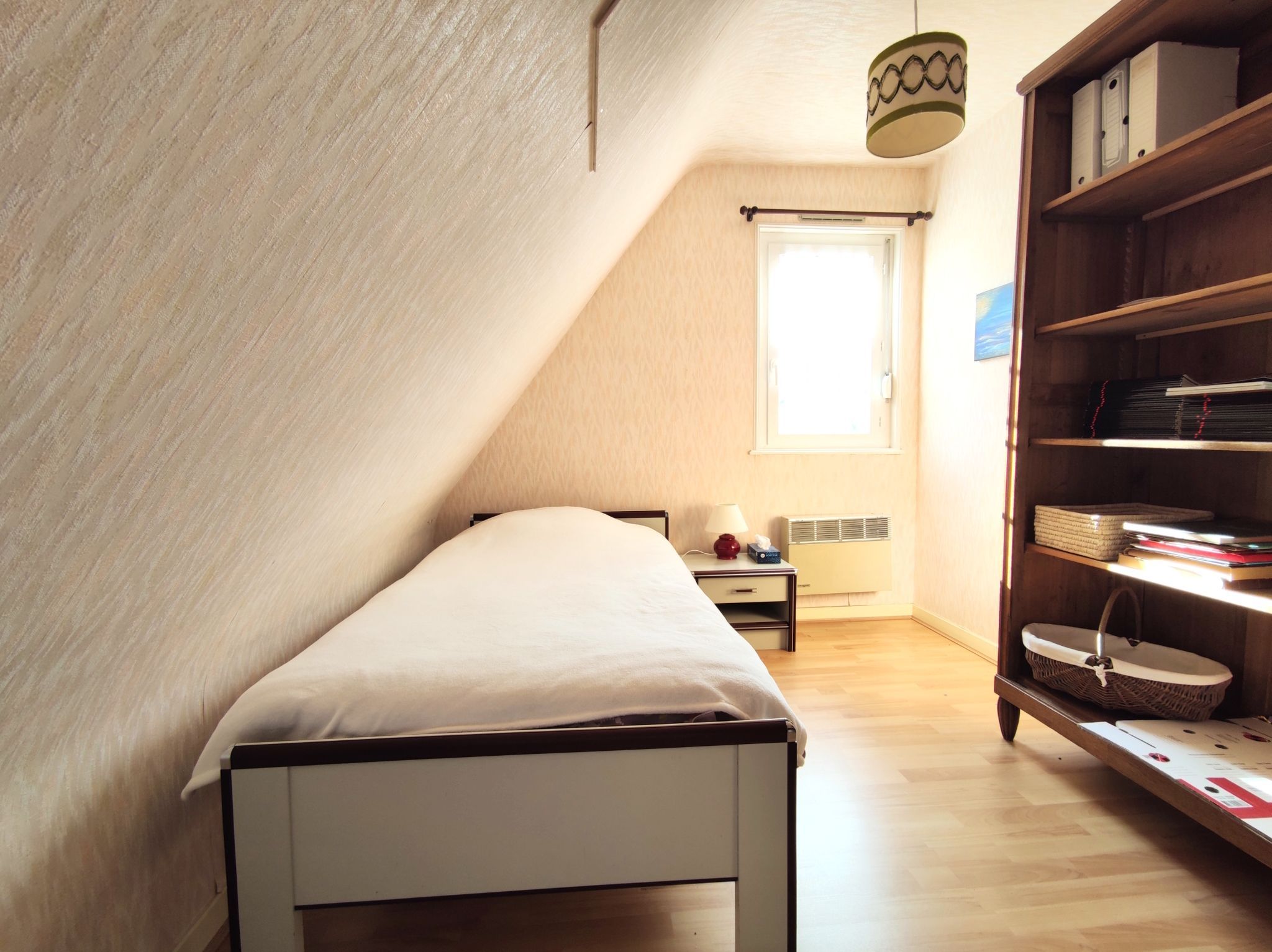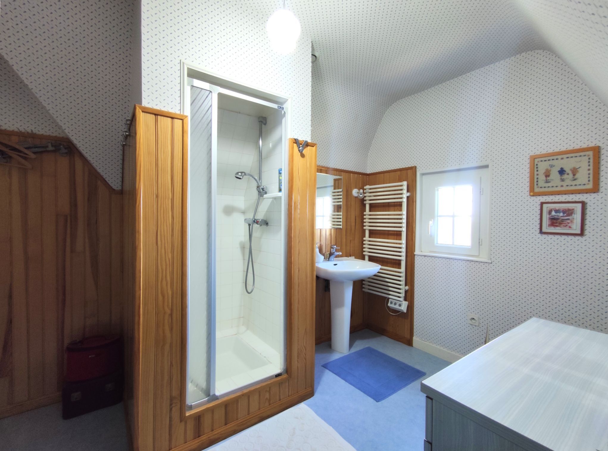 A l'étage, sur une dalle béton de 54m2 habitables, un palier et un couloir desservent 1 chambre mansardée de 10m2 au sol avec placard intégré, 2 chambres de 13 et 11m2 avec vue mer, un espace nuit / bureau sous rampants de 8m2 au sol, une salle de douche avec placards intégrés et un WC séparé.