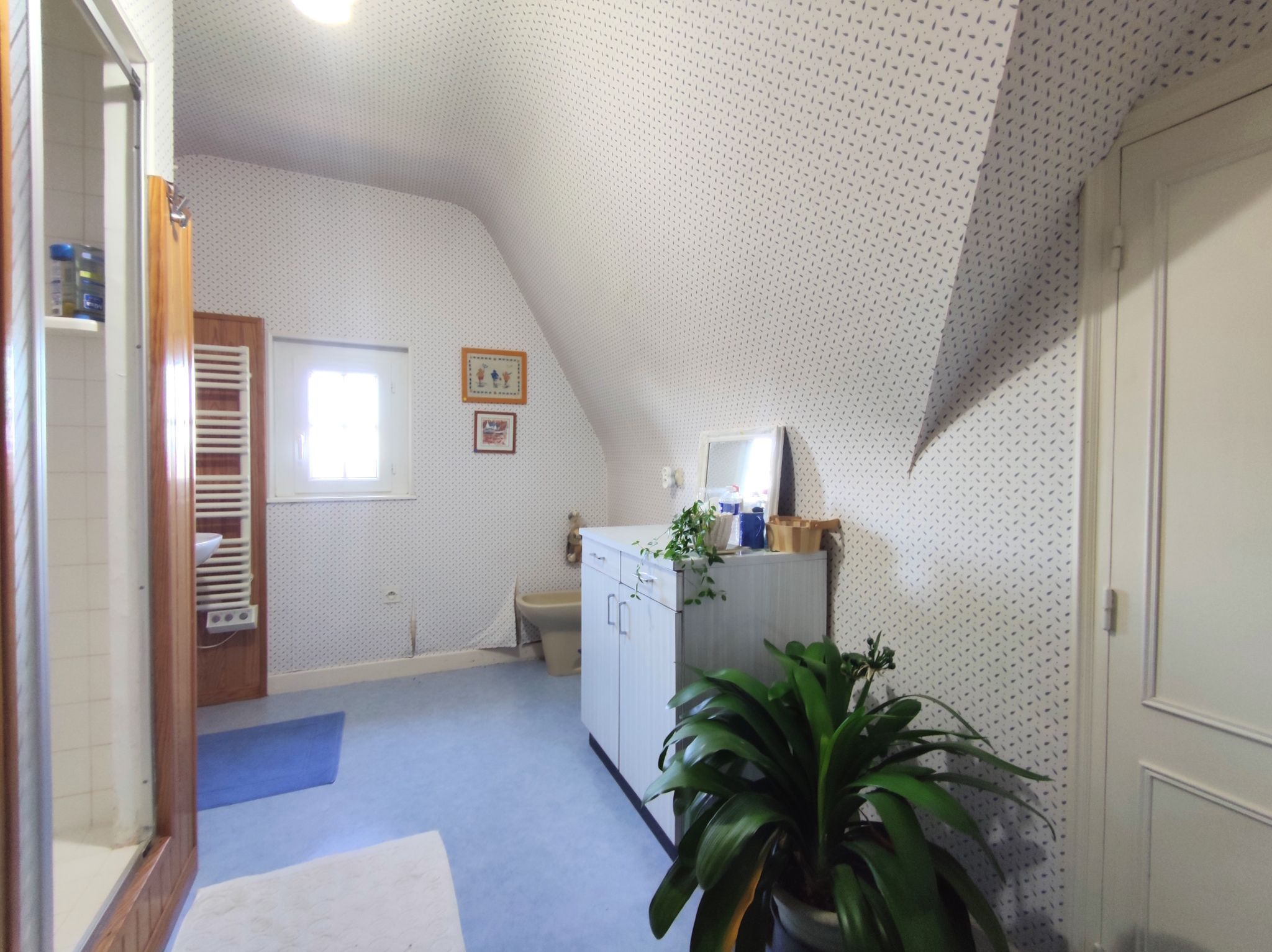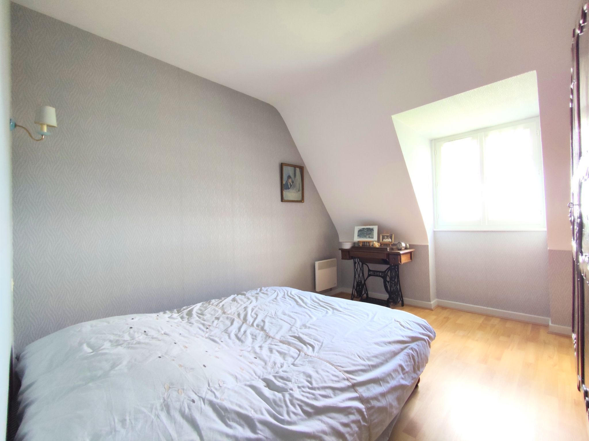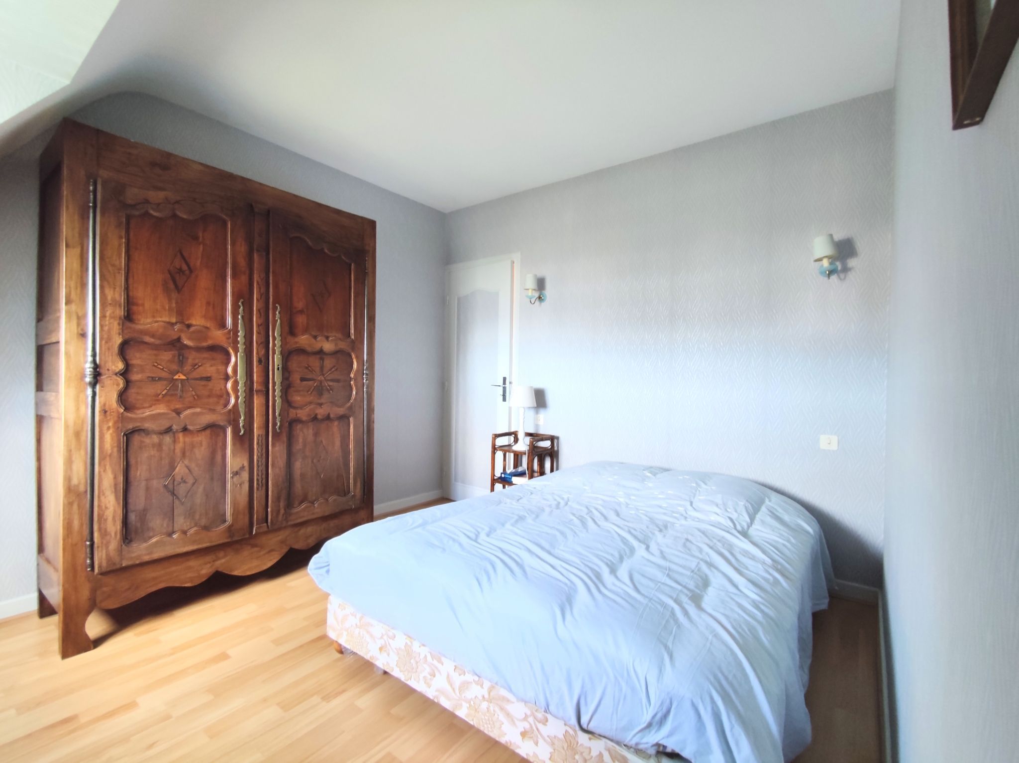 A l'étage, sur une dalle béton de 54m2 habitables, un palier et un couloir desservent 1 chambre mansardée de 10m2 au sol avec placard intégré, 2 chambres de 13 et 11m2 avec vue mer, un espace nuit / bureau sous rampants de 8m2 au sol, une salle de douche avec placards intégrés et un WC séparé.