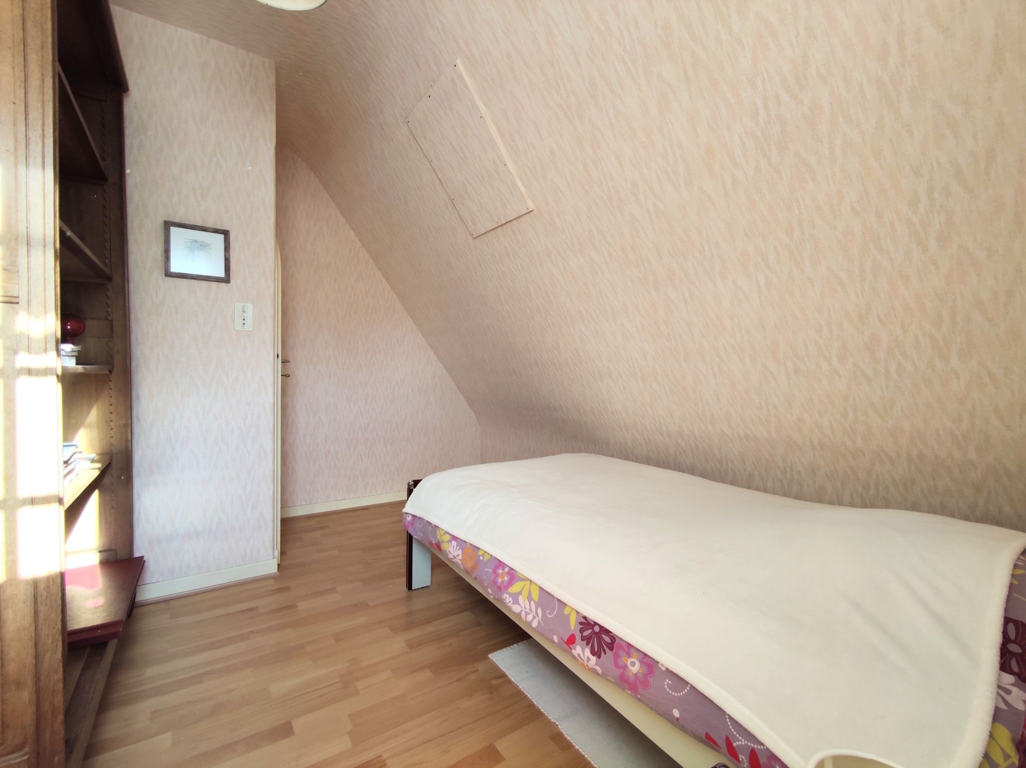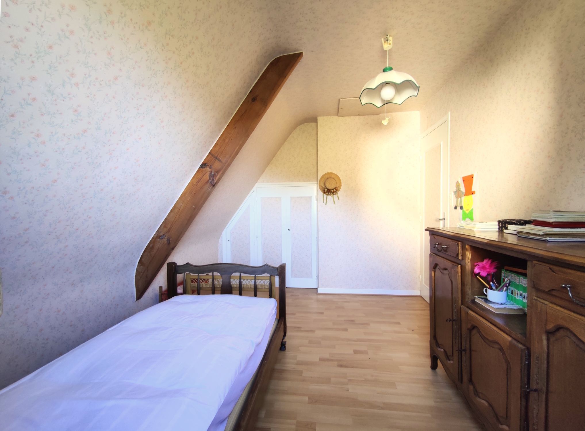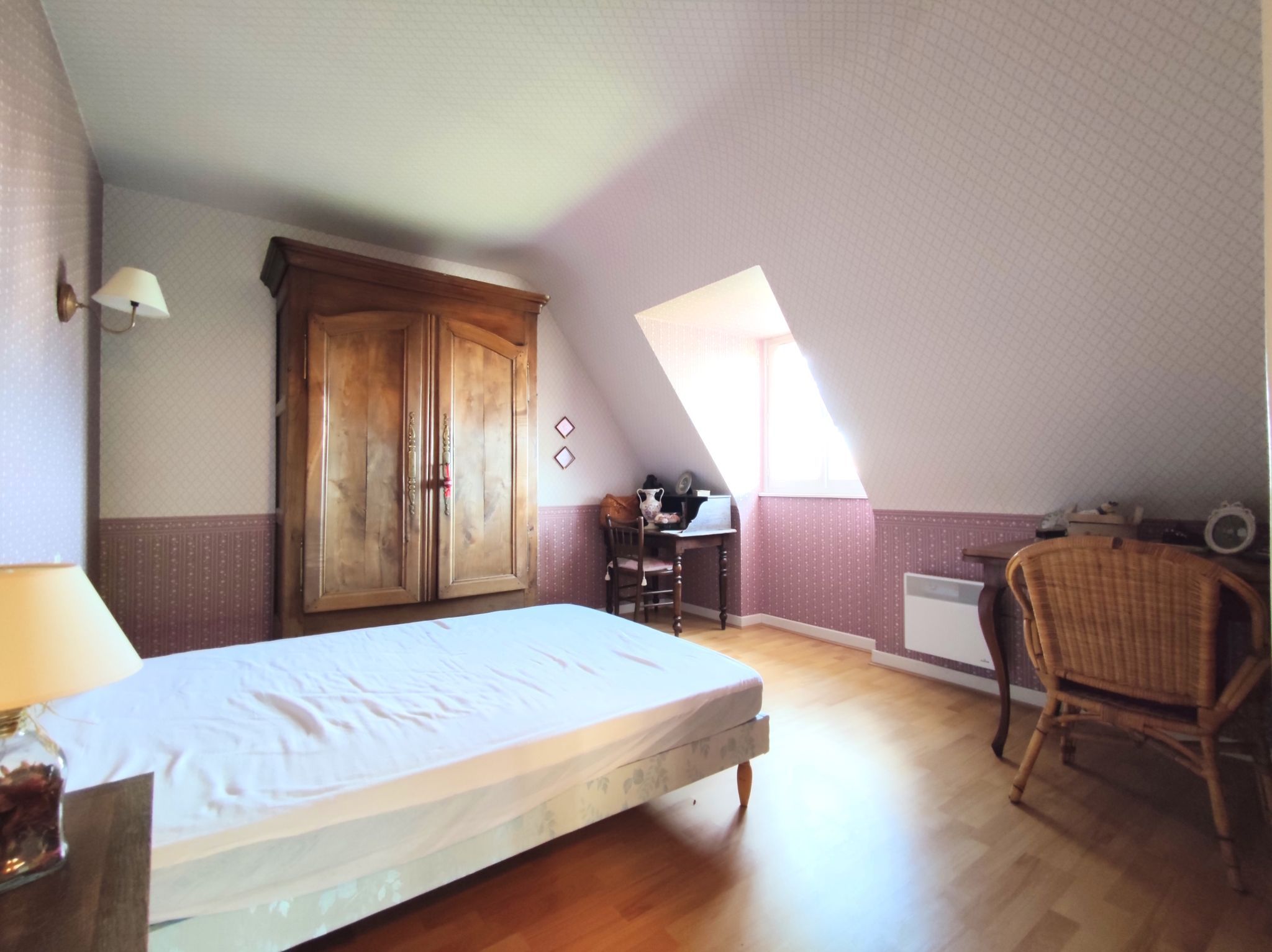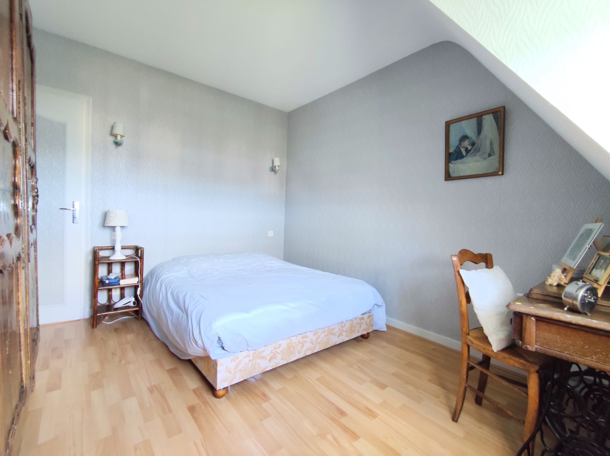 A l'étage, sur une dalle béton de 54m2 habitables, un palier et un couloir desservent 1 chambre mansardée de 10m2 au sol avec placard intégré, 2 chambres de 13 et 11m2 avec vue mer, un espace nuit / bureau sous rampants de 8m2 au sol, une salle de douche avec placards intégrés et un WC séparé.
