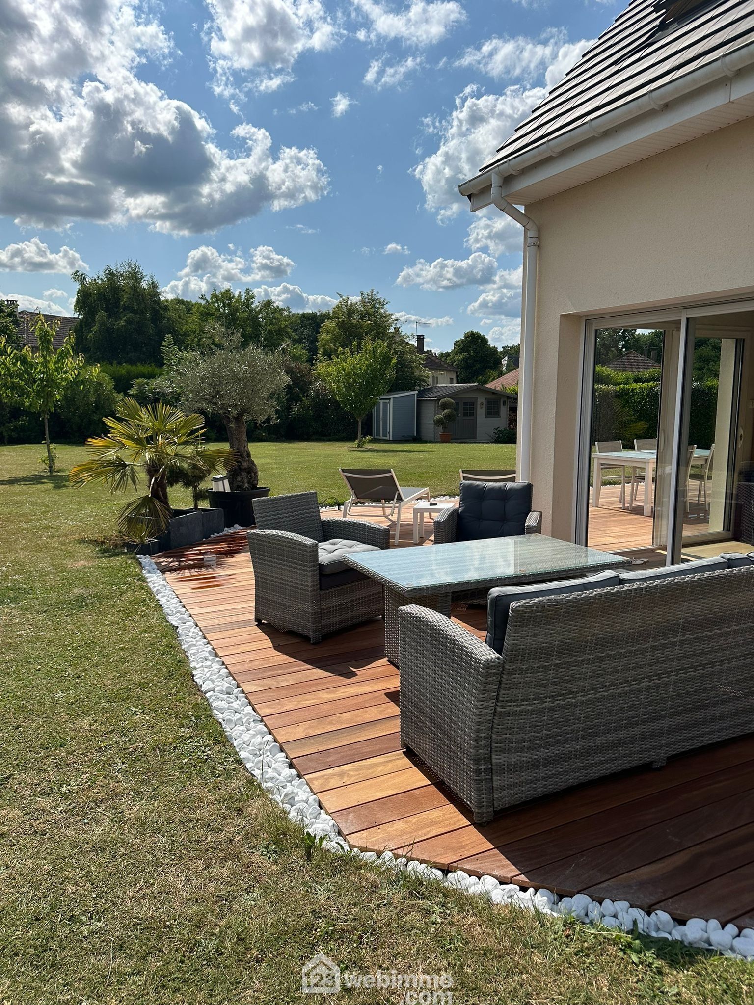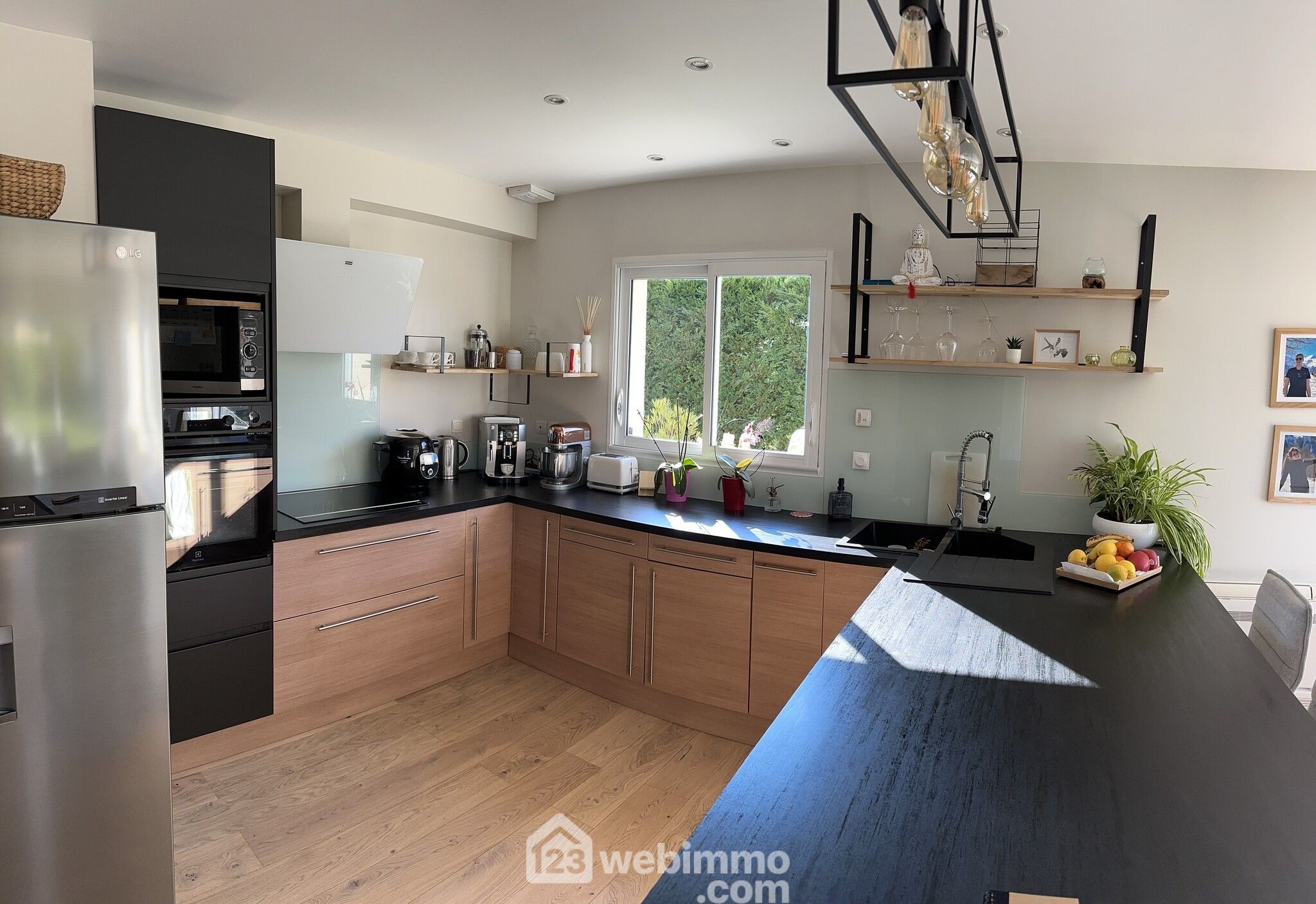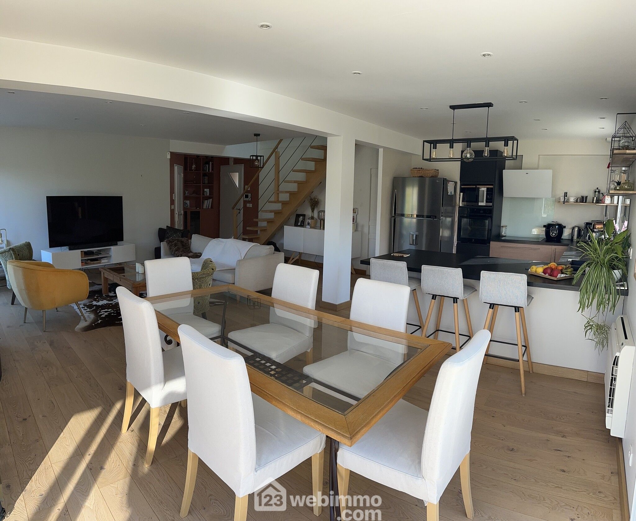 Un grand salon - salle à manger avec un poêle à bois contemporain. Les nombreuses baies vitrées offrent à cette pièce de vie une très belle luminosité et donnent sur une magnifique terrasse neuve de 66m2 en bois exotique (Cumaru) face au jardin côté sud/est. Une cuisine ouverte équipée intégralement, 1 chambre et sa salle de douche attenante, 1 bureau, 1 chaufferie/laverie et 1 wc.