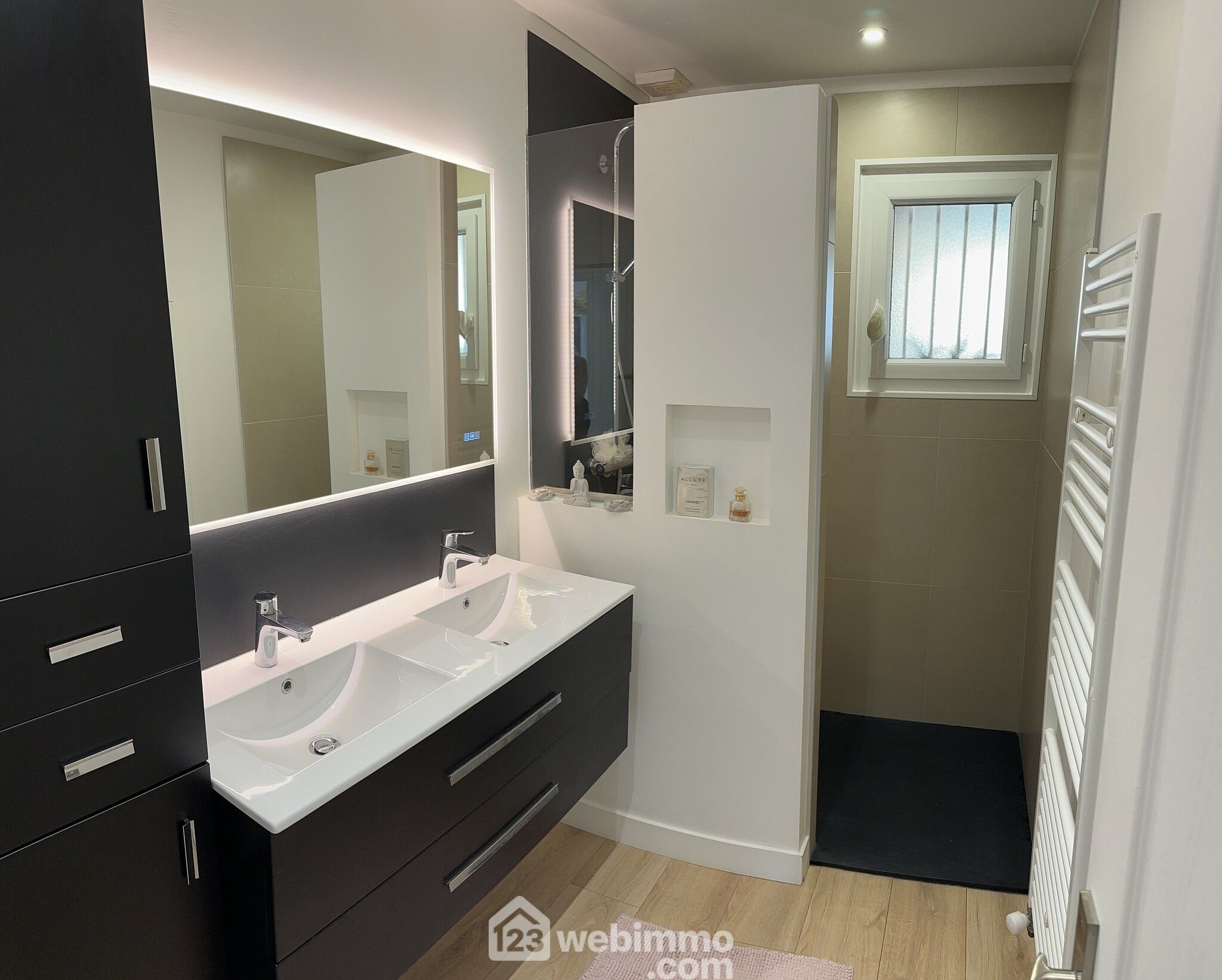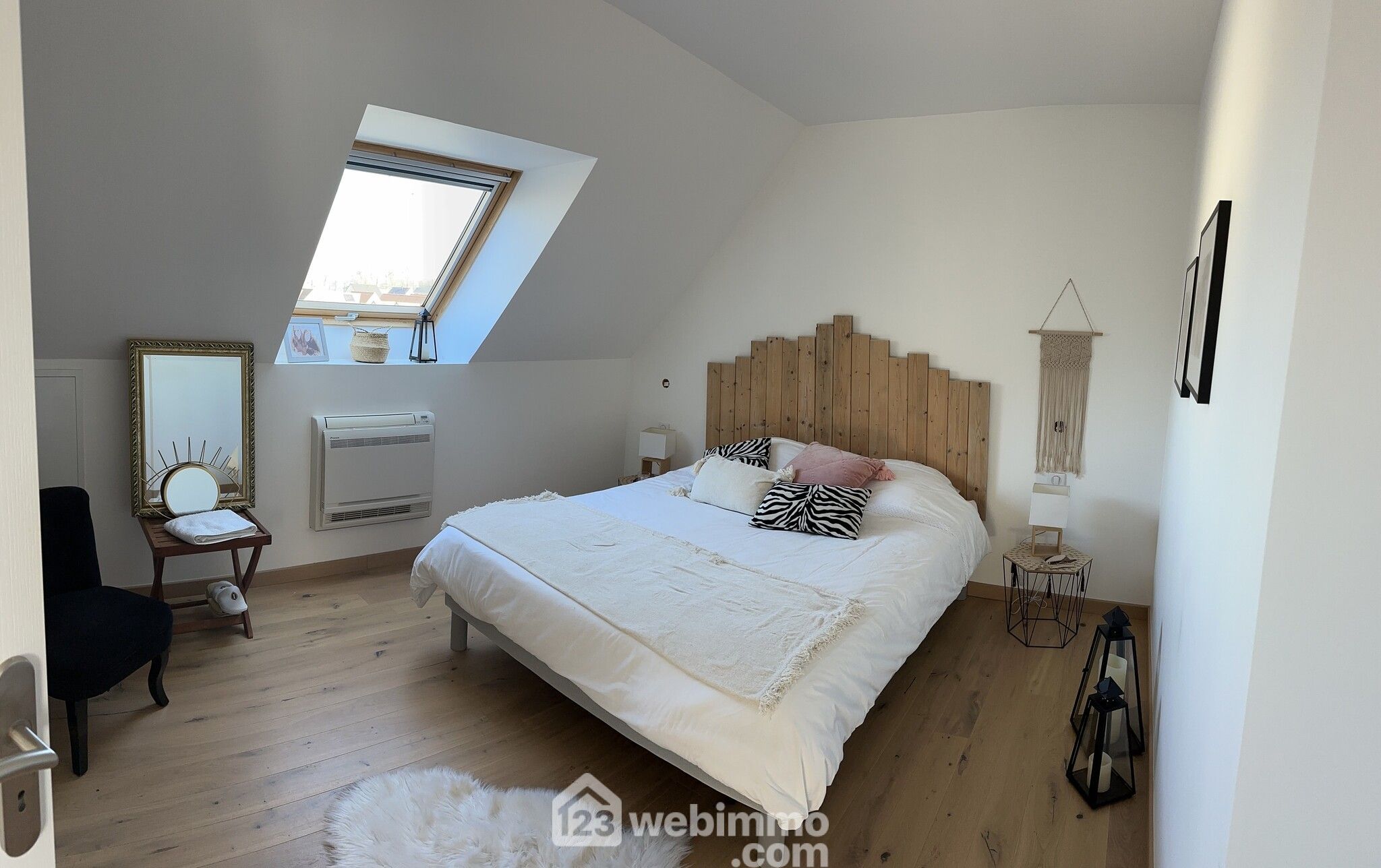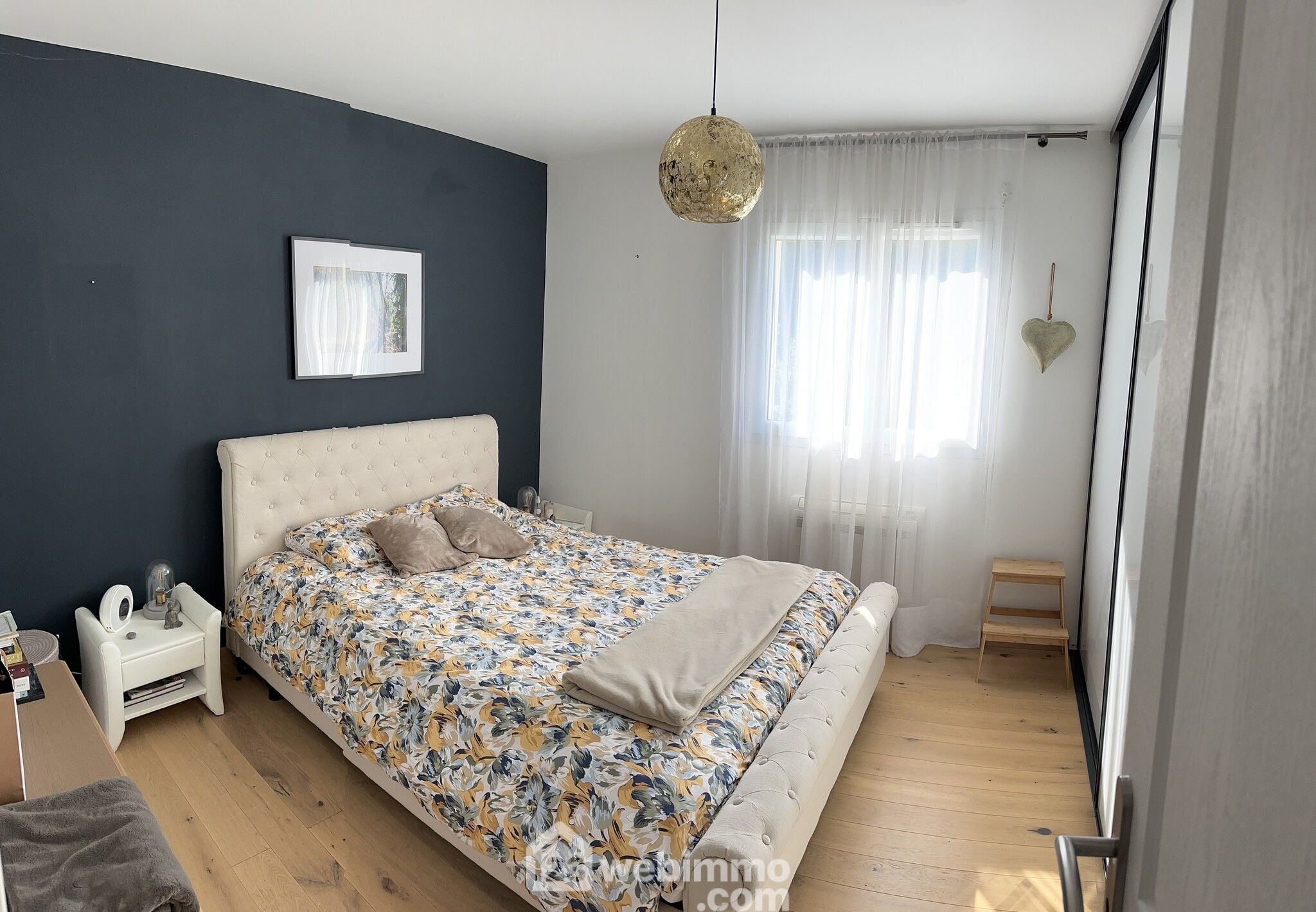 Un grand salon - salle à manger avec un poêle à bois contemporain. Les nombreuses baies vitrées offrent à cette pièce de vie une très belle luminosité et donnent sur une magnifique terrasse neuve de 66m2 en bois exotique (Cumaru) face au jardin côté sud/est. Une cuisine ouverte équipée intégralement, 1 chambre et sa salle de douche attenante, 1 bureau, 1 chaufferie/laverie et 1 wc.