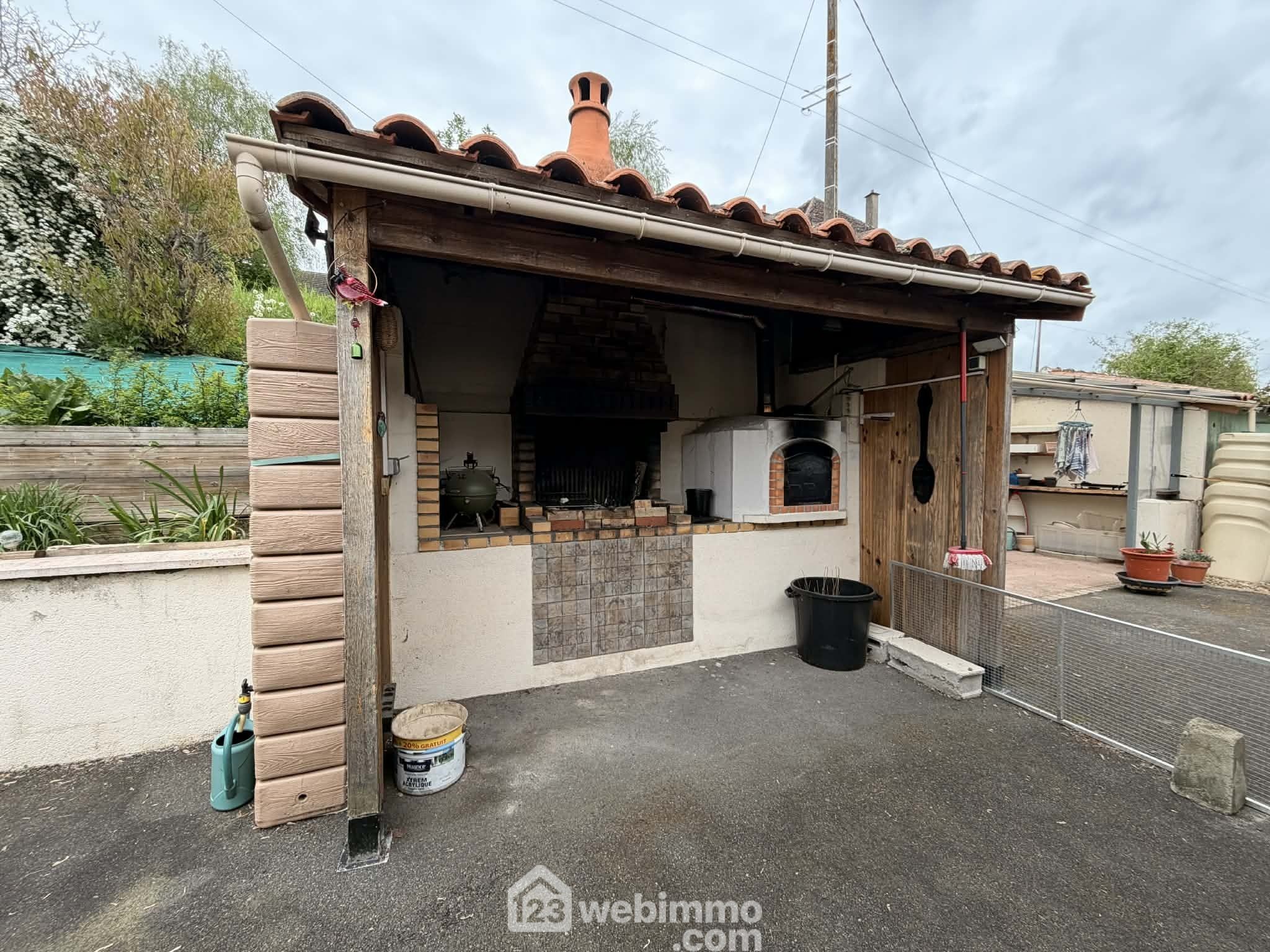A l'extérieur : partie gazonnée à l'avant et cour partiellement gravillonnée et goudronnée à l'arrière avec un barbecue, un four à pizza et différentes petites annexes de stockage.