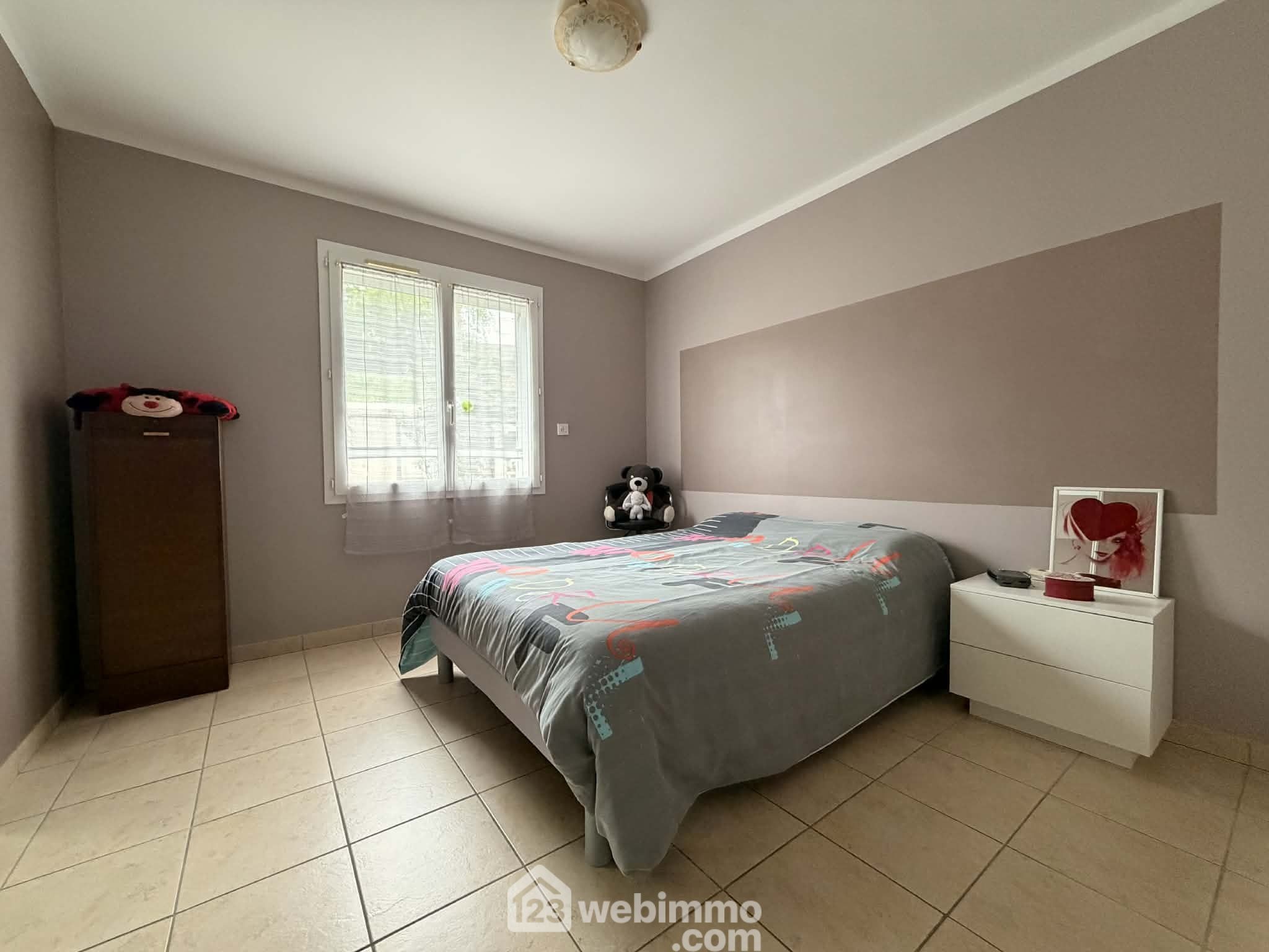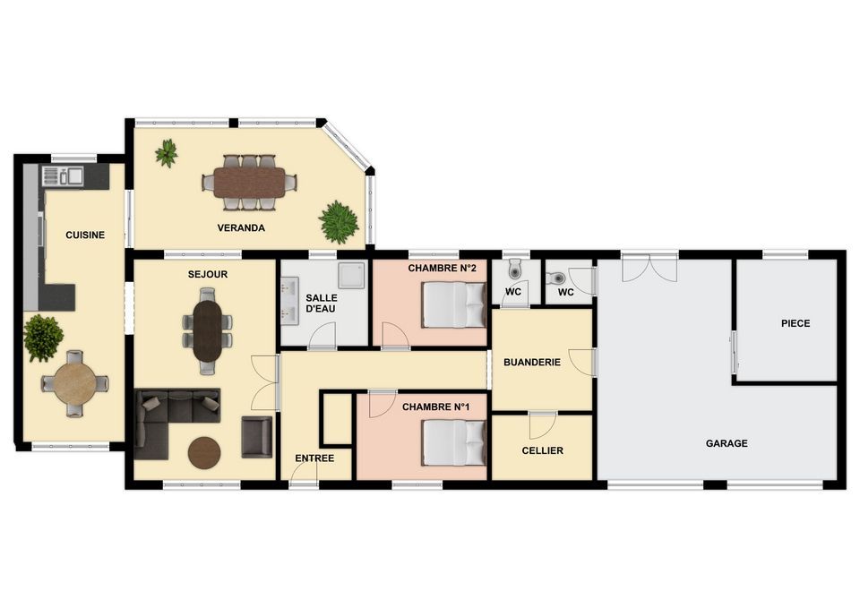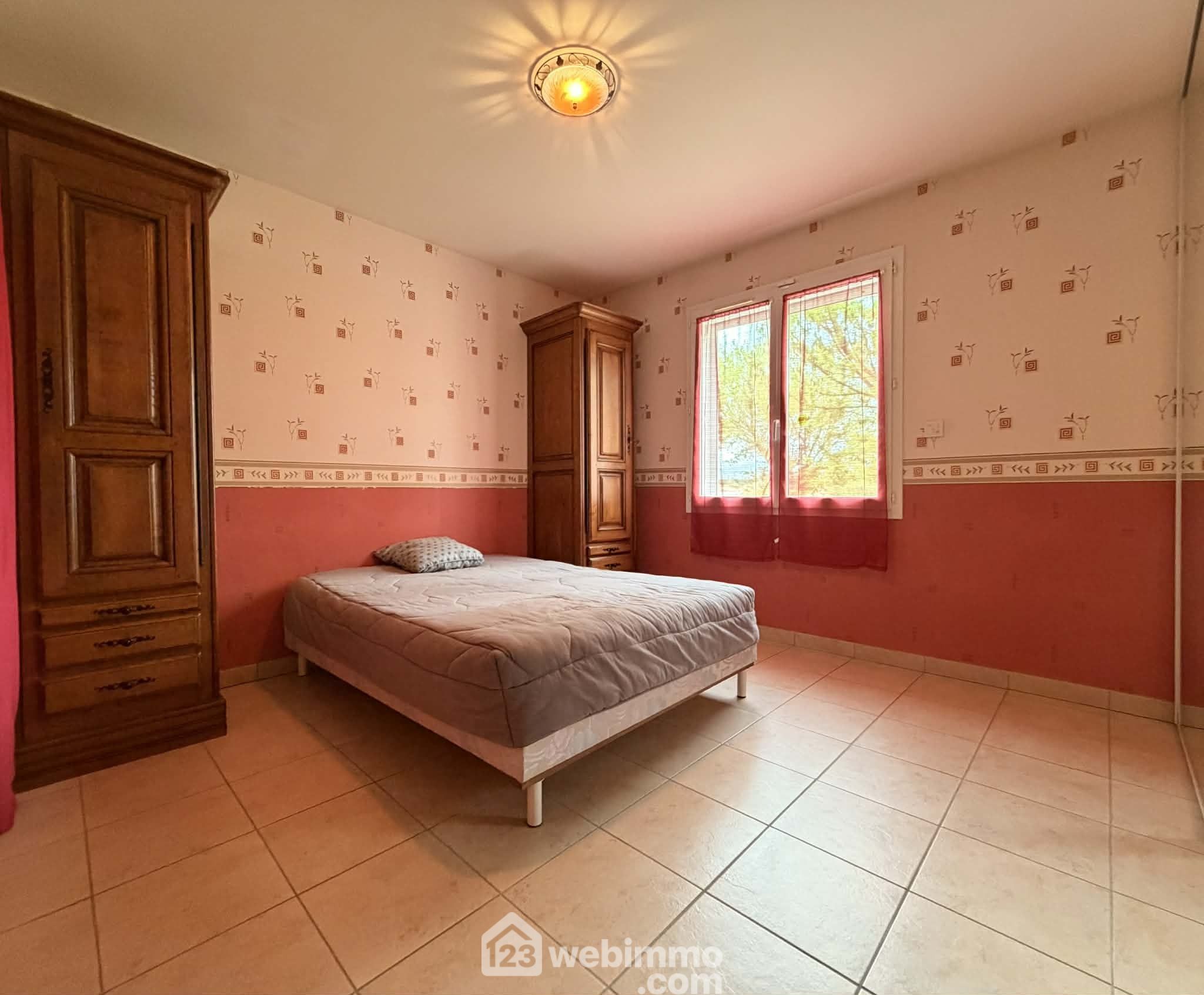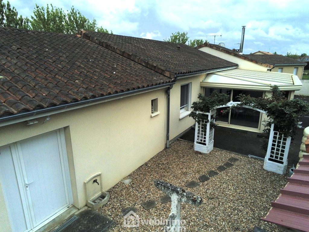 Maison de plain-pied, 145 m2 habitables, 5 pièces, 2 chambres, véranda, garage sur un terrain de 846 m2.