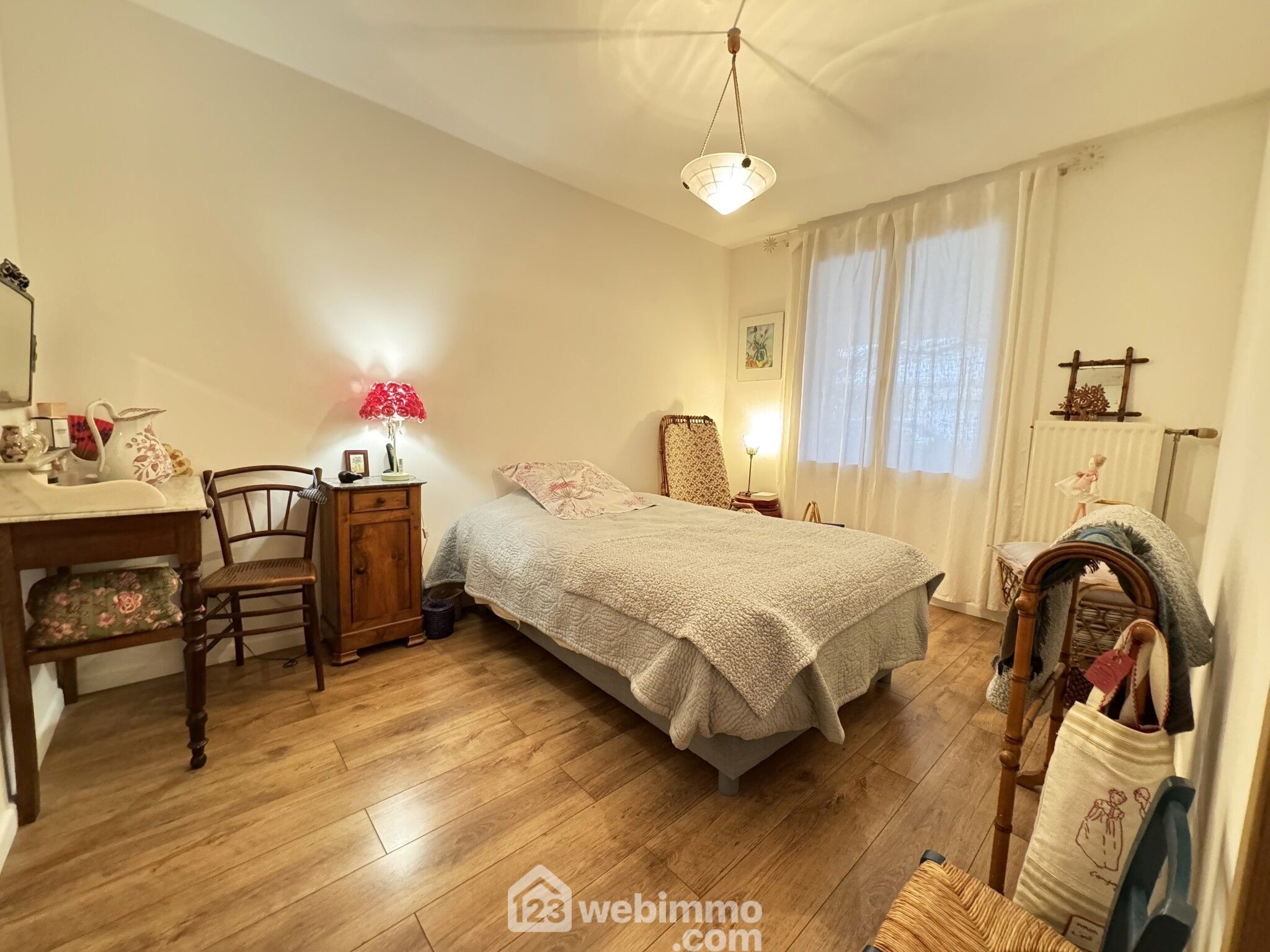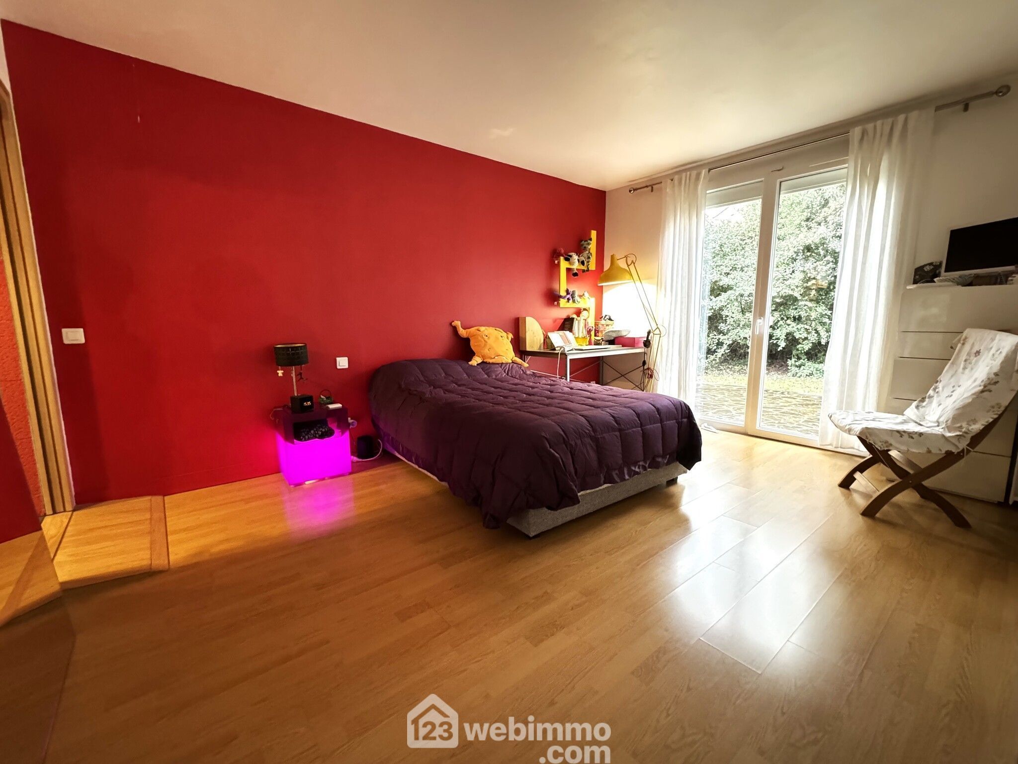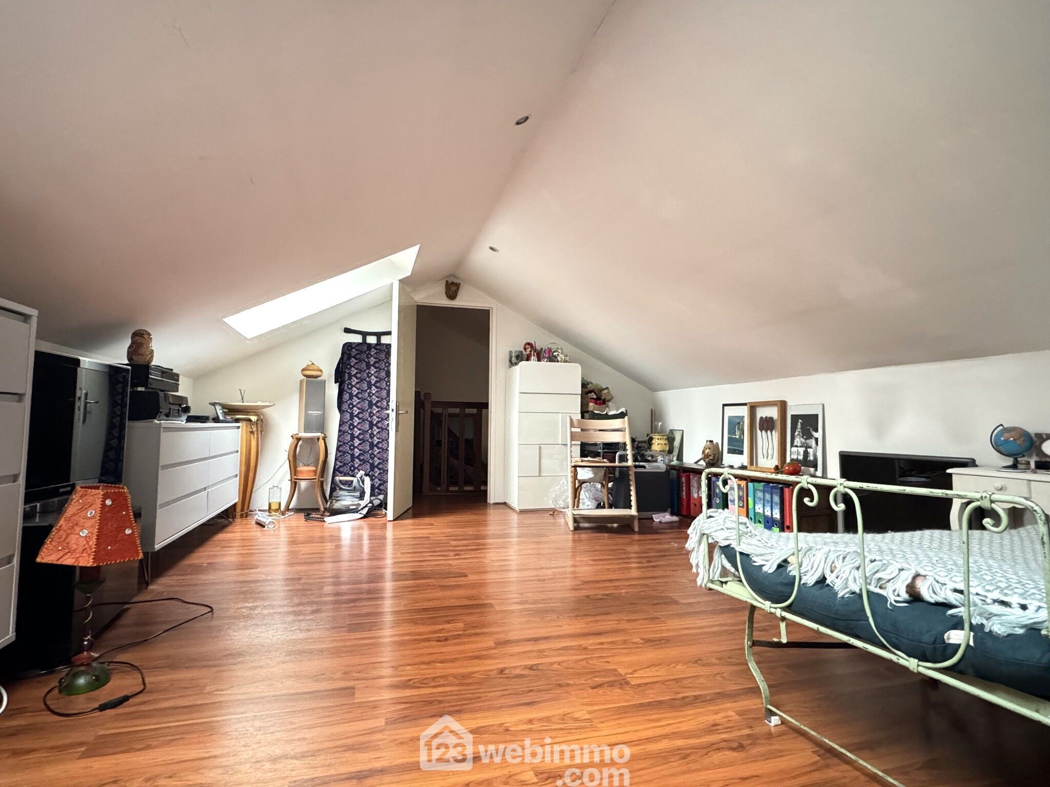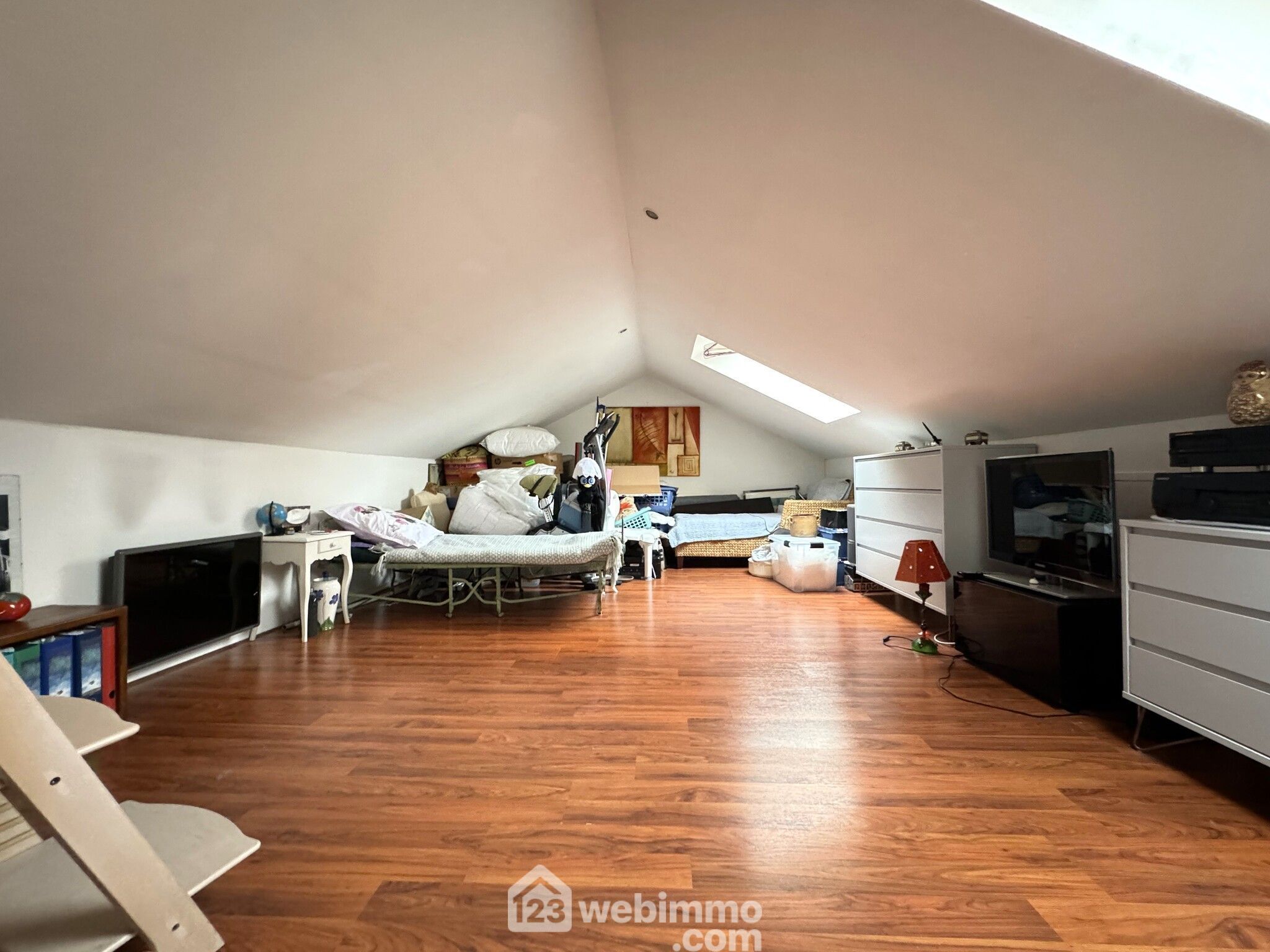 À l'étage, découvrez une charmante chambre dans les combles, d'environ 20m², éclairée par deux velux avec volets électriques, offrant un espace privé et cosy.